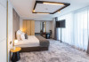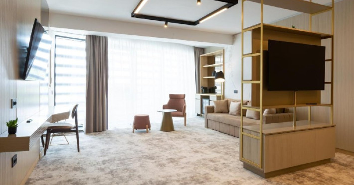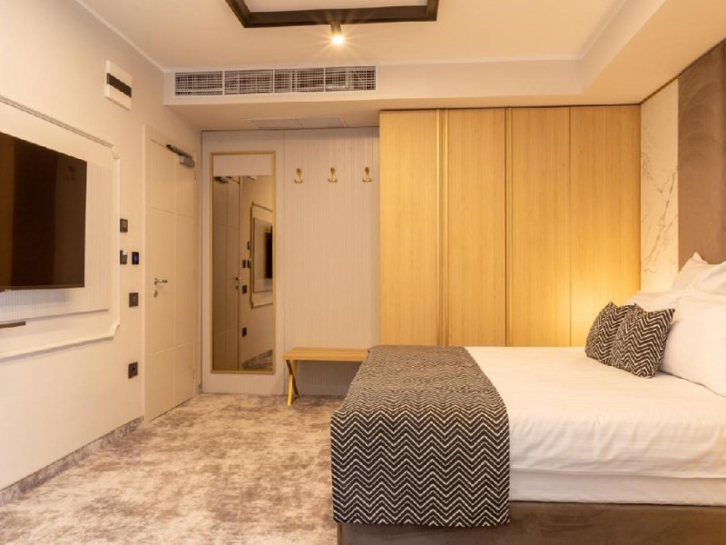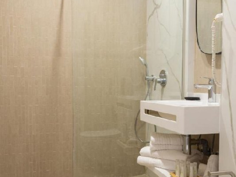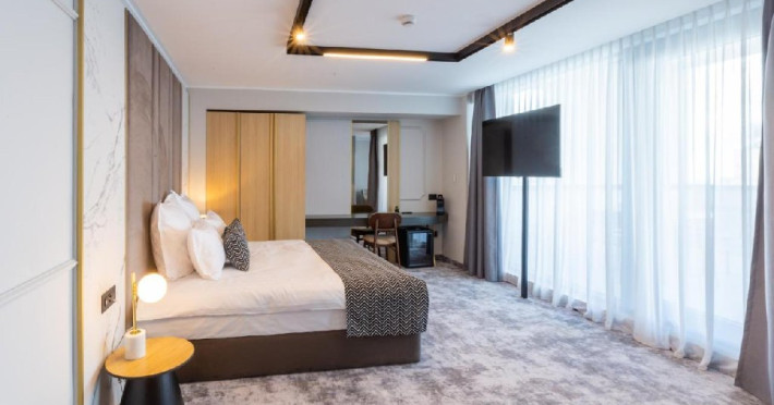 Dotari camere Camerele duble business dispun de pat matrimonial (180x200), sistem de climatizare, LCD tv, internet wireless, seif, minibar (continut contra cost), baie cu dus walk in, uscator de par, cosmetice hoteliere, halat si papuci, aparat de cafea. Suprafata 20 mp. Camerele duble premium dispun de pat matrimonial (180x200), sistem de climatizare, LCD tv, internet wireless, seif, minibar (continut contra cost), baie cu dus walk in, uscator de par, cosmetice hoteliere, halat si papuci, aparat de cafea. O parte din camere dispun de balcon mic, frantuzesc. Repartizarea camerelor se face la receptie in functie de disponibilitatea de la momentul cazarii. Suprafata 30 mp. Camerele duble executive dispun de pat matrimonial (180x200), sistem de climatizare, LCD tv, internet wireless, seif, minibar (continut contra cost), baie cu dus walk in, uscator de par, cosmetice hoteliere, halat si papuci, aparat de cafea. Sunt situate la etajul 4 si au terase generoase. Suprafata 40 mp. Suitele deluxe dispun de un open space dotat cu pat matrimonial (180x200), o zona de living cu canapea extensibila (pentru 2 copii), sistem de climatizare, 2 LCD tv-uri (unul la zona de dormit, unul la zona de living) , internet wireless, seif, minibar (continut contra cost), baie cu dus walk in, uscator de par, cosmetice hoteliere, halat si papuci, aparat de cafea. Sunt situate cate una pe etaj. Suprafata 50 mp. Patul suplimentar este de tip pliant. Repartizarea camerelor se face la receptie in functie de disponibilitatea de la momentul cazarii. Facilitati copii