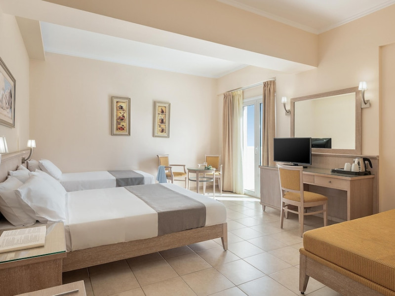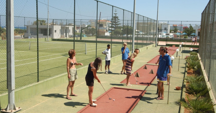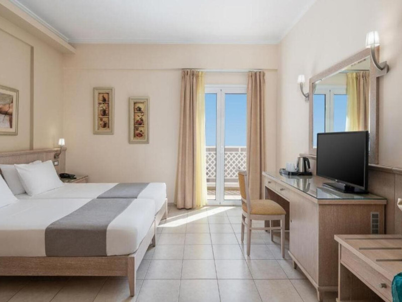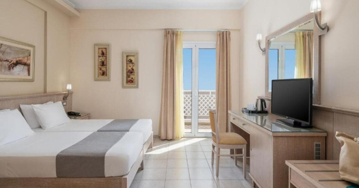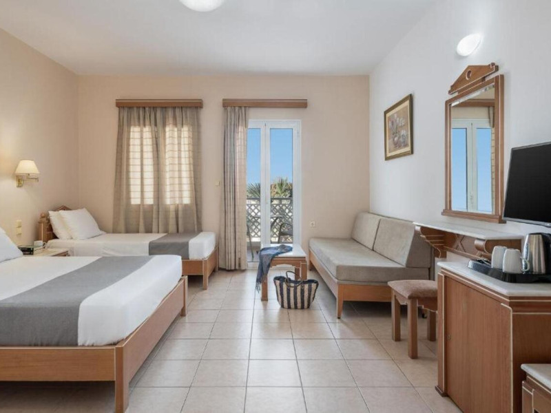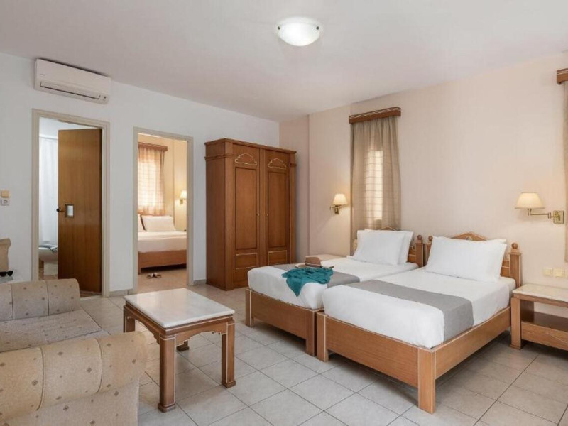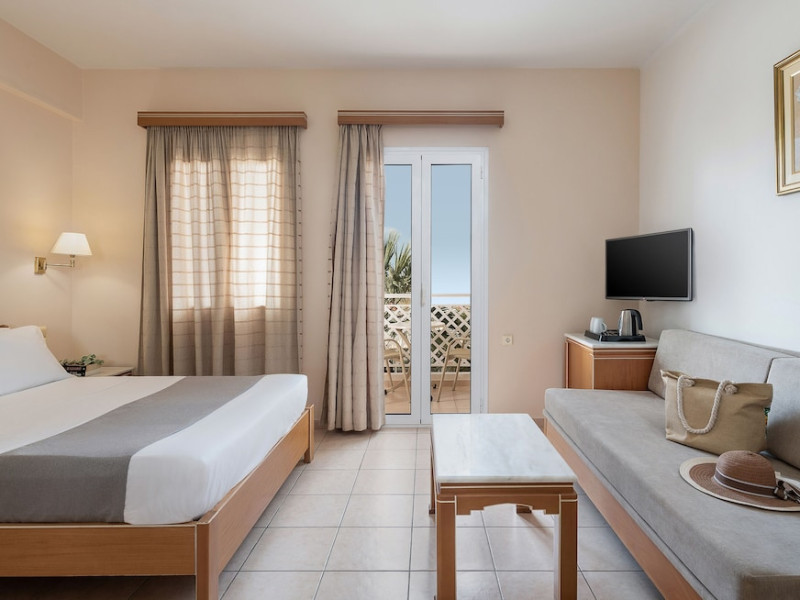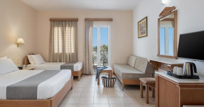 Hotel services and facilities include 24-hour reception, luggage room, meeting room, restaurants, bars, souvenir shops and supermarket, TV corner, swimming pool, children's pool and playground, babysitting (extra charge), indoor pool, terrace, garden, Spa facilities with Jacuzzi and sauna (extra charge), Gym, car parking, Wi-Fi, concierge services, business center, breakfast room, medical service (extra charge), currency exchange (extra charge), room service (extra charge).Rooms feature air conditioning, Wi-Fi, safe (extra charge), satellite TV, balcony / terrace, coffee / tea maker, hairdryer, telephone, laundry and dry cleaning service (extra charge), mini bar / fridge, baby cot on request. **Air conditioning is working from June to September.**Please note that some facilities may be closed due to weather / seasonal conditions.**The All Inclusive-concept includes all meals (breakfast, lunch, dinner and snacks) and mealtime drinks such as soft drinks, beer, wine, water and alcoholic drinks, all of local brands. Drinks are served from morning until late evening (approx until 22.-24.00 hrs). Opening times vary between different hotels. In certain hotels the activities program is also included.**Address: Gouves, 70014 Heraklion-Gouves, Crete, Greece