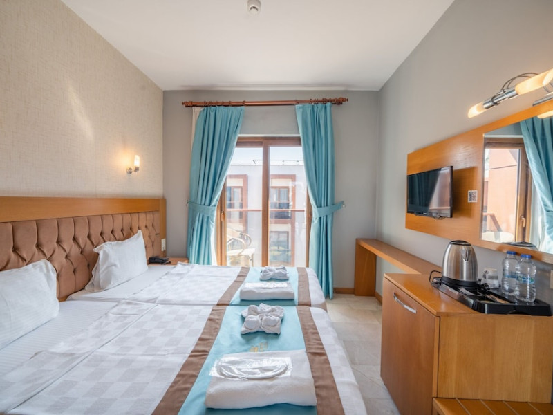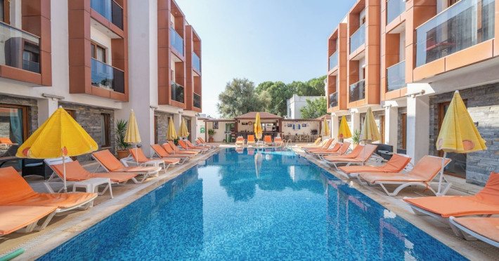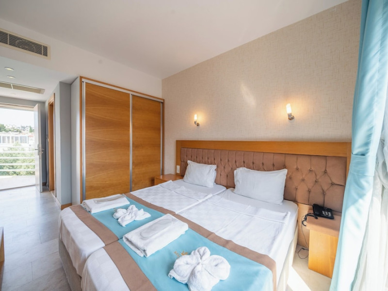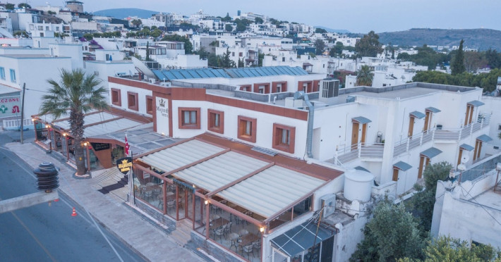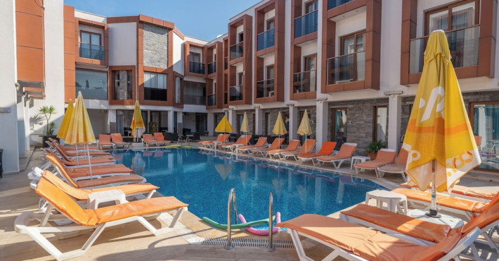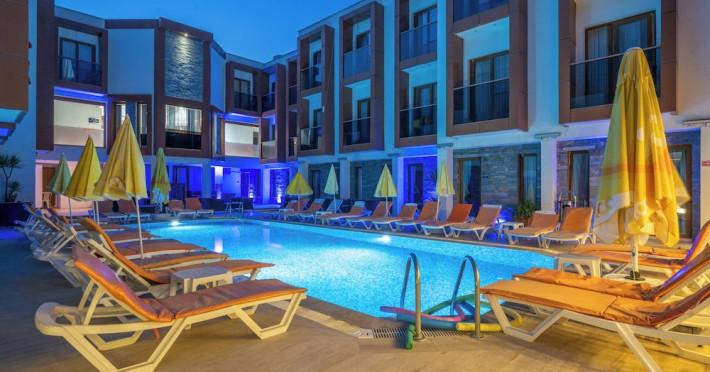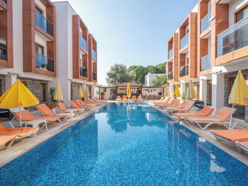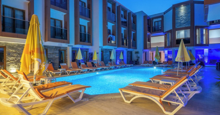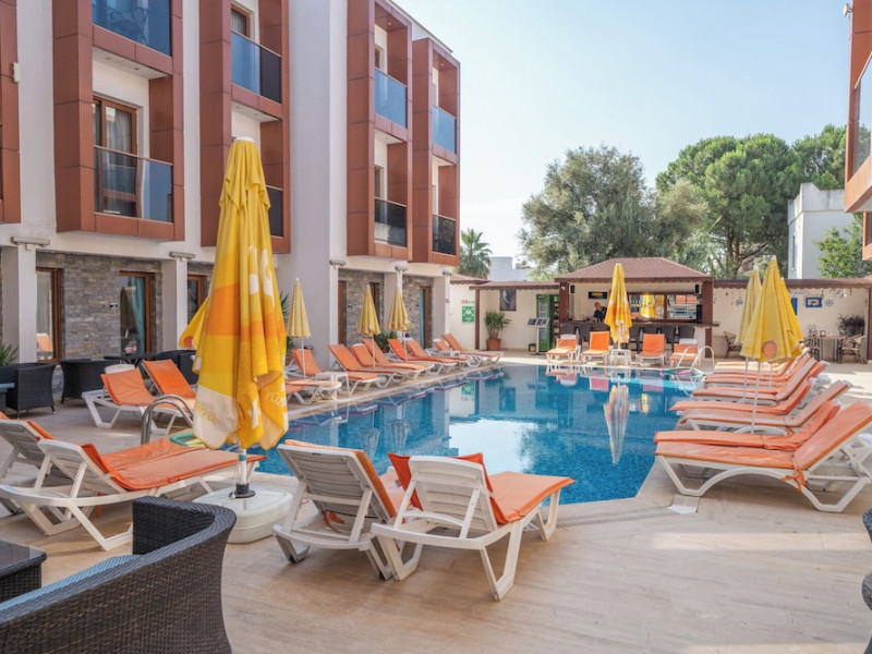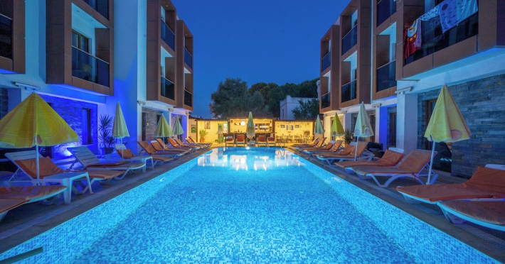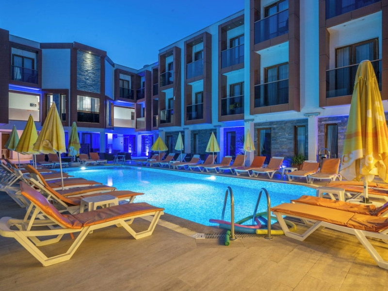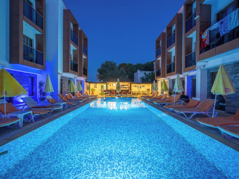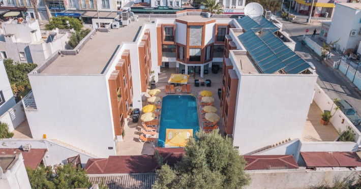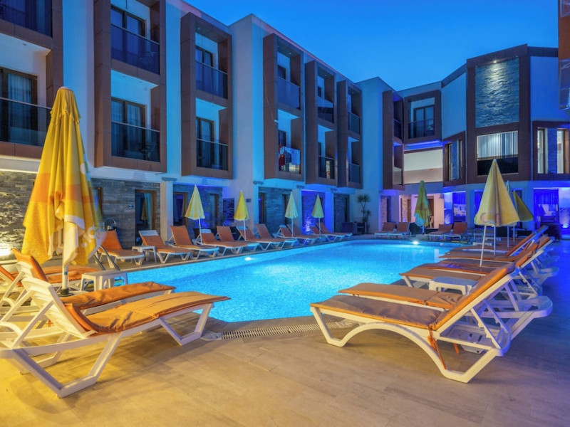 This modernly designed hotel enjoys a great location close to the centre of Gumbet, popular for it's nightlife, and approximately 3 km from the cosmopolitan resort of Bodrum. Tastefully furnished and styled, guests can benefit from an on-site outdoor pool and sun-bathing terrace and enjoy a meal in the hotel's street-side restaurant. The rooms are modernly equipped and decorated with muted tones and bright turquoise to give a 'summery' touch. Close to a host of amenities such as shops, cafe-bars, resataurants and nightclubs, the beach is also just a couple of minutes' walk and there is a bus stop within a few metres of the hotel entrance, enabling easy access to Bodrum and nearby Bitez.