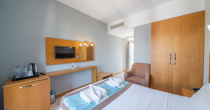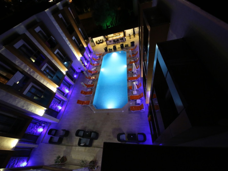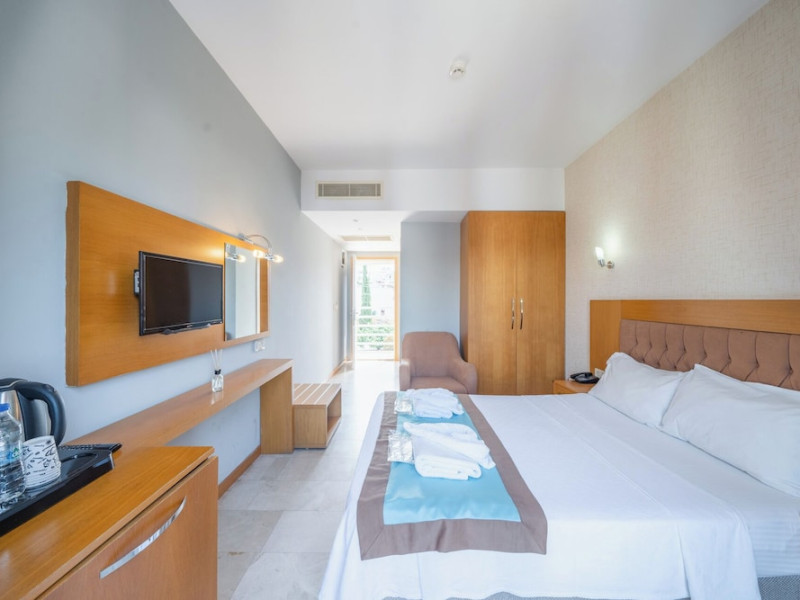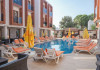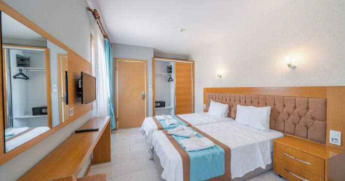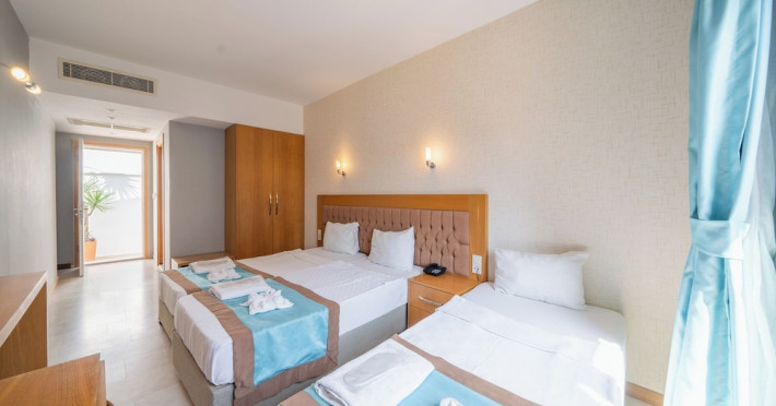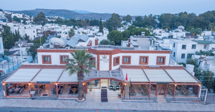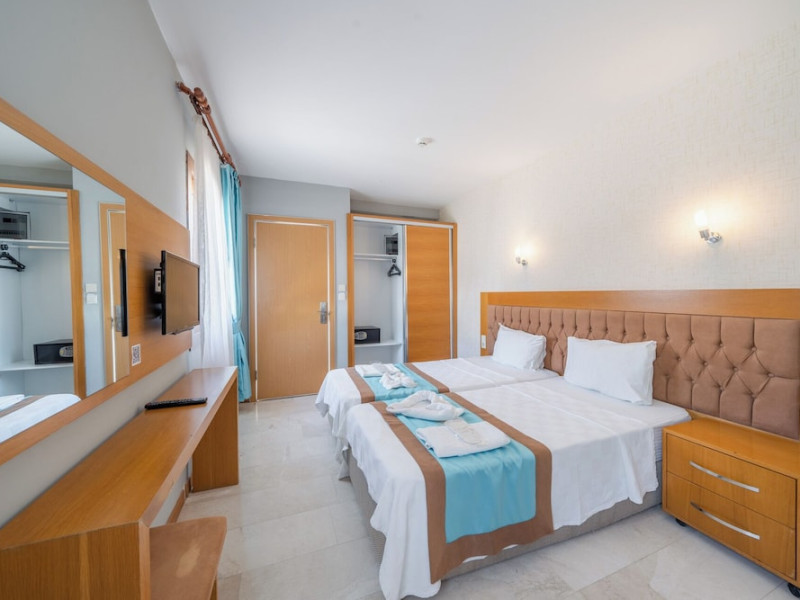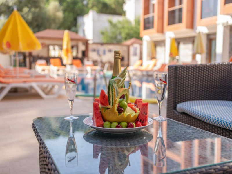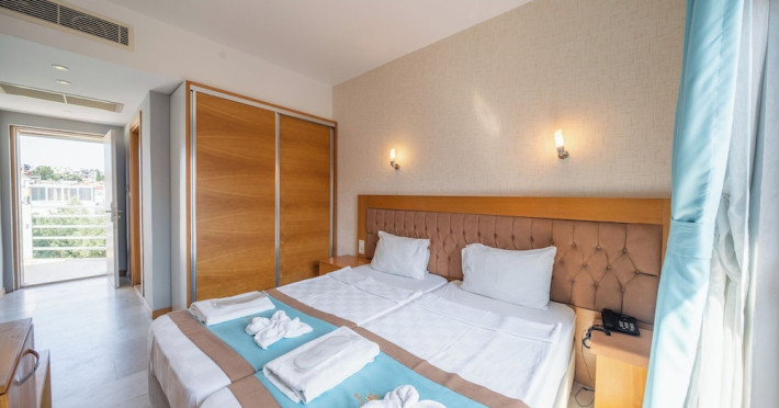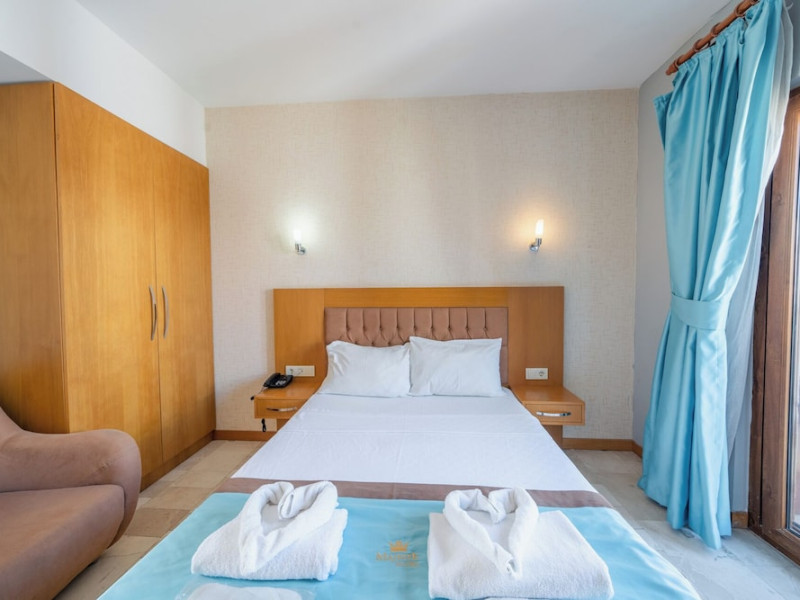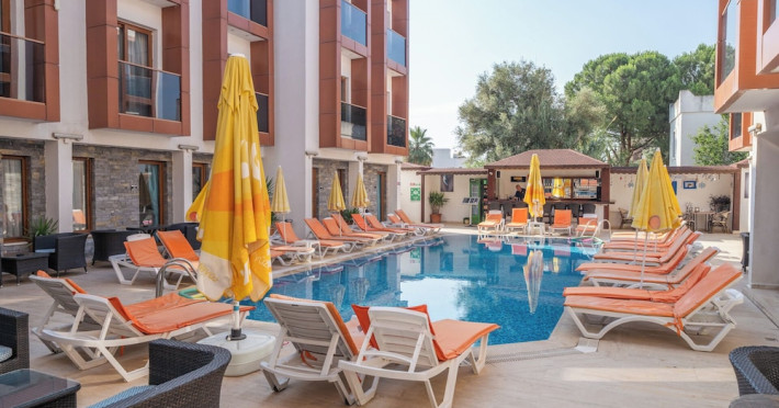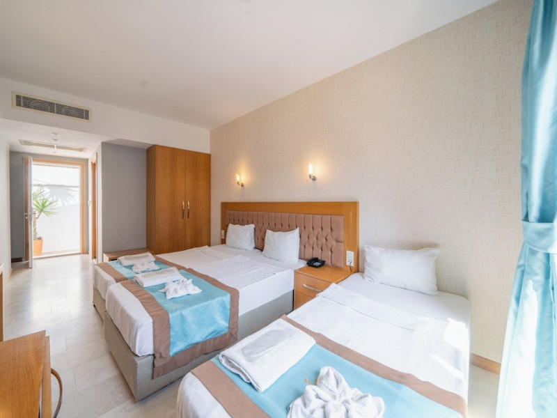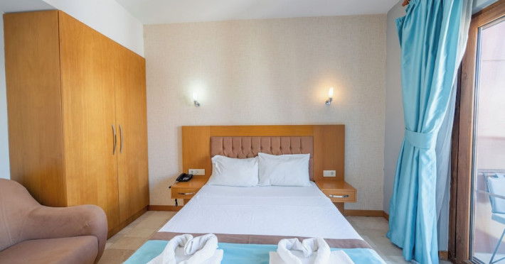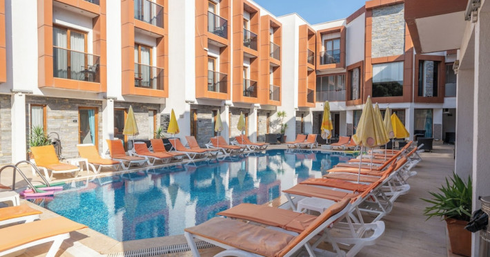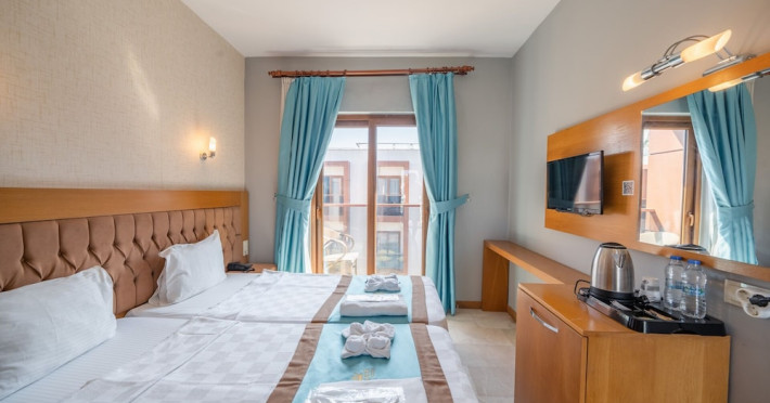 This modernly designed hotel enjoys a great location close to the centre of Gumbet, popular for it's nightlife, and approximately 3 km from the cosmopolitan resort of Bodrum. Tastefully furnished and styled, guests can benefit from an on-site outdoor pool and sun-bathing terrace and enjoy a meal in the hotel's street-side restaurant. The rooms are modernly equipped and decorated with muted tones and bright turquoise to give a 'summery' touch. Close to a host of amenities such as shops, cafe-bars, resataurants and nightclubs, the beach is also just a couple of minutes' walk and there is a bus stop within a few metres of the hotel entrance, enabling easy access to Bodrum and nearby Bitez.