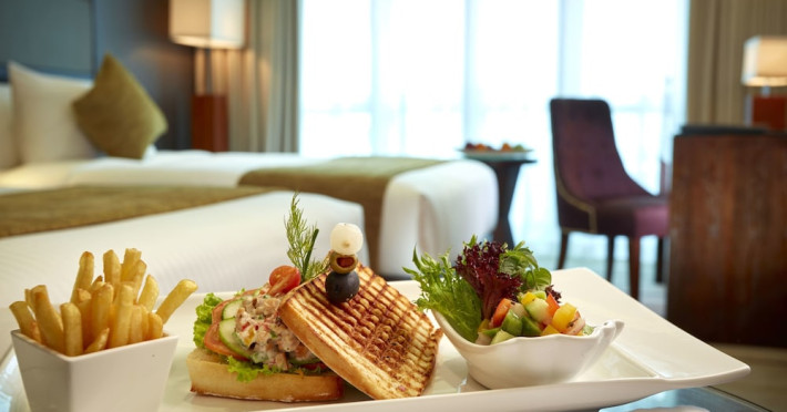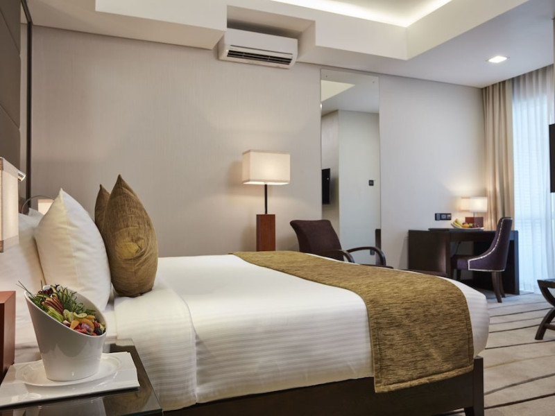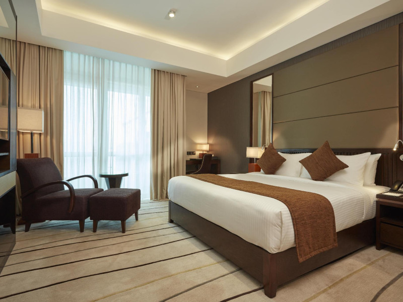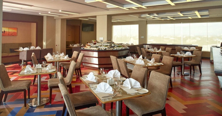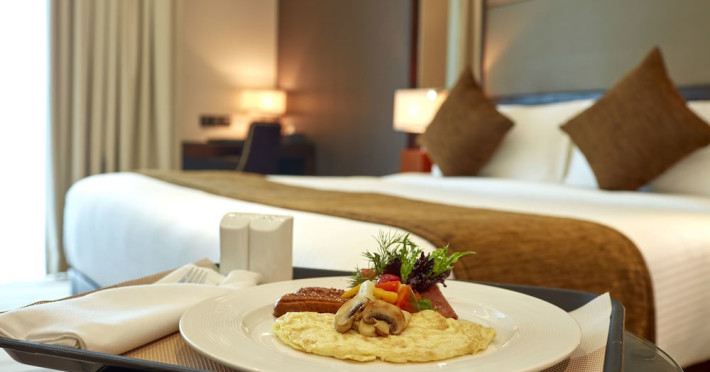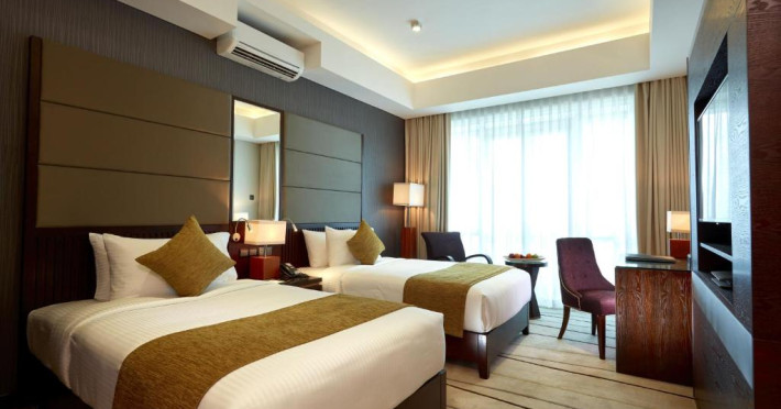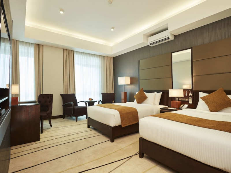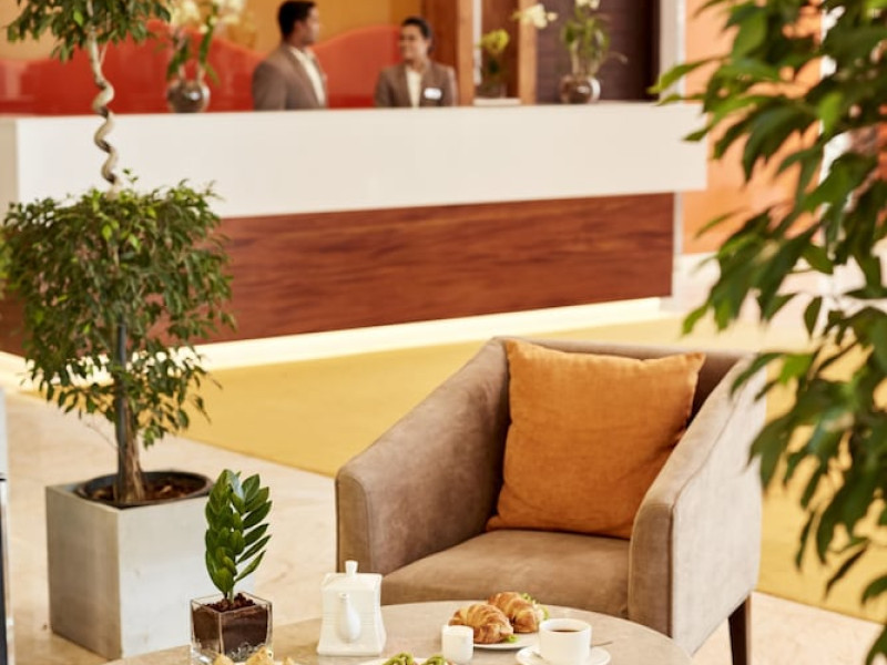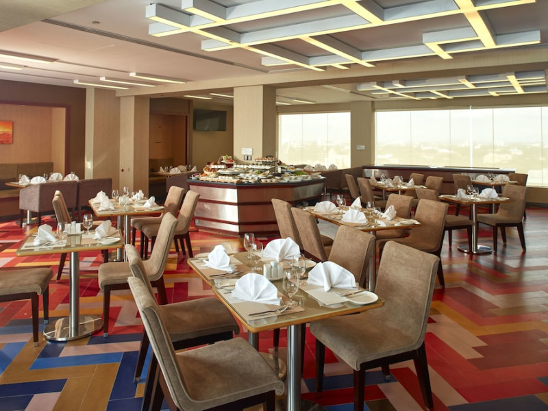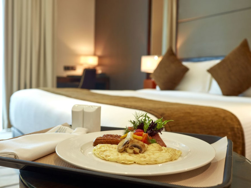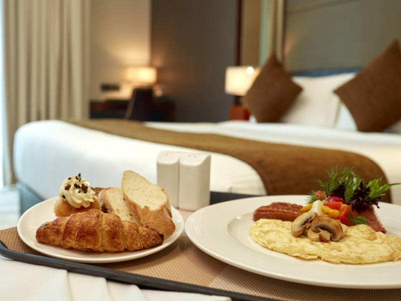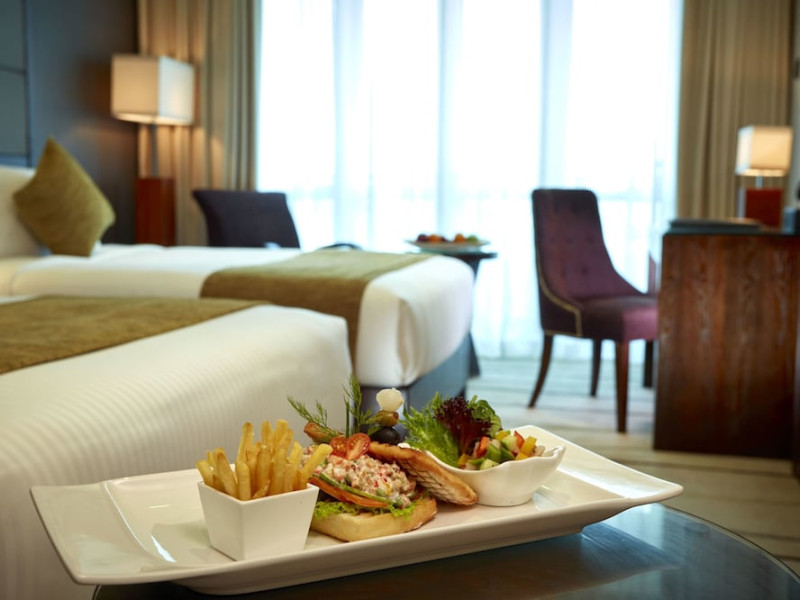 The hotel operates a 24-hour front desk offering car rental, currency exchange, and laundry services. Dining options include an in-house restaurant (On The Eleventh) serving international dishes and a coffee shop (Café M) serving snacks, tea, and coffee.