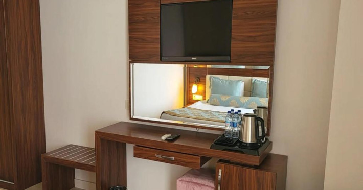 baie cu cadă / duș, uscător de păr, halate de baie și papuci, produse de igienă, aer condiționat, seif, mini-bar, TV, telefon, acces internet Wi-Fi, balcon.