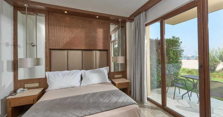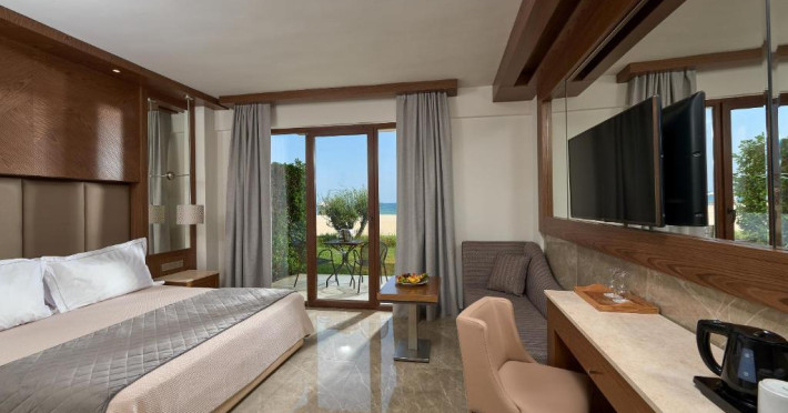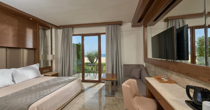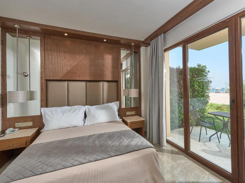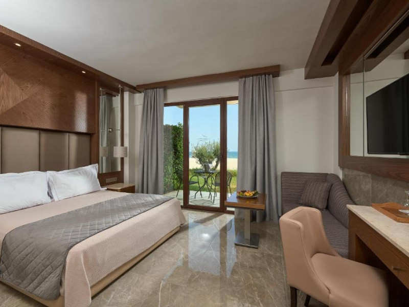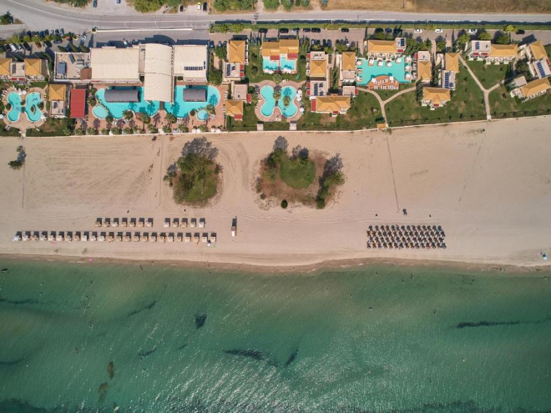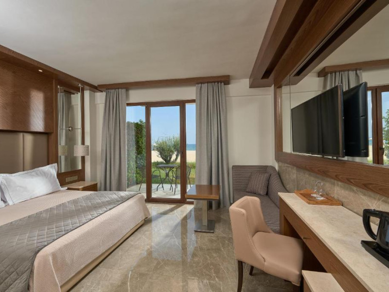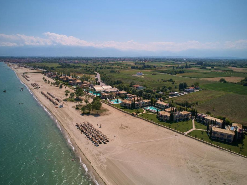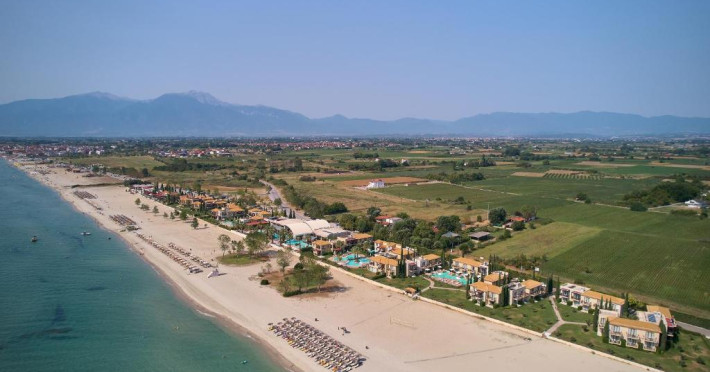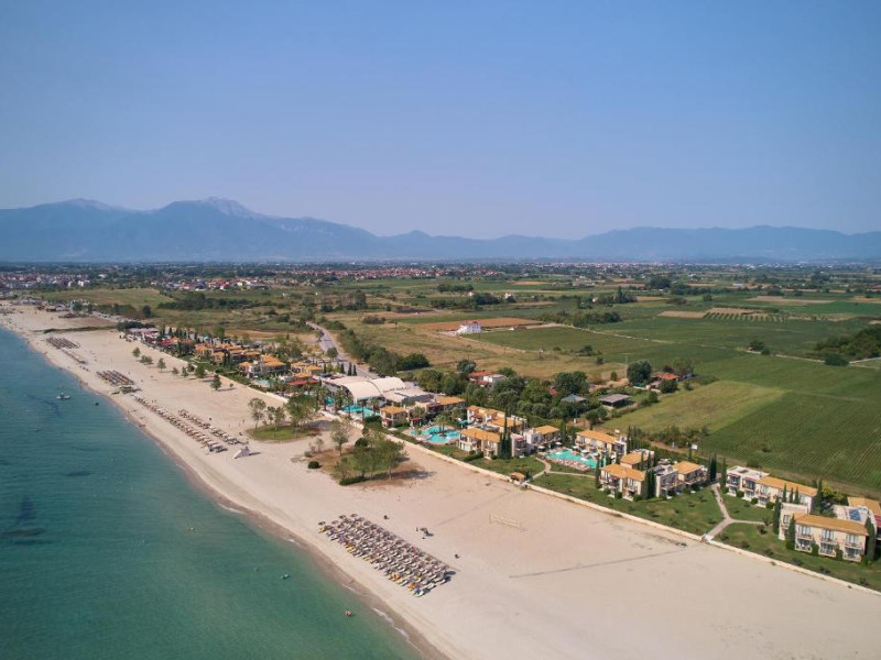 Complexul dispune de plajă privată amenajată cu șezlonguri și umbrele, bar pe plajă, precum și facilități pentru copii, inclusiv piscină dedicată și loc de joacă. Poziționarea excelentă permite accesul facil la zona comercială din Paralia Katerini, iar Muntele Olimp se află la doar 20 km distanță.
