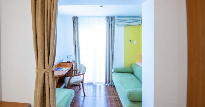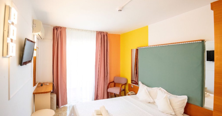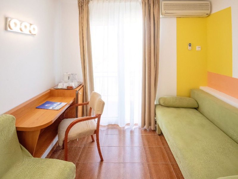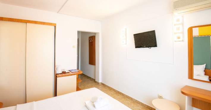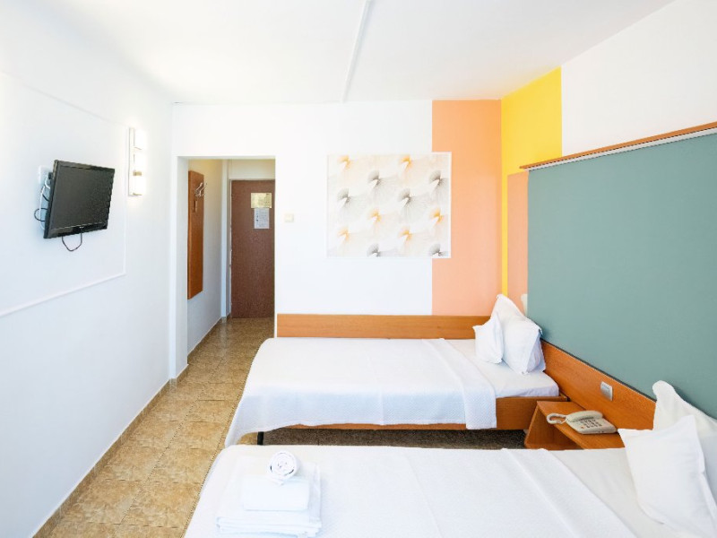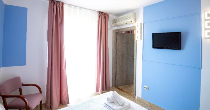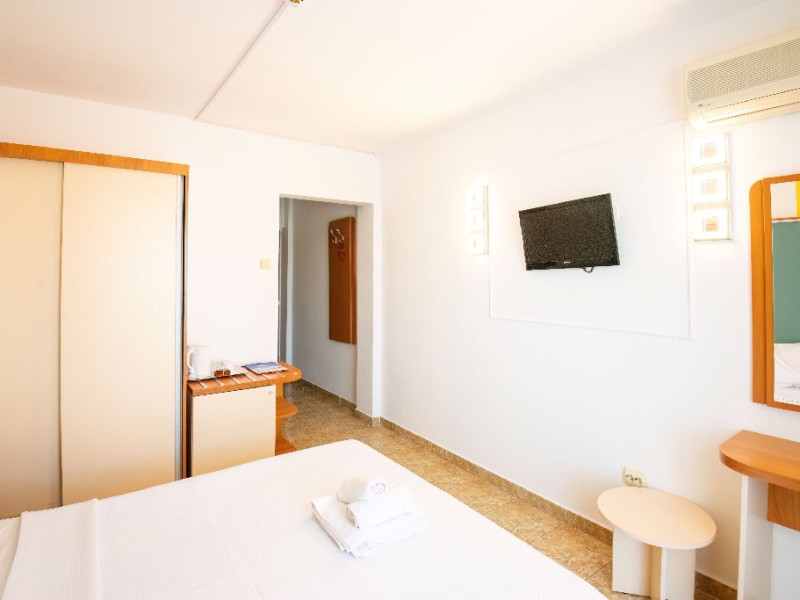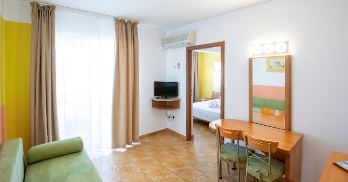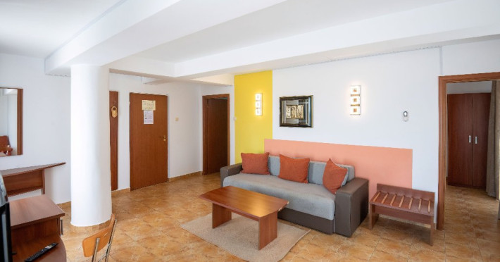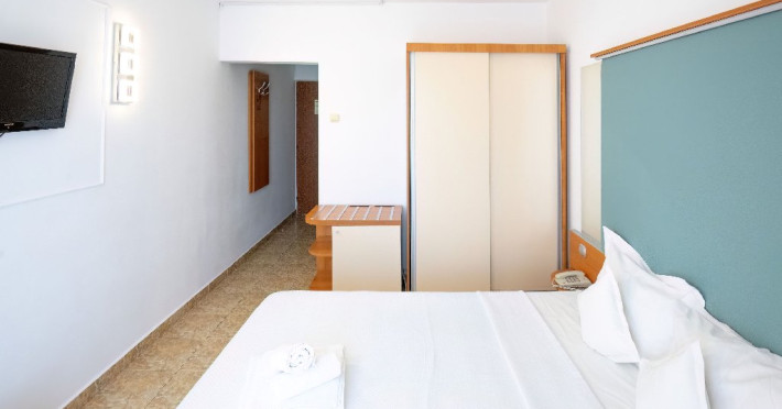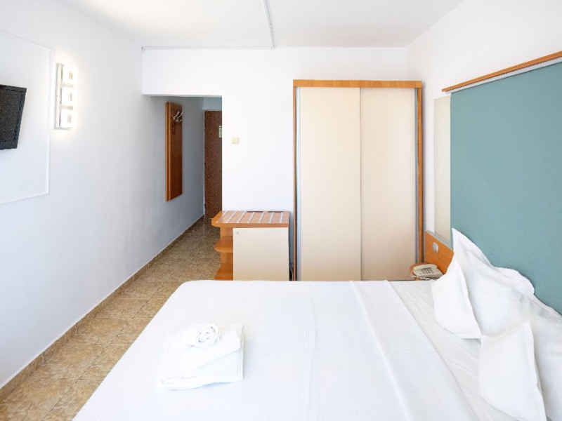 Dotari camere: Camerele sunt dotate cu AC, TV, minibar (contra cost), internet, telefon, seif, uscator de par, balcon. Camerele duble 3* - sunt dotate cu pat matrimonial sau twin, TV, internet, balcon, AC si racitor. Capacitate maxima: 2 adulti + 1 copil (0 - 11,99 ani). In aceasta camera nu se poate pune pat suplimentar. Superior Family (fostele camere superioare): este un singur spatiu de cazare, cu pat matrimonial, canapea extensibila, TV, internet, balcon, AC si racitor ; intre zona cu pat si zona cu canapea exista o perdea separatoare. Capacitate maxima: 3 adulti si 1 copil de maxim 11.99 ani sau 2 adulti + 2 copii (0-17.99 ani). Apartamentele - au living si dormitor, pat matrimonial si canapea extensibila, cu usa intre cele doua spatii, TV in fiecare camera, internet, balcon, o singura baie, AC in living si racitor. Capacitate maxima: 4 adulti sau 3 adulti sau 2 adulti + 1 copil max 18 ani sau 2 adulti + 2 copii (0-17.99 ani). Apartamentele superior vedere panoramica- au living si dormitor, pat matrimonial si canapea extensibila, cu usa intre cele doua spatii, TV in fiecare camera, internet, balcon,o baie, AC in fiecare camera, si racitor. Livingul are o vedere panoramica, superba, catre mare. Capacitate maxima: 4 adulti sau 3 adulti sau 2 adulti + 1 copil max 18 ani sau 2 adulti + 2 copii (0-17.99 ani).