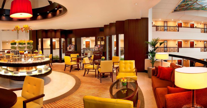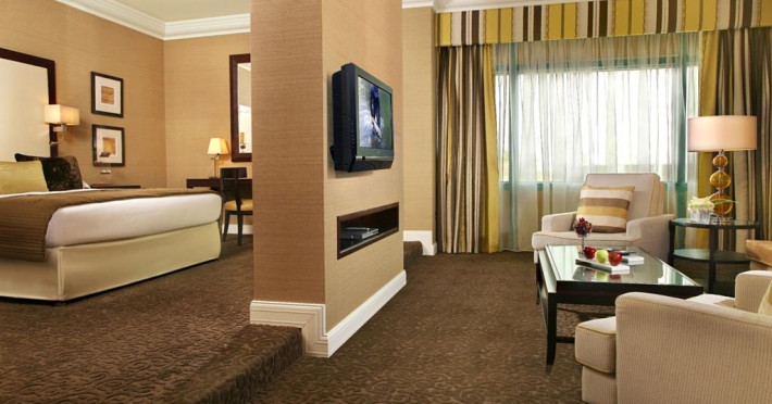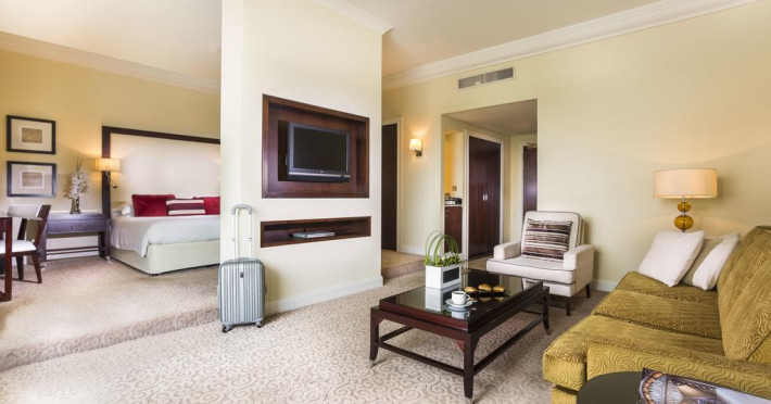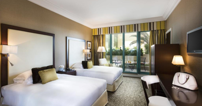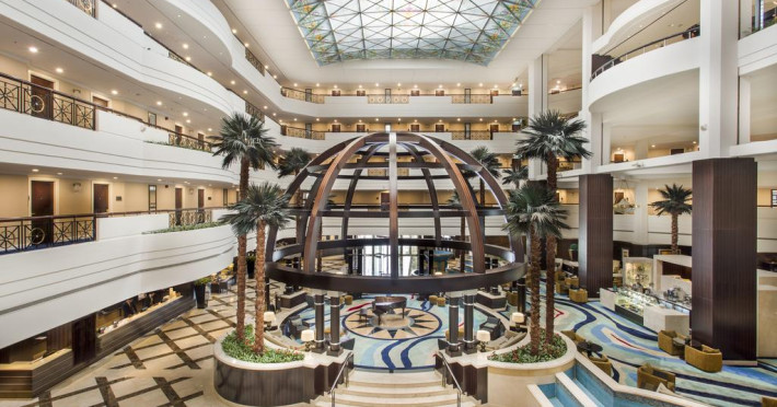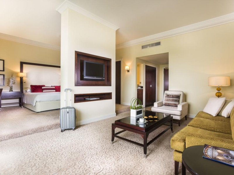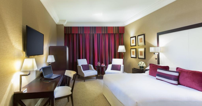 Mövenpick Grand Al Bustan se află la 1 km de Aeroportul Internațional Dubai, oferind unități de cazare moderne și luxoase și 7 restaurante care servesc diferite preparate culinare. Oferă o piscină în aer liber cu temperatură controlată, o piscină pentru copii, terenuri de squash, terenuri de tenis și tratamente spa extinse.