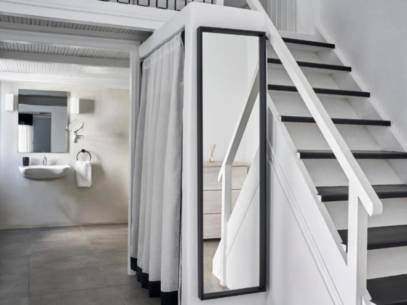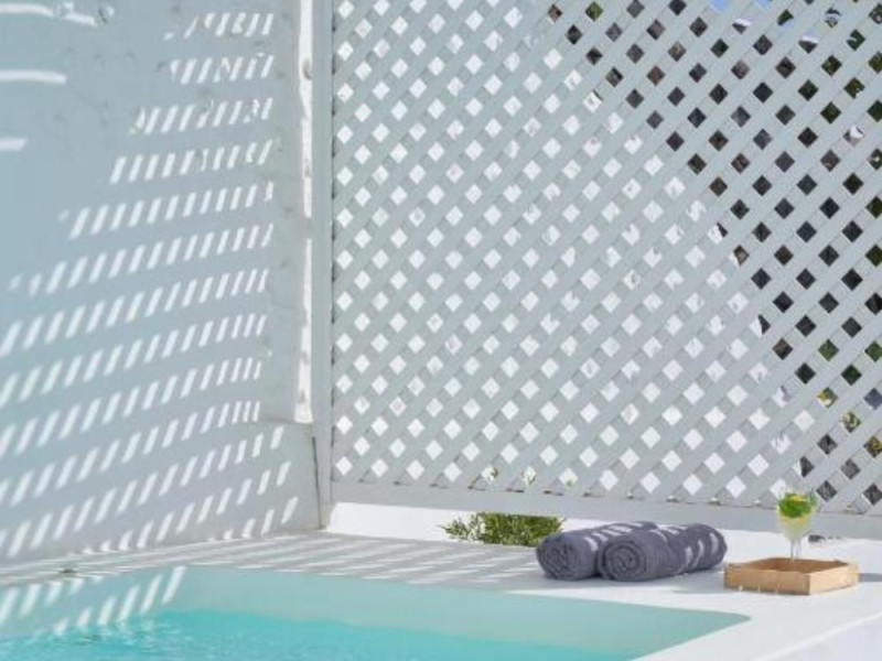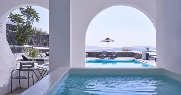 Mr & Mrs White Oia - Santorini is situated in the outskirts of the famous village of Oia, on the edge of the Caldera cliff, facing the volcano islands and the Caldera gulf.