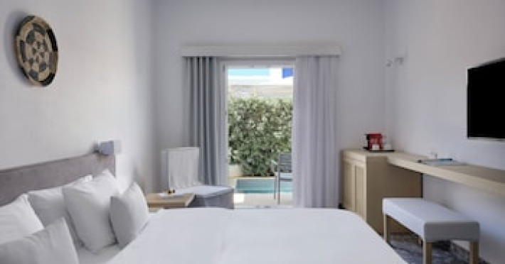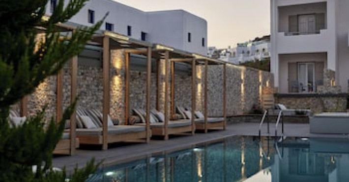 Property Location When you stay at Kosmoplaz Beach Hotel in Mykonos, you'll be on the beach, a 1-minute drive from Platis Gialos Beach and 6 minutes from Paradise Beach. This beach hotel is 4.6 mi (7.5 km) from Mykonos New Port and 3.2 mi (5.2 km) from Mykonos Old Port.