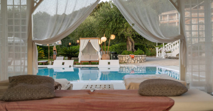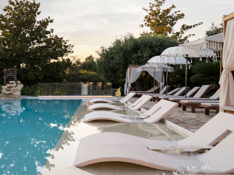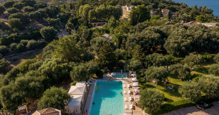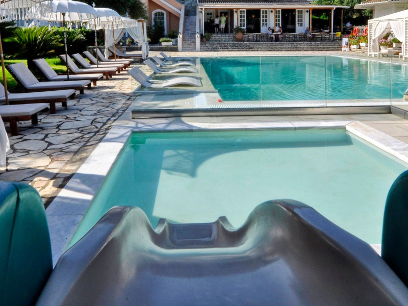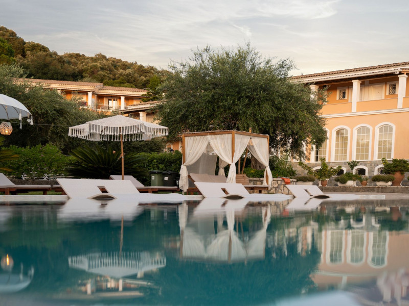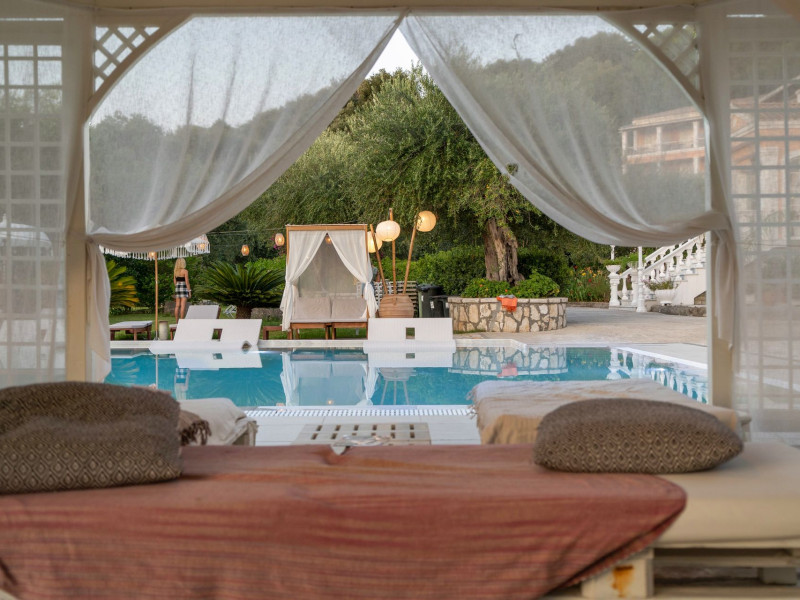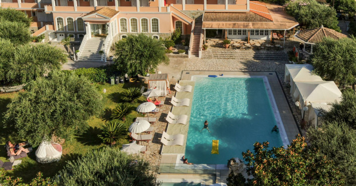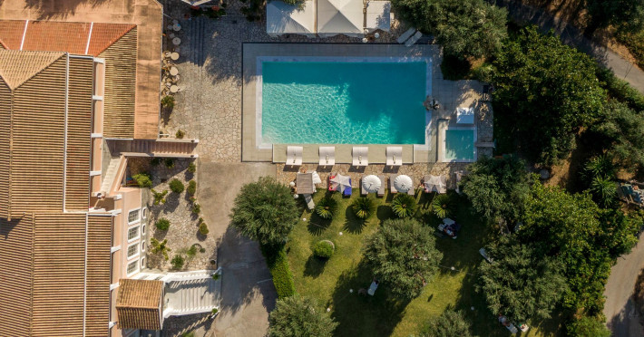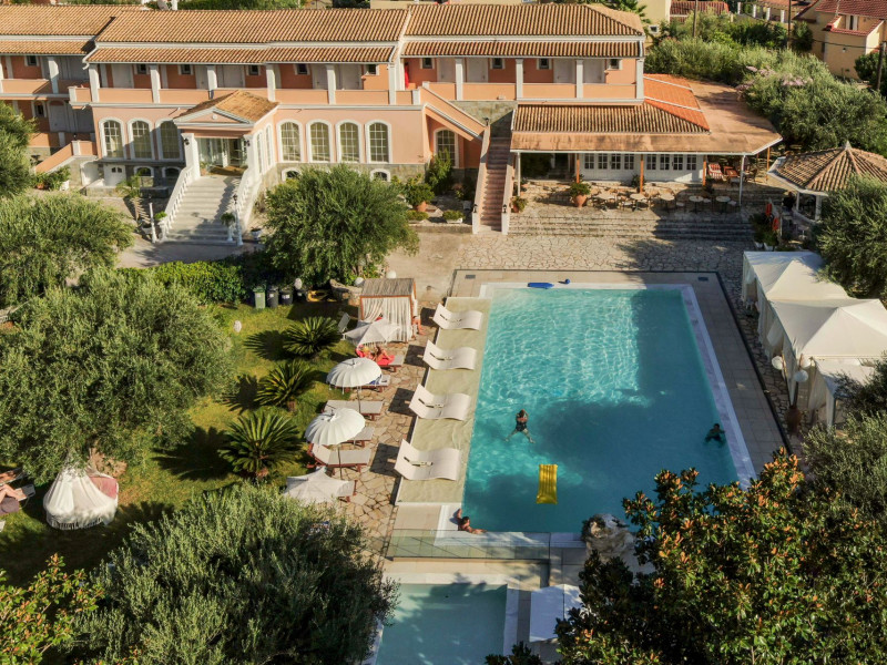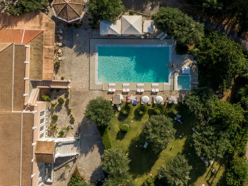 WELCOME TO NEFELI HOTELDesigned as a typical Corfiot Mansion and set on Kommeno Hill, about 12km north of Corfu town, Nefeli Hotel creates an air of relaxation and tranquility in a perfect setting surrounded by colorful gardens, palms, and wooded green groves.Nefeli Hotel has an outdoor pool with sun loungers and daybeds, surrounded by olive trees & tropical plants, and a pool bar where you can enjoy coffee, ice cream, and refreshing cocktails in the shade of large pergolas.Glorious views of the crystal-clear waters of the Ionian Sea and Corfiot landscape come as standard at Nefeli Hotel. Yet it is just a 20-minute drive to the mesmerizing historical center of Corfu Town and only 800 meters distance to the next sandy beach.The charming 45 rooms of Nefeli Hotel come all in an individual design and style, some of them including cinematic panoramic landscape views.