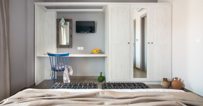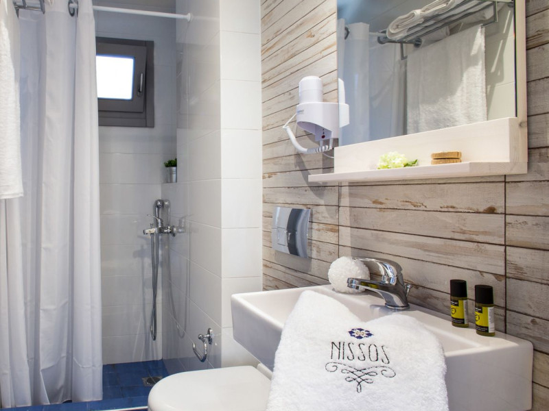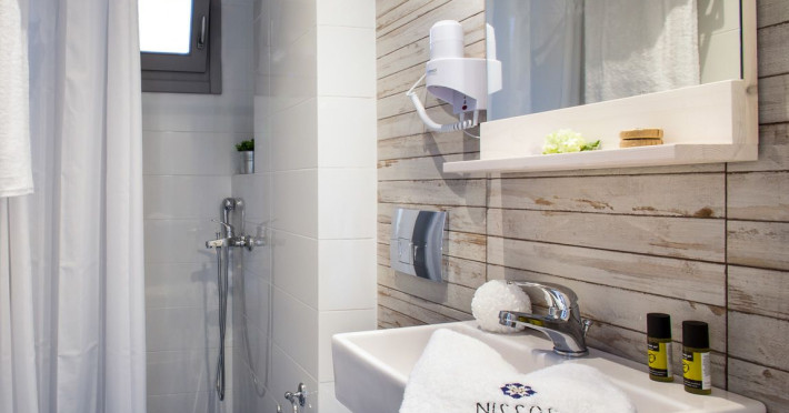 Five out of the nine available rooms have sea-view that makes the stay of our guests memorable. Nissos rooms offer double and triple rooms, fully furnished, with amenities such as air-condition, led TV, hair bath, care accessories, free Wi-Fi, safe, large private balcony, refrigerator etc.Moreover, for the easier mobility of our guests, an elevator is also available.