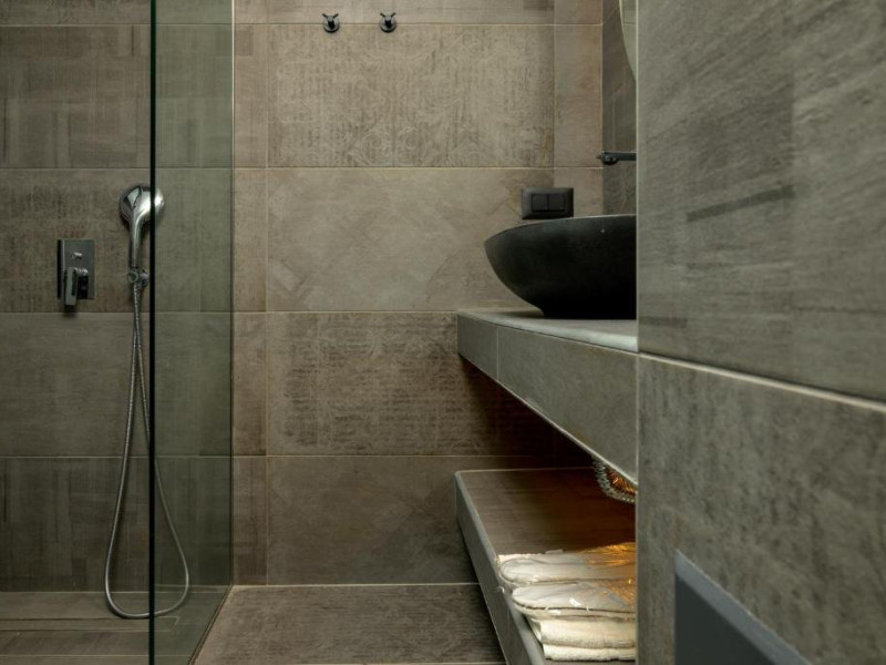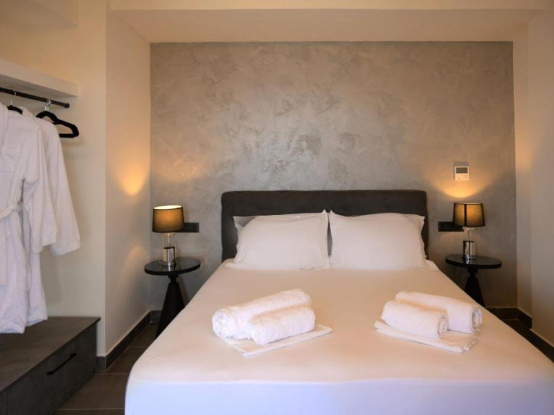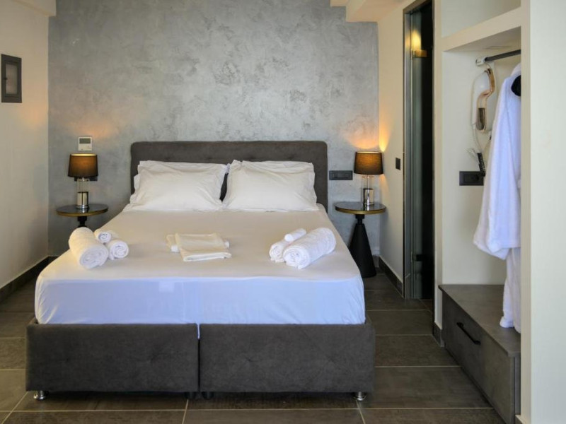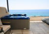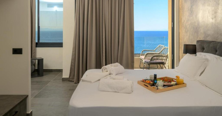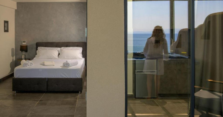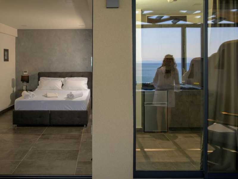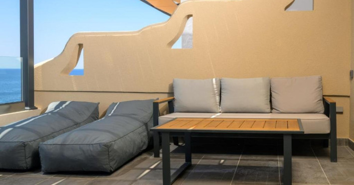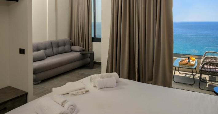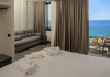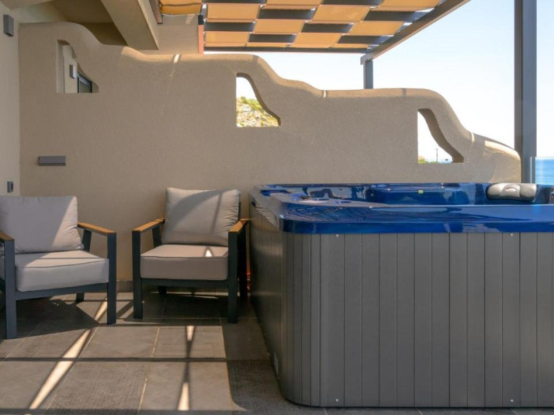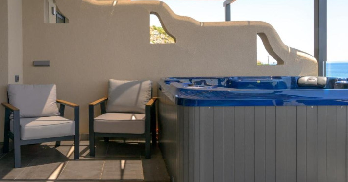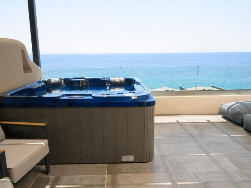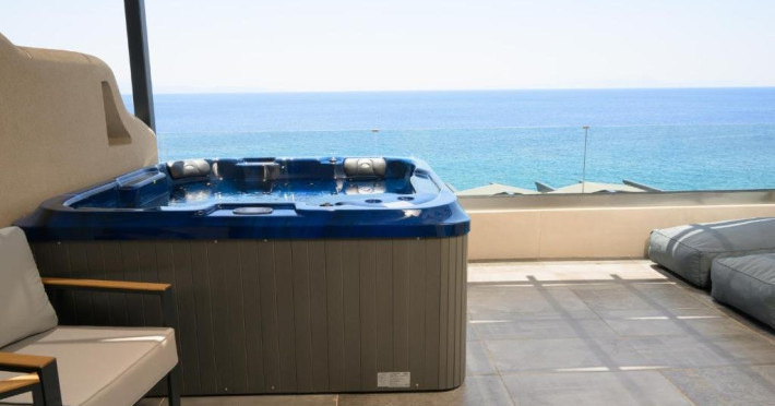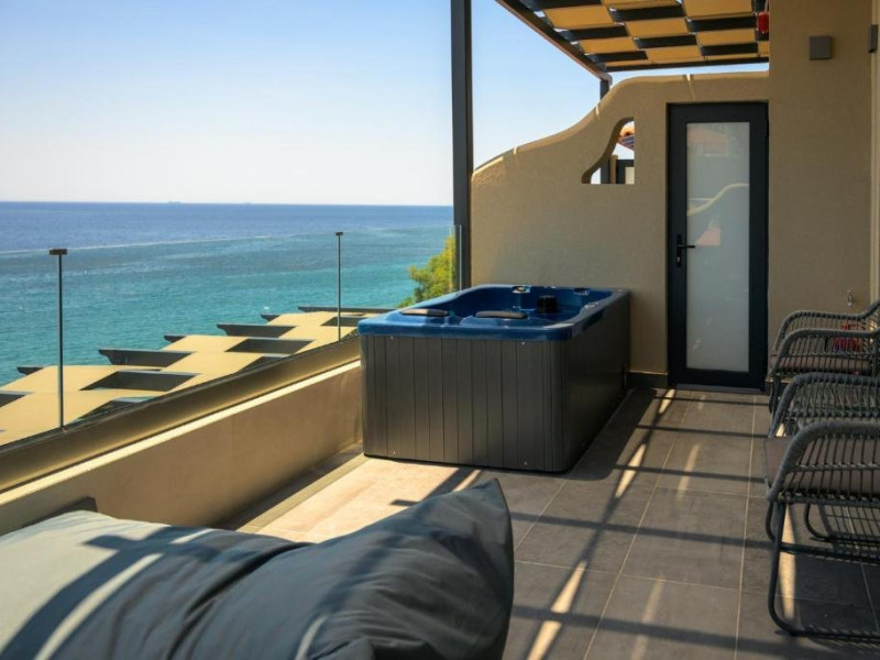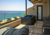 Double Studio Large Balcony Sea View with Jacuzzi ofera aceleasi facilitati ca studioul standard, dar beneficiaza de o terasa mult mai spatioasa, mobila de exterior si jacuzzi privat. Aceasta unitate este potrivita pentru cupluri care isi doresc mai mult confort si un spatiu exterior generos, cu vedere directa la mare si posibilitatea de relaxare in jacuzzi.