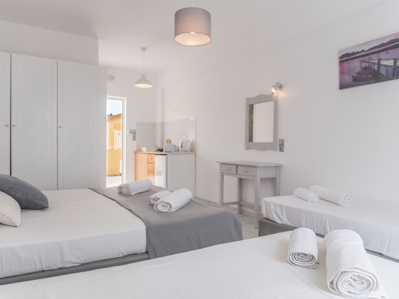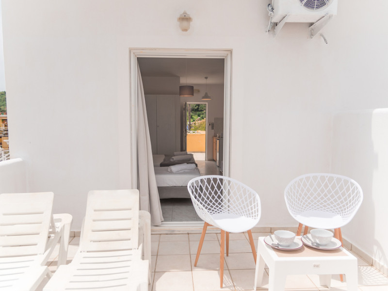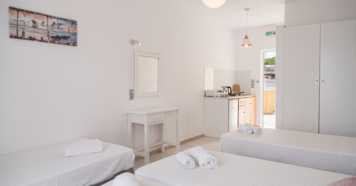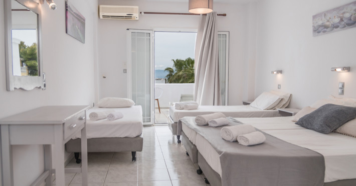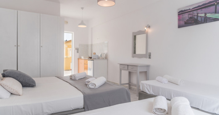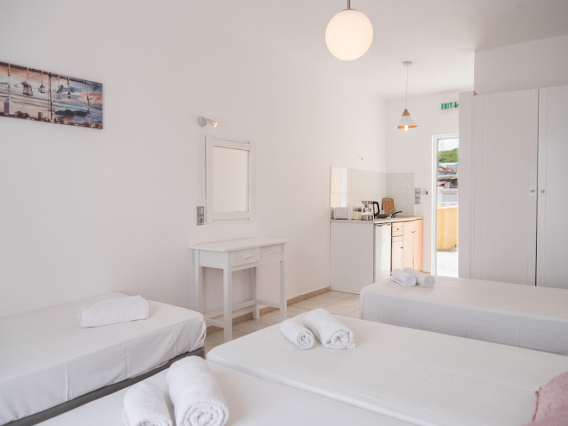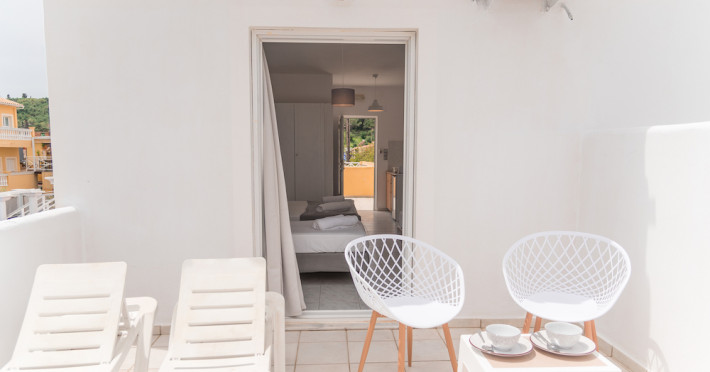 Wake up to the stunning views of the sparkling Ionian Sea, while having your coffee on the sun loungers of our king-size balconies. All units of the hotel dispose of free wifi, kitchenettes with cooking equipment, as well as private balconies with sun loungers and chairs. In a fantastic 35 sq.meters space, our Superior Apartments sleep up to 4 people and are a great option for families or for groups of friends. The sea views from their balconies is the top point. Our Standard Triple Apartments are a simple solution yet comfortable and with all the facilities you need.