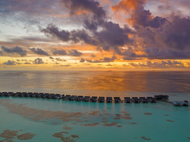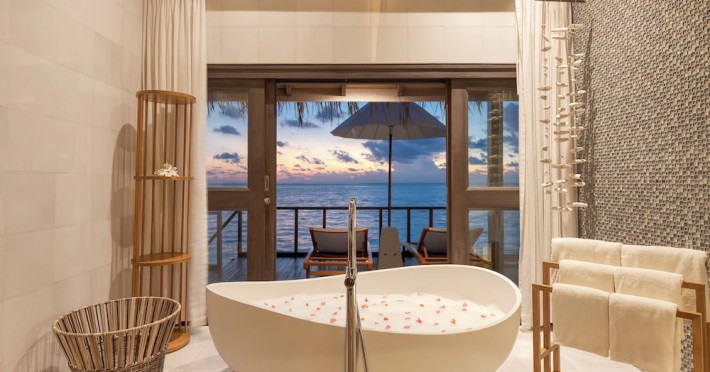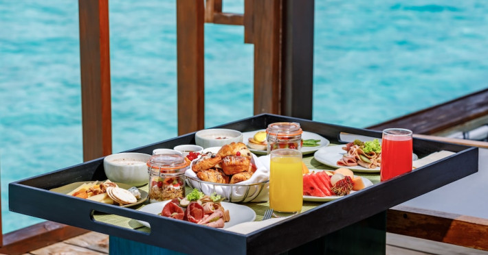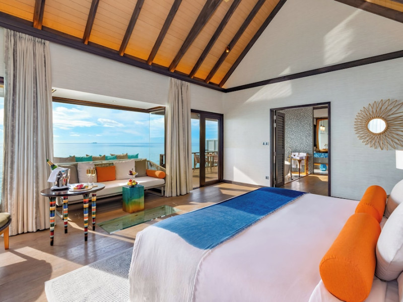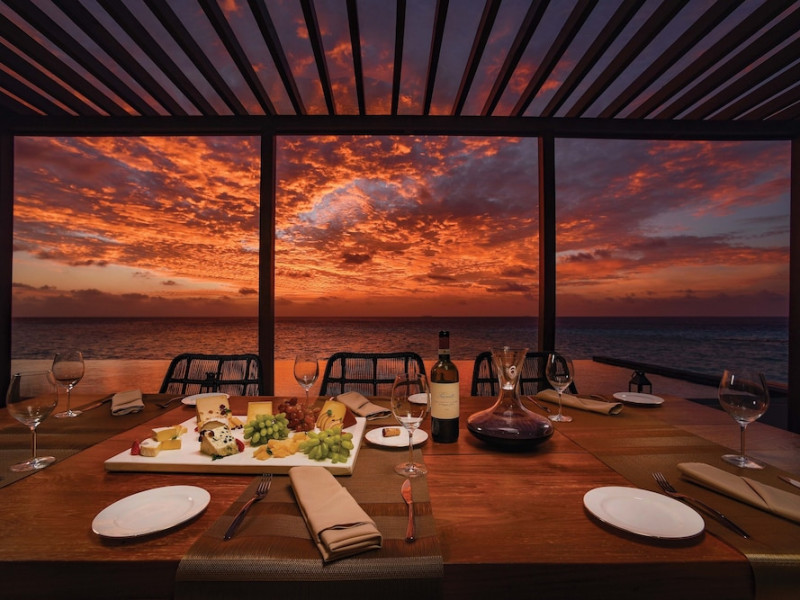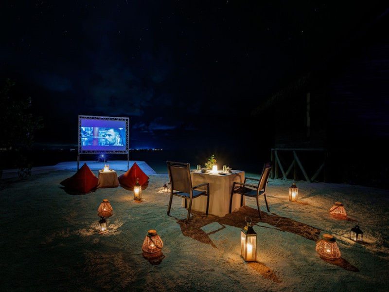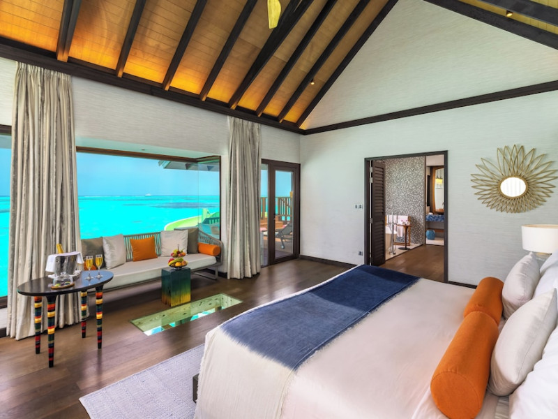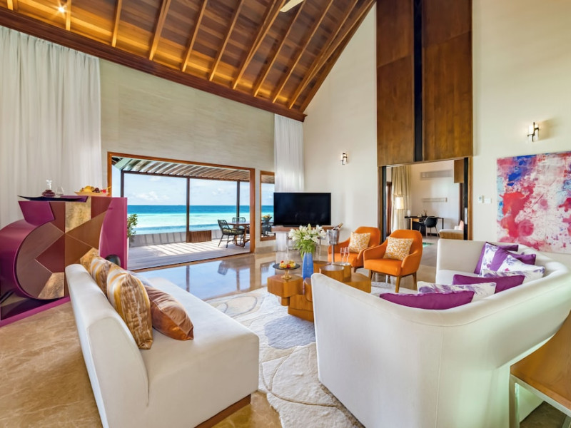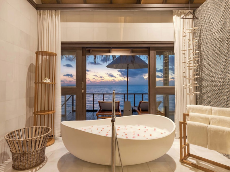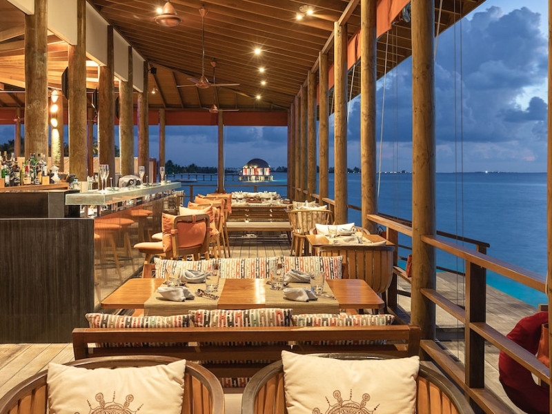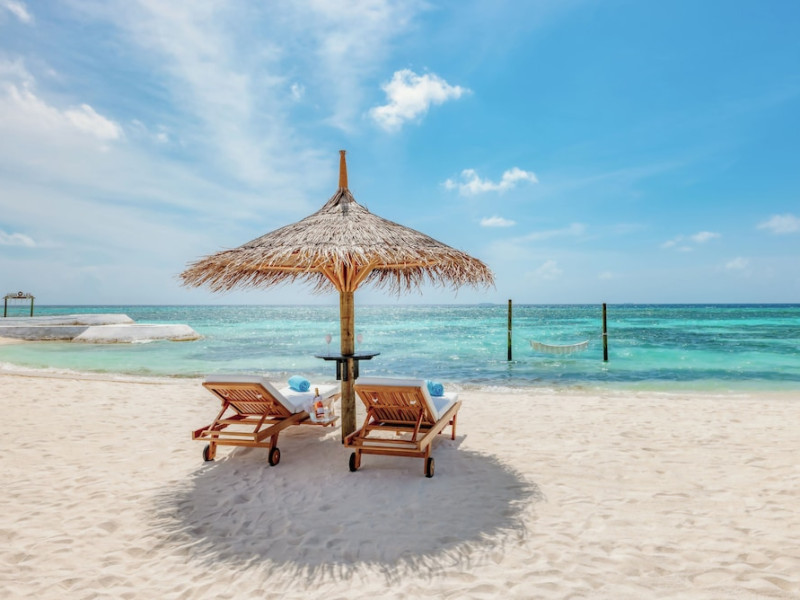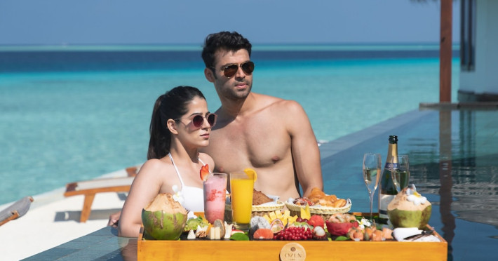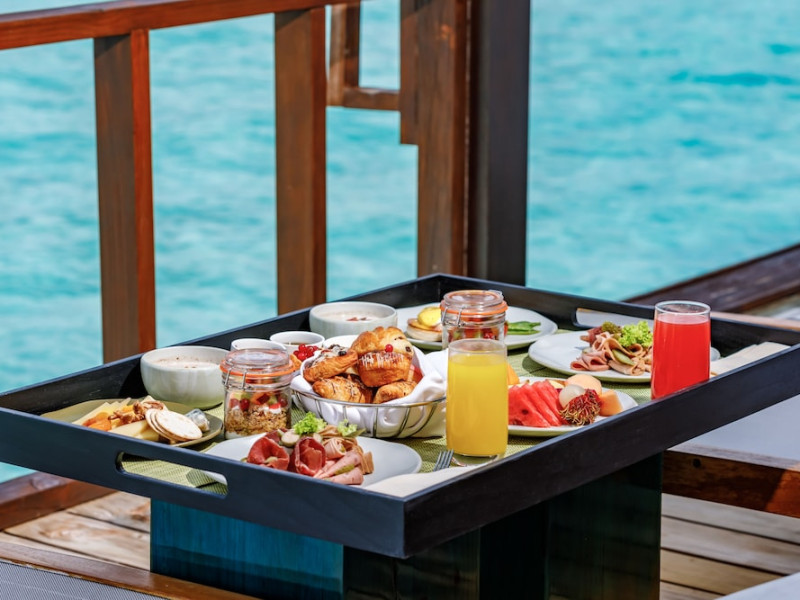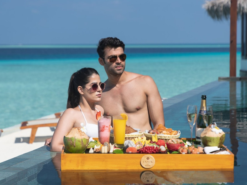 OZEN by Atmosphere at Maadhoo, Maldives, a luxury all-inclusive resort on the tranquil island of Maadhoo in South Male Atoll, offers an exclusive Atmosphere INDULGENCE holiday plan. The resort features a contemporary design complementing its natural surroundings. Amenities include a spa with massages and body treatments, a private beach, an outdoor pool, a nightclub, complimentary Wi-Fi, concierge services, babysitting (surcharge), and a business center. Dining options include five restaurants (with charges potentially applying to some restaurants, special dinners, dishes, beverages, and amenities), a coffee shop/cafe with snacks, a poolside bar, and three bars/lounges. A complimentary buffet breakfast is served daily (7:00 AM - 11:00 AM), and 24-hour room service is available. The 95 individually decorated guestrooms offer free minibar items, espresso makers, Tempur-Pedic beds with down comforters and Egyptian cotton sheets, 32-inch LED TVs, and private bathrooms with separate bathtubs and showers. The resort is located near several beaches, including Rihiveli, Kandooma, Rannalhi, and Gulhi beaches (distances vary slightly across sources). Express check-in and check-out are also available. The Ozen Life Maadhoo Resort is a hotel.