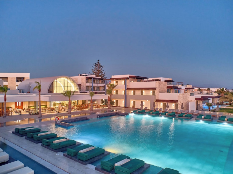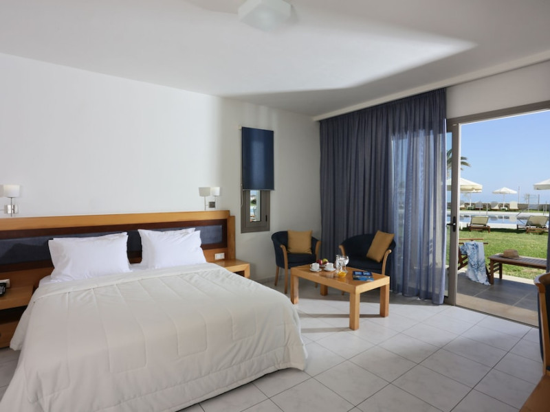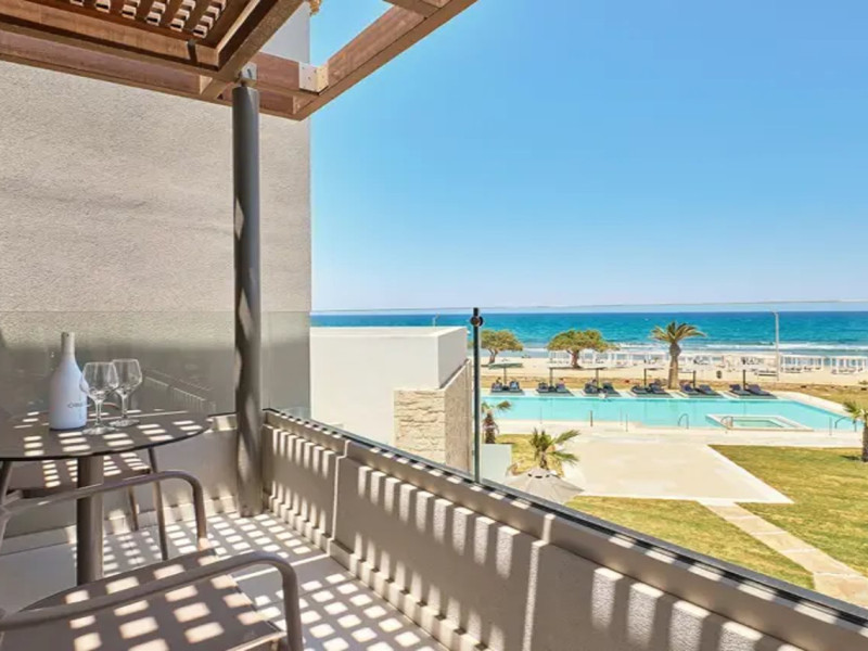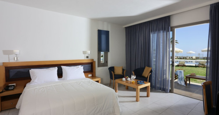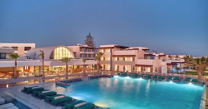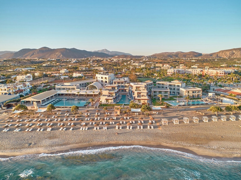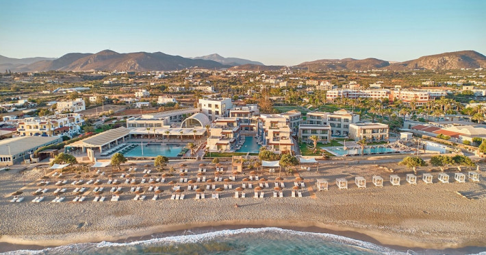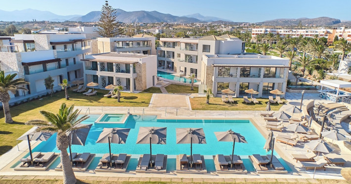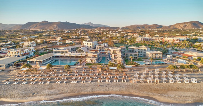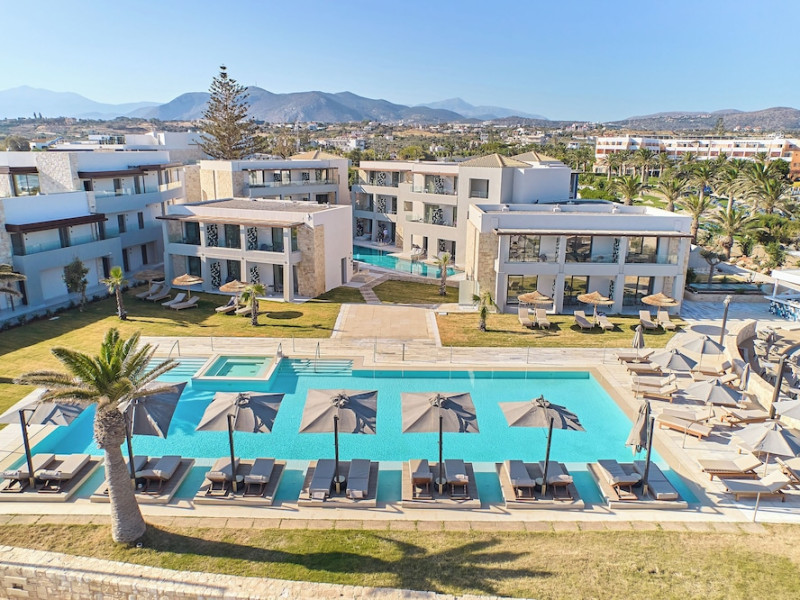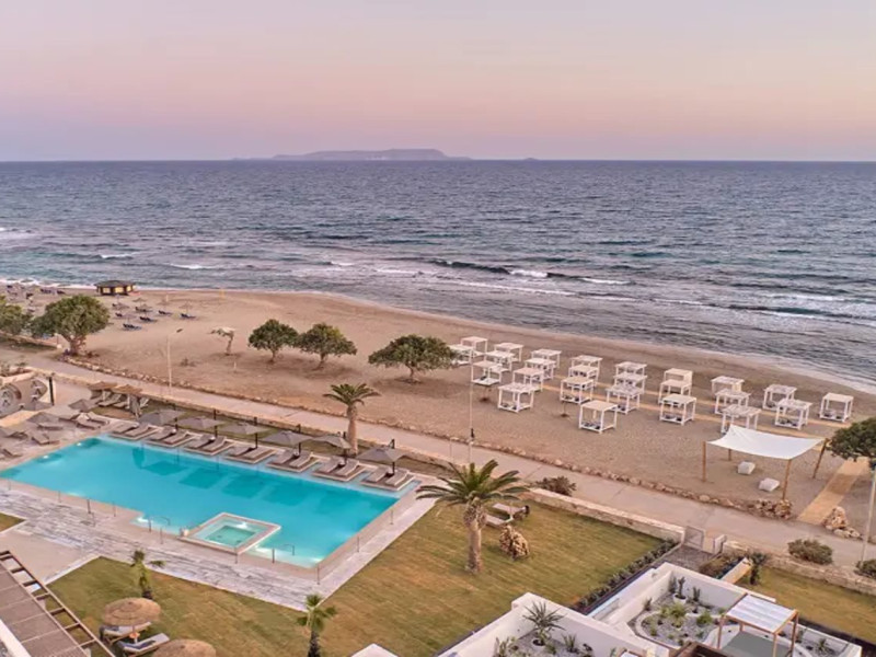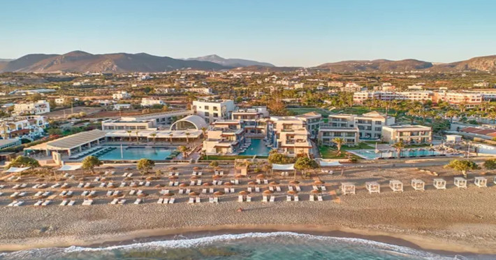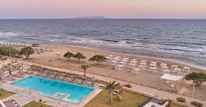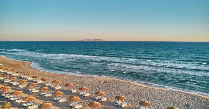 Facilities and services include 24-hour reception, lobby, lounge with terrace & elevator, Wi-Fi in public areas, 2 outdoor electrolysis swimming pools with jacuzzi (10:00-18:00), sun terrace, pool/beach sunbeds & umbrellas, beach gazebos, pool & beach lifeguard (10:00-18:00), beach changing cabin, outdoor shower, sitting terrace, garden, amphitheater, onsite parking, first-aid kit & AED kit & doctor on call (extra charge), restaurant, bars, indoor & outdoor fitness room, certified fitness trainer, indoor heated swimming pool (10:00-19:00). Wellness facilities include (all with extra charge): spa center (10:00-19:00) with massage treatments (on request), manicure & pedicure, body & facial treatments (by appointment), sauna, steam bath, whirlpool.Room features individual air-conditioning, ceiling fan, direct-dial telephone (extra charge), electronic laptop-size safety deposit box with integrated power socket, high-speed Wi-Fi, 50 to 55-inch Smart TV, mini fridge, mini bar, electric kettle, Nespresso coffee machine, coffee & tea facilities, walk-in rain shower & WC sink, hairdryer, bathrobe, bathroom amenities, pool/beach towels, balcony/terrace, room service (07:30 22:30, extra charge), maid service (daily), towel change (daily), linen change (3 times per week), pillow menu, laundry & dry cleaning service (extra charge).Notes:- Only guests 13 years old and above can be accommodated.- Swimming shoes are recommended at the beach as there are pebbles- Rooms for disabled guests are on request and is subject to availability.- Some of the above facilities may be closed due to weather/seasonal conditions.Address: 700 14 Anissaras, Hersonissos, Crete.