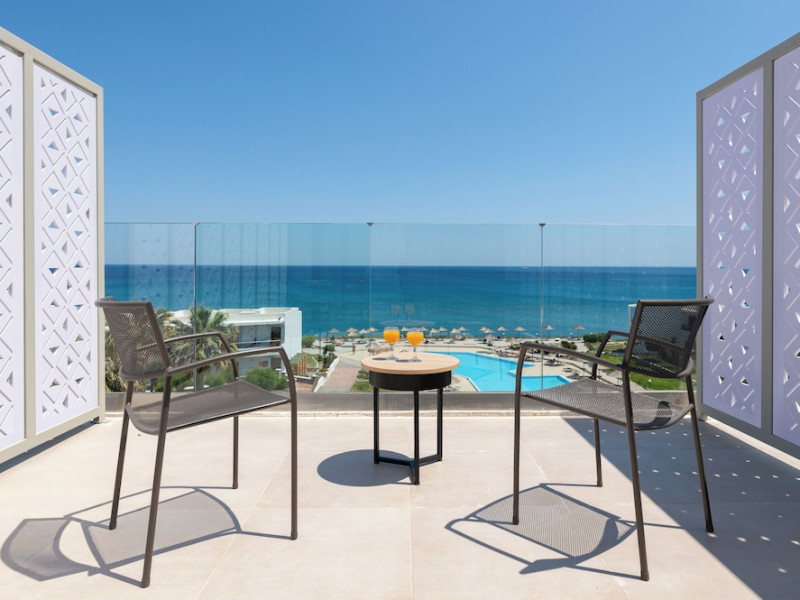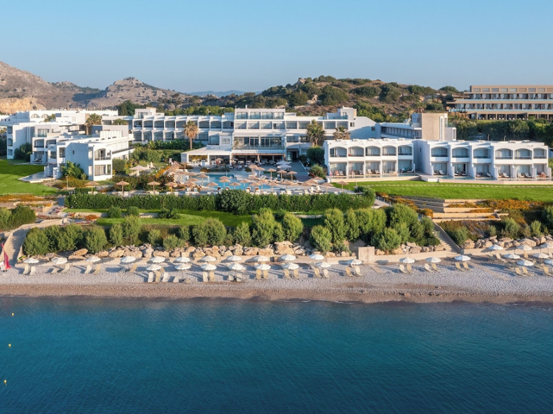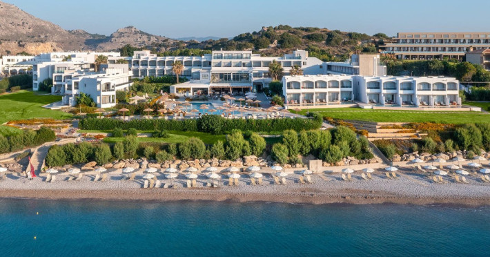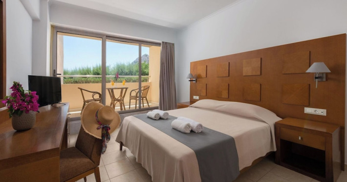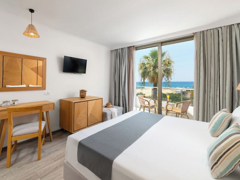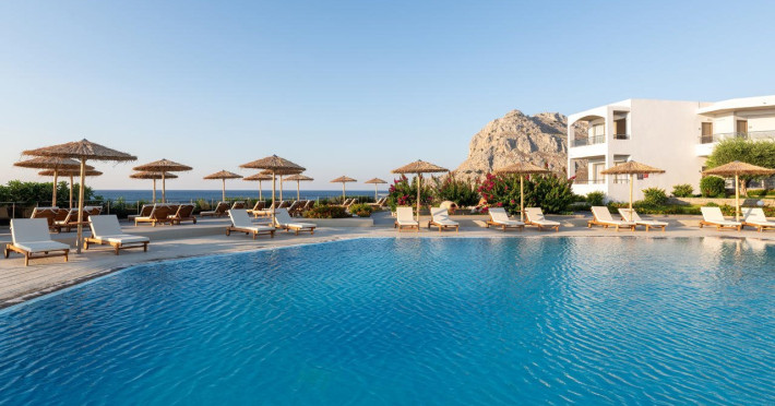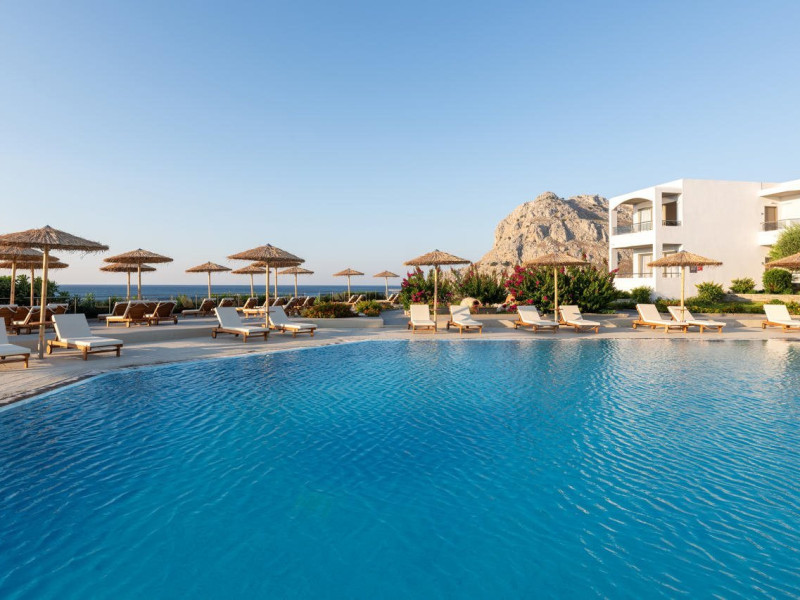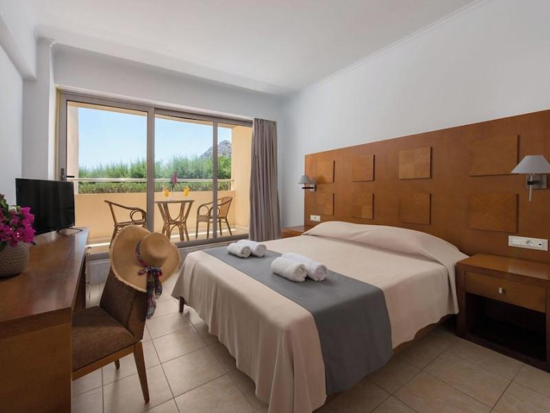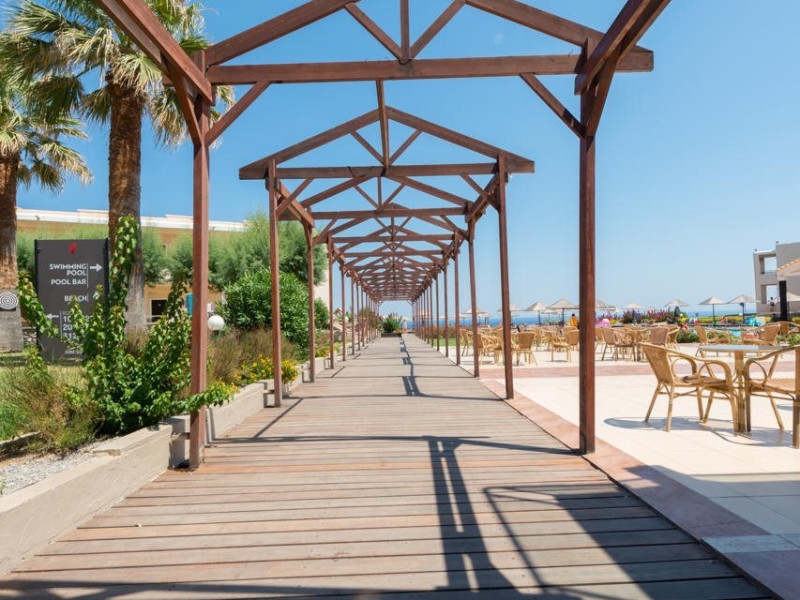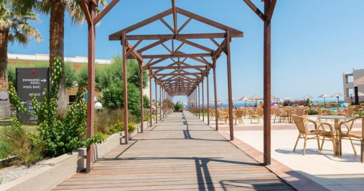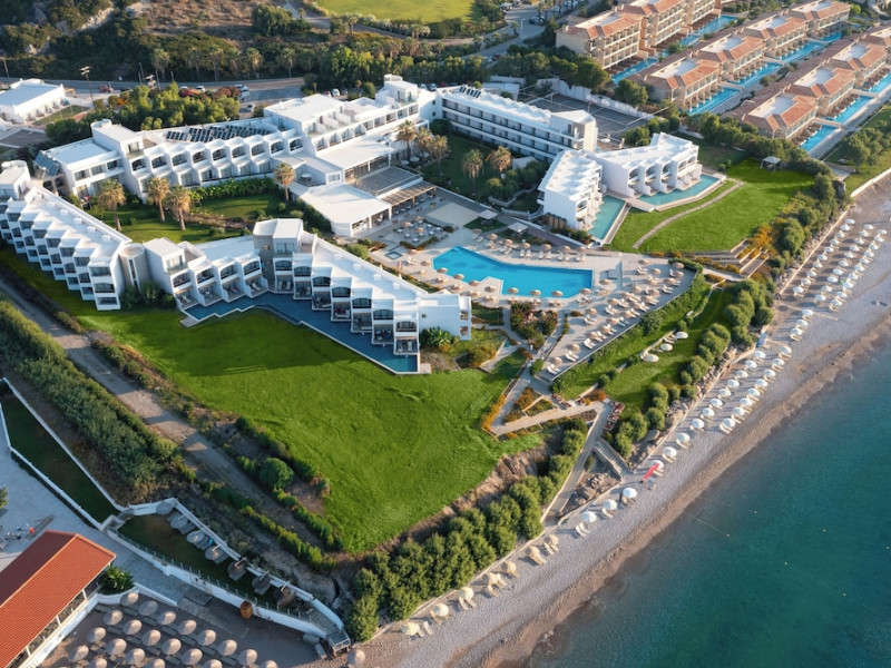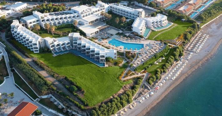 Facilities and services 24-hour reception, lobby, elevator, luggage storage, Wi-Fi in public areas, mini market, outdoor swimming pool (08:00-19:00), sunbeds & umbrellas, pool gazebos (free), courtesy room (for late departures), pool outdoor shower, pool changing cabin, garden, on-site parking, electrical vehicle charging station (extra charge), first aid, doctor on call (extra charge), restaurants, bars, separated baby pool (10:00-18:00), playground, an outdoor gym, a fitness trainer (6 times per week), and massage cabins (on request, extra charge).Rooms feature air-conditioning/heating, direct-dial telephone, 43-inch flat-screen TV (with satellite channels), safety deposit box, mini fridge, coffee & tea facilities (daily refill), shower/WC, hairdryer, cosmetic mirror, bathroom amenities, slippers, pool/beach towels (free, change 3 times per week), balcony, laundry/dry cleaning/ironing service (provided by a third party with extra charge), a baby cot (on request), highchair (on request).NOTE:*Check in: 14:00*Check out: 11:00* Maid service (daily)*Towel change (daily)*Linen change (every 2nd day)The All Inclusive-Concept includes all meals (breakfast, lunch, dinner and snacks) and mealtime drinks such as soft drinks, beer, wine, water, and alcoholic drinks, all of local brands. Drinks are served from morning until late evening (approx until 22.00 -24.00 hrs). Opening times vary between different hotels. In certain hotels, the activities program is also included.Please note that some of the above facilities may be closed due to weather / seasonal conditions.Address: Athinon Street, 85103 Kolymbia, Rhodes, Greece.