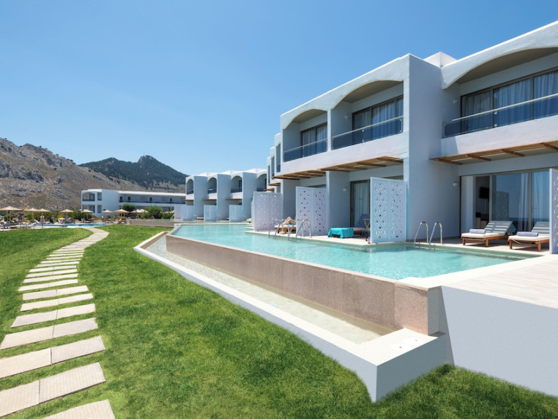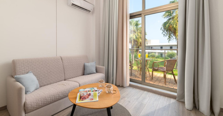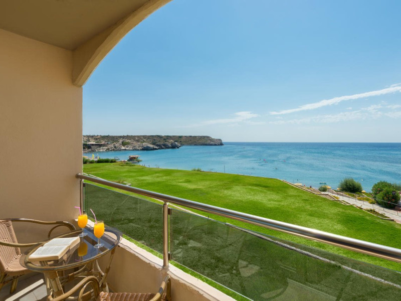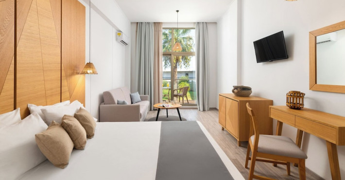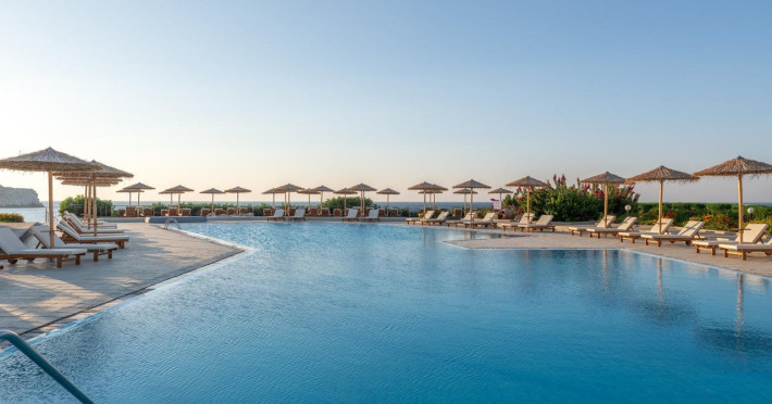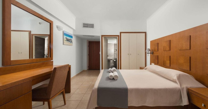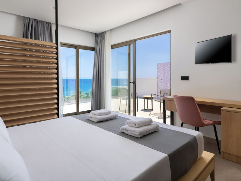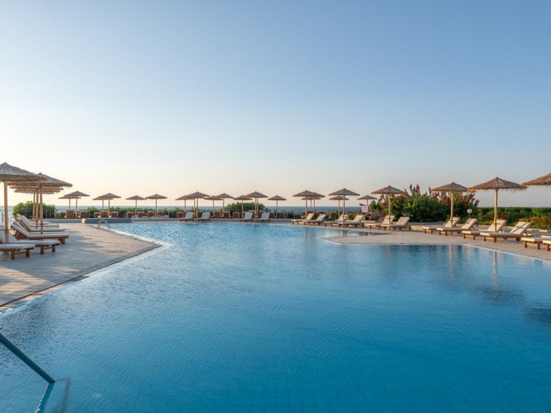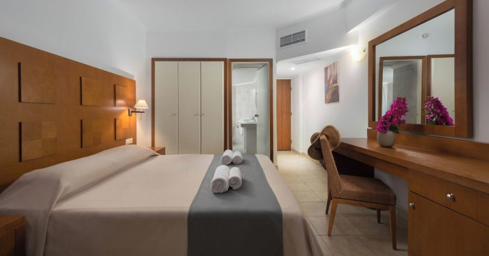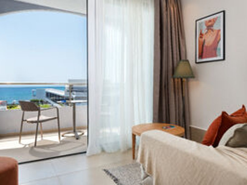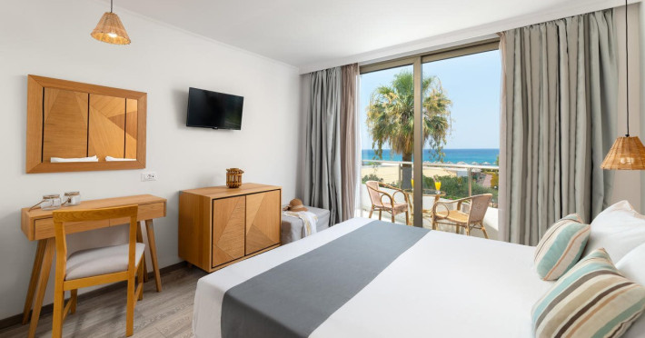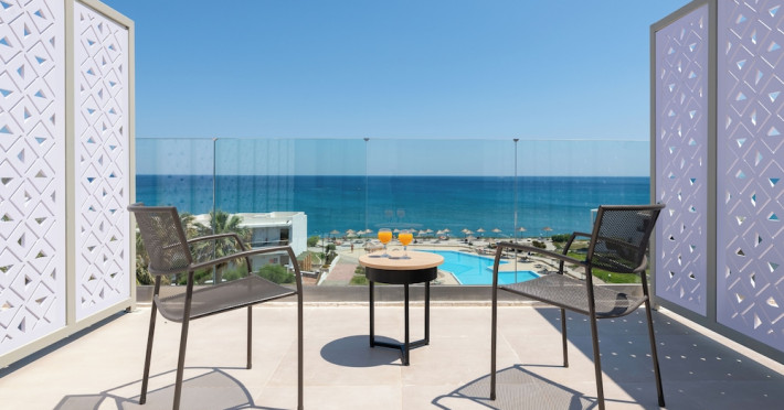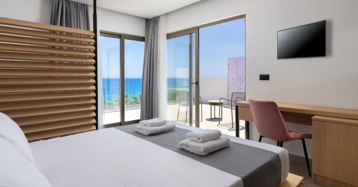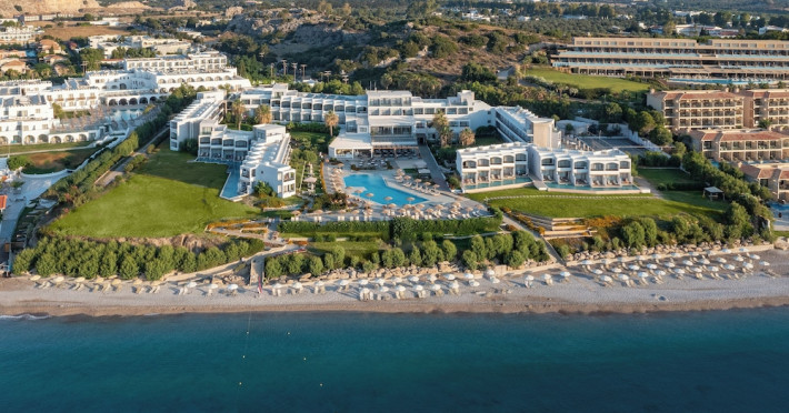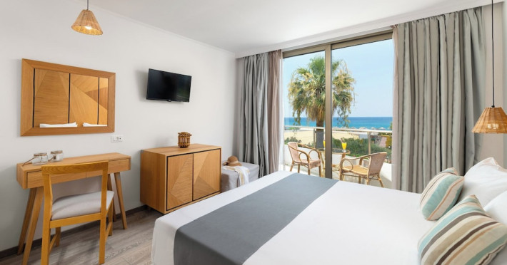 Facilities and services 24-hour reception, lobby, elevator, luggage storage, Wi-Fi in public areas, mini market, outdoor swimming pool (08:00-19:00), sunbeds & umbrellas, pool gazebos (free), courtesy room (for late departures), pool outdoor shower, pool changing cabin, garden, on-site parking, electrical vehicle charging station (extra charge), first aid, doctor on call (extra charge), restaurants, bars, separated baby pool (10:00-18:00), playground, an outdoor gym, a fitness trainer (6 times per week), and massage cabins (on request, extra charge).Rooms feature air-conditioning/heating, direct-dial telephone, 43-inch flat-screen TV (with satellite channels), safety deposit box, mini fridge, coffee & tea facilities (daily refill), shower/WC, hairdryer, cosmetic mirror, bathroom amenities, slippers, pool/beach towels (free, change 3 times per week), balcony, laundry/dry cleaning/ironing service (provided by a third party with extra charge), a baby cot (on request), highchair (on request).NOTE:*Check in: 14:00*Check out: 11:00* Maid service (daily)*Towel change (daily)*Linen change (every 2nd day)The All Inclusive-Concept includes all meals (breakfast, lunch, dinner and snacks) and mealtime drinks such as soft drinks, beer, wine, water, and alcoholic drinks, all of local brands. Drinks are served from morning until late evening (approx until 22.00 -24.00 hrs). Opening times vary between different hotels. In certain hotels, the activities program is also included.Please note that some of the above facilities may be closed due to weather / seasonal conditions.Address: Athinon Street, 85103 Kolymbia, Rhodes, Greece.