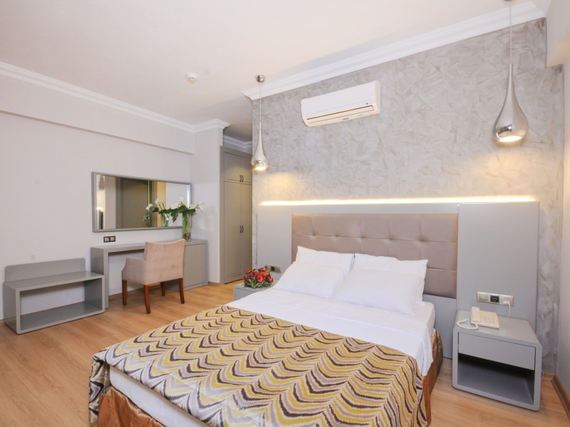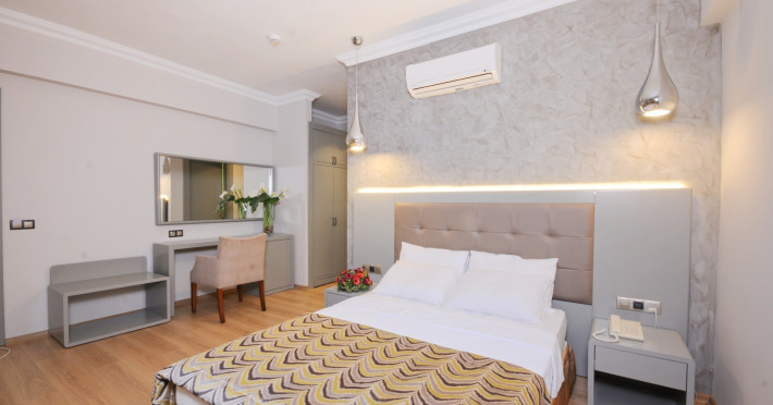 Camera dubla: baie/WC, uscator de par, aer conditionat, TV, telefon, minibar (umplut cu apa si bauturi racoritoare la sosire), seif (gratuit), balcon sau terasa, suprafata camerei 22 m2.