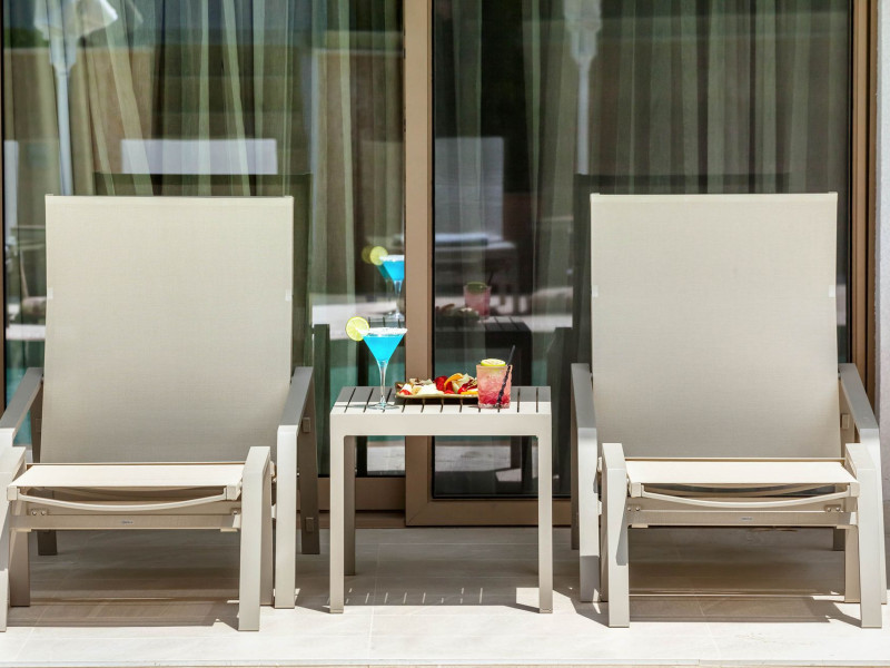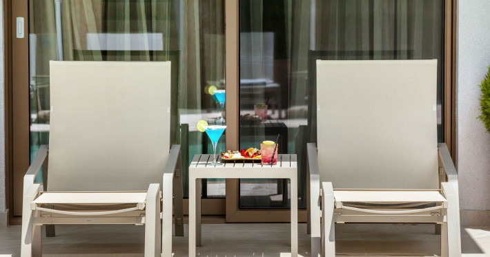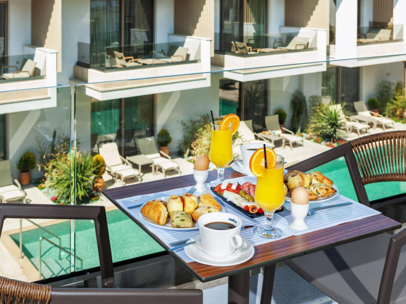 Camerele de tip studio sunt dotate cu baie cu dus si uscator de par, aer conditionat, chicineta (frigider, fierbator electric, plita electrica, aparat de cafea Nespresso), TV cu ecran plat, WiFi, seif, balcon mobilat, cu vedere la piscina.