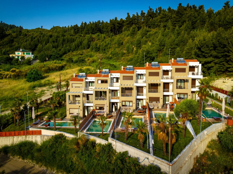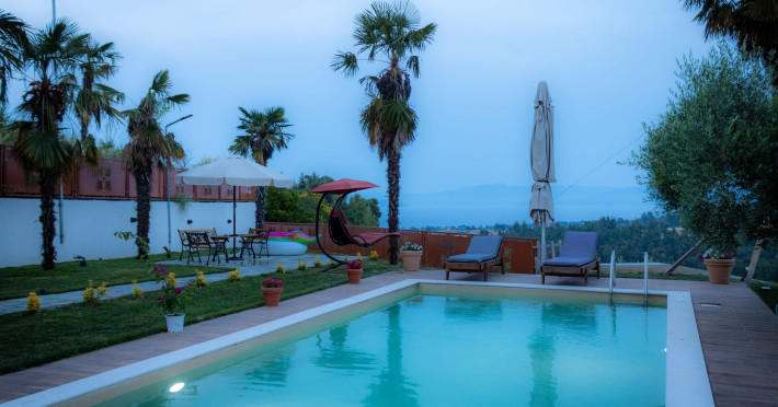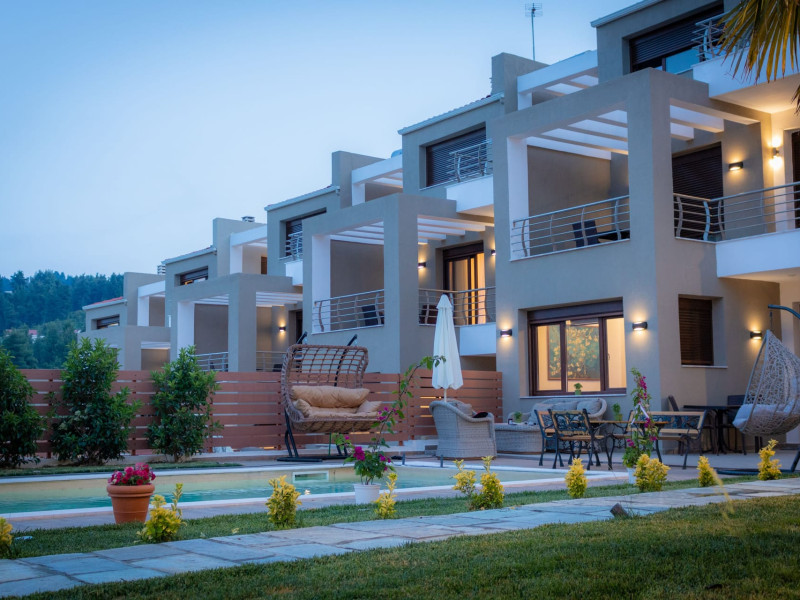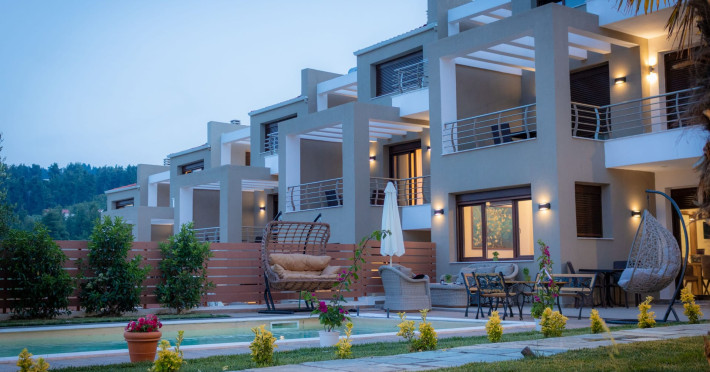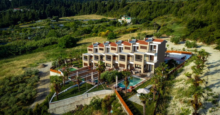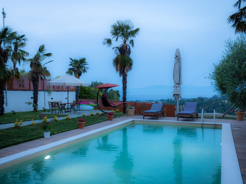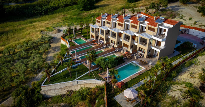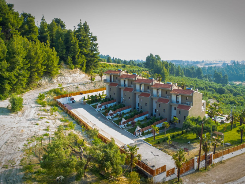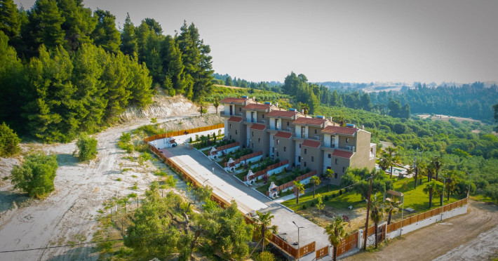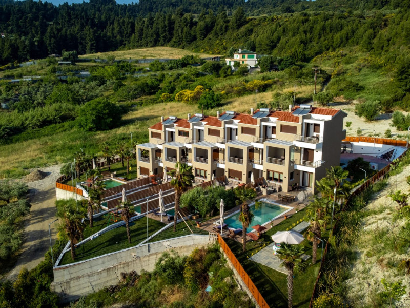 Pefkohori Golden Mountain Villas are located in Pefkohori, Chalkidiki. The 5 luxurious villas with individual private pools are located on a hill just 3 km from the center of Pefkohori and 1.3 km from the sandy beach. Each villa offers privacy, with 3 separate bedrooms and 3 bathrooms, and can accommodate up to 6 guests. The kitchen is fully equipped with all the essentials for a comfortable and self catered stay. Each Villa has a private pool which is surrounded by a private terrace with sunbeds. The location is ideal, as it offers privacy and tranquillity. Private parking is available on spot.