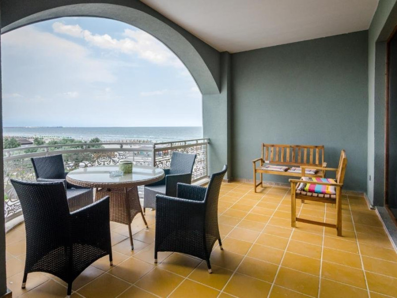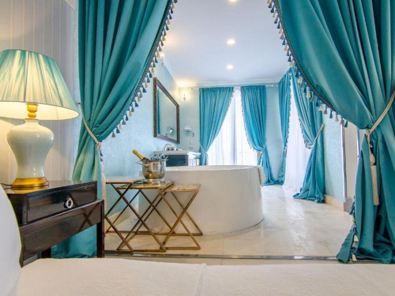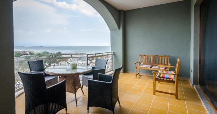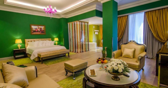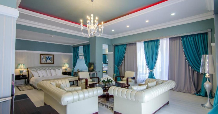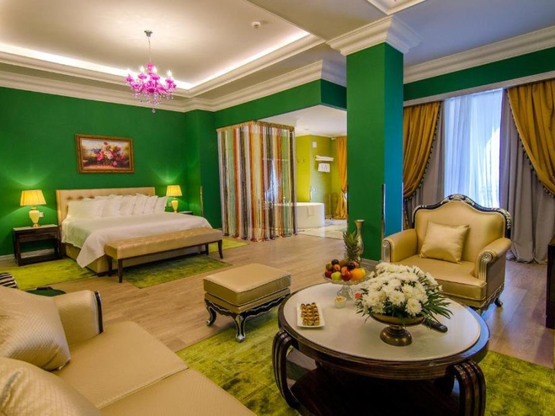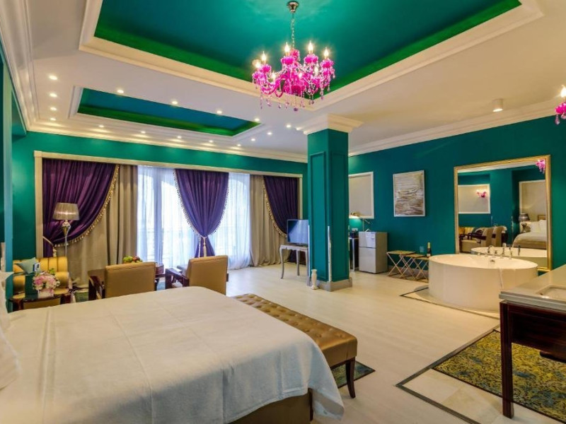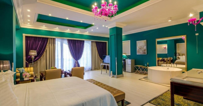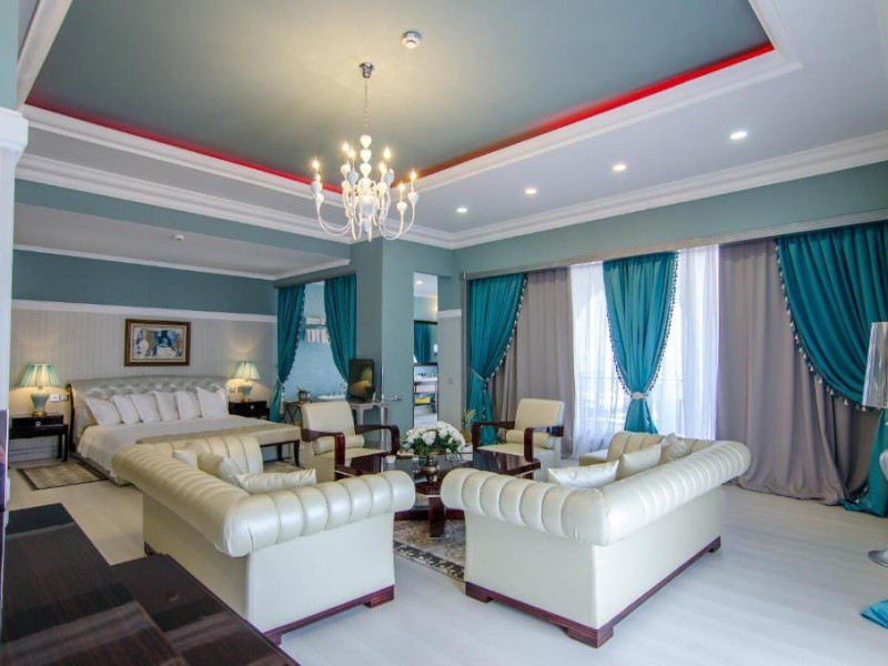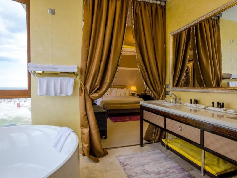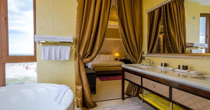 Deluxe suite: pat matrimonial, 1 canapea si 2 fotolii, baie cu dus si cada, minibar, internet WiFi, TV LCD, seif, aer conditionat, telefon, uscator de par, balcon cu vedere la mare. Are o suprafata de aproximativ 70mp.