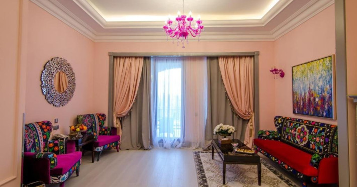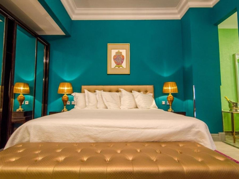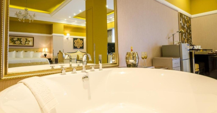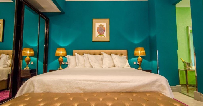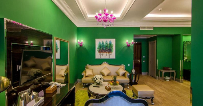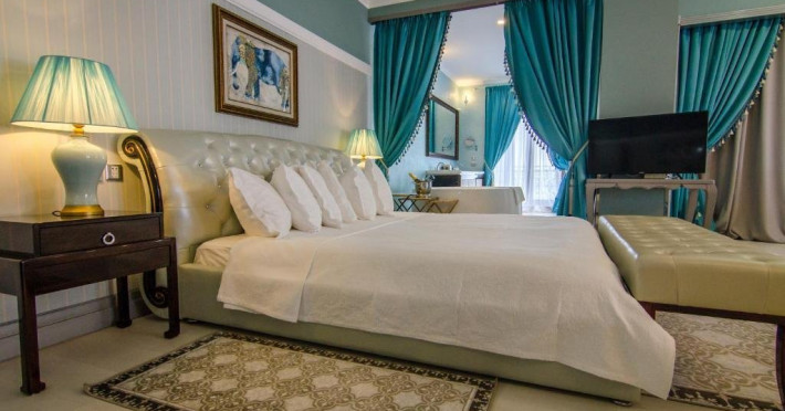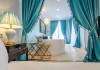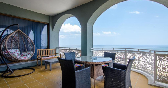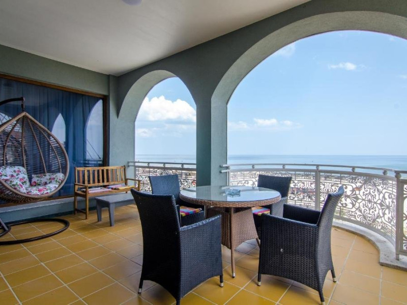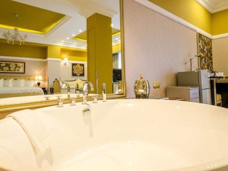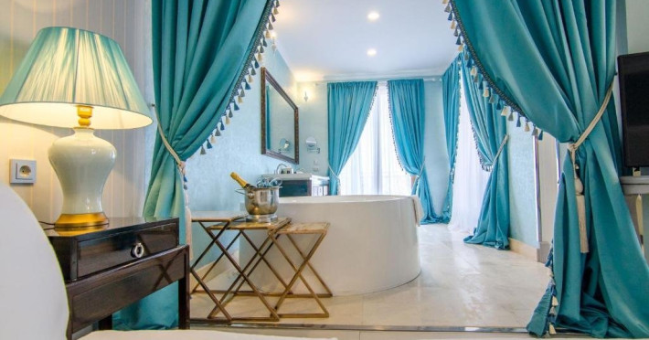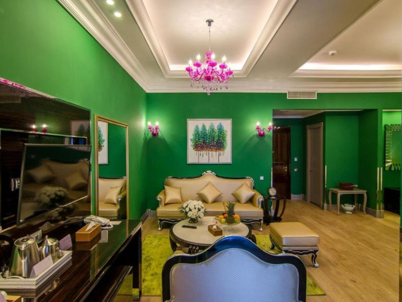 Deluxe suite: pat matrimonial, 1 canapea si 2 fotolii, baie cu dus si cada, minibar, internet WiFi, TV LCD, seif, aer conditionat, telefon, uscator de par, balcon cu vedere la mare. Are o suprafata de aproximativ 70mp.