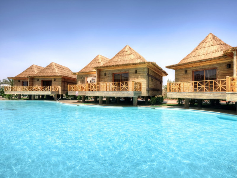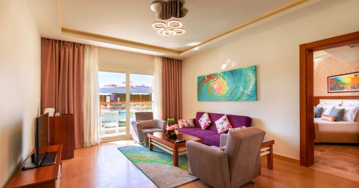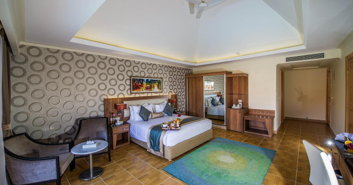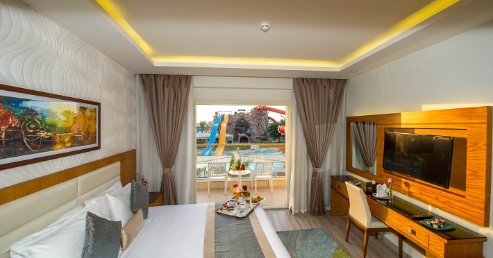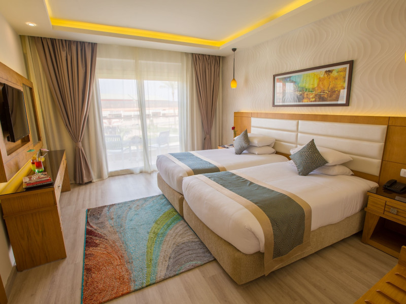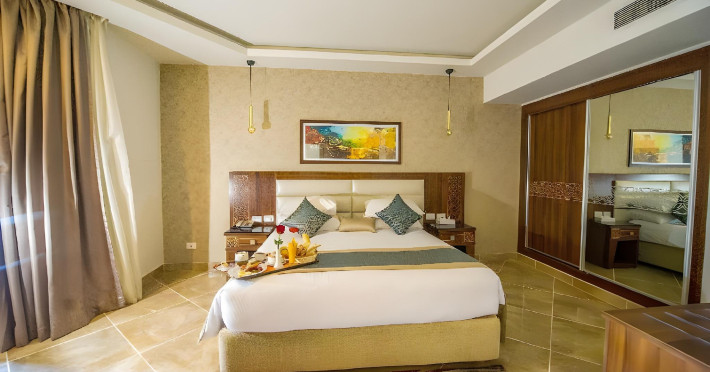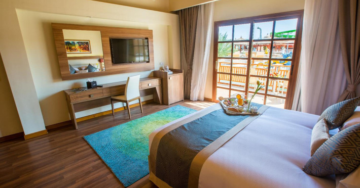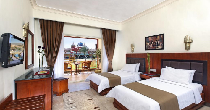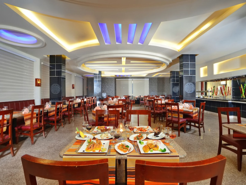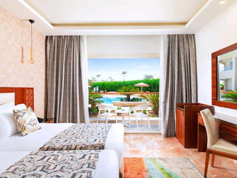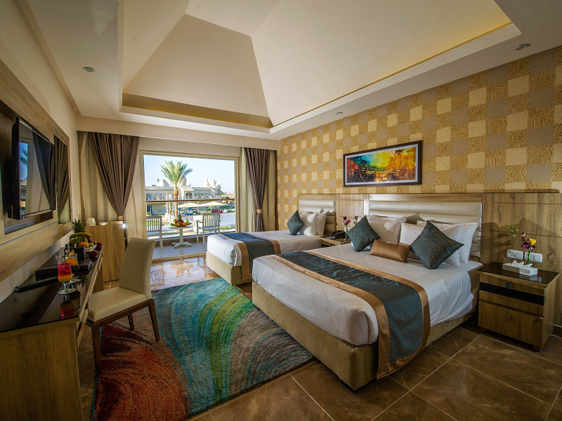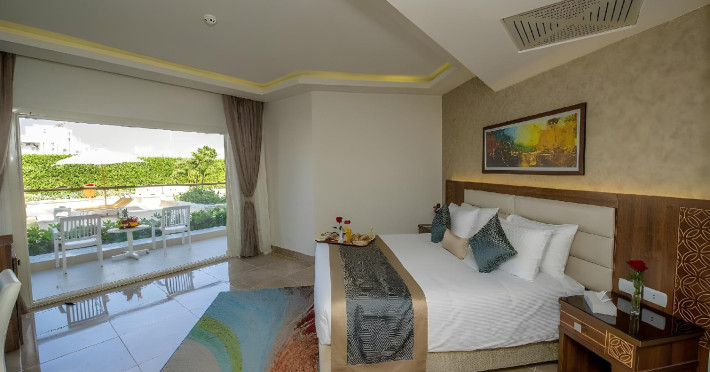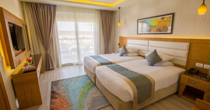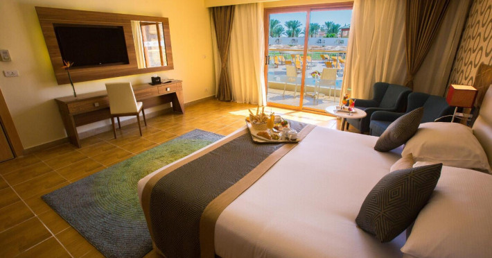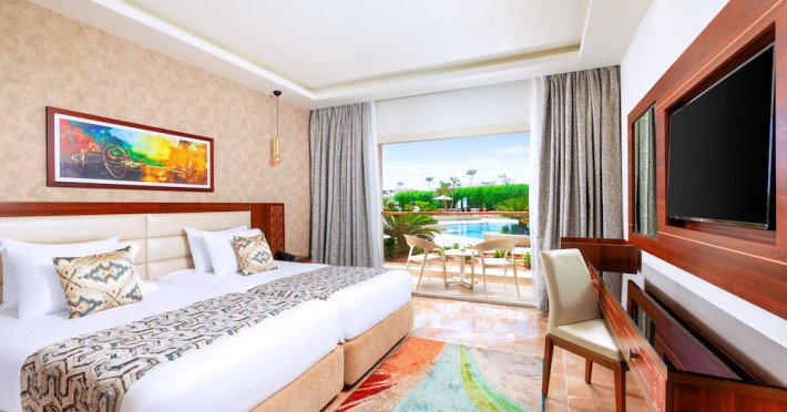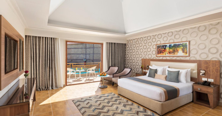 Pickalbatros Aqua Blu Sharm El Sheikh, located on the cliff of Ras Om El Seid within Aqua Park City, offers a variety of accommodations including standard rooms, family rooms, and bungalows. The resort is 15 minutes from Sharm el Sheikh's city center and 25 minutes from the airport. Enjoy nine outdoor swimming pools (including 10 children's pools and 17 adult pools), a private beach (accessible via complimentary shuttle), and 64 water slides. Dining options include five restaurants (offering international, Italian, Mediterranean, and Asian cuisine), three coffee shops/cafes, a beach bar, and six bars/lounges; 24-hour room service is available. Amenities include complimentary Wi-Fi, concierge services, an arcade/game room, a full-service spa, a gym, a kids' club, nightly entertainment, horseback riding, dry cleaning/laundry services, a 24-hour front desk, luggage storage, free self parking, and a convenience store. Rooms feature air conditioning, minibars, LCD televisions, satellite programming, private balconies or patios, private bathrooms with showers, complimentary toiletries, and hair dryers. All-inclusive rates are available (some restrictions apply). The resort is near Aqua Blue Water Park, the Red Sea, and various local attractions (distances provided in the original descriptions). Airport shuttle service is available at an extra charge. The Pickalbatros Aqua Blu Sharm El Sheikh is a Tourist hotel. The nightlife/restaurants are easily accessible by taxi or bus from the hotel.