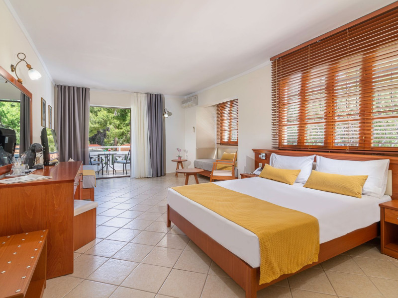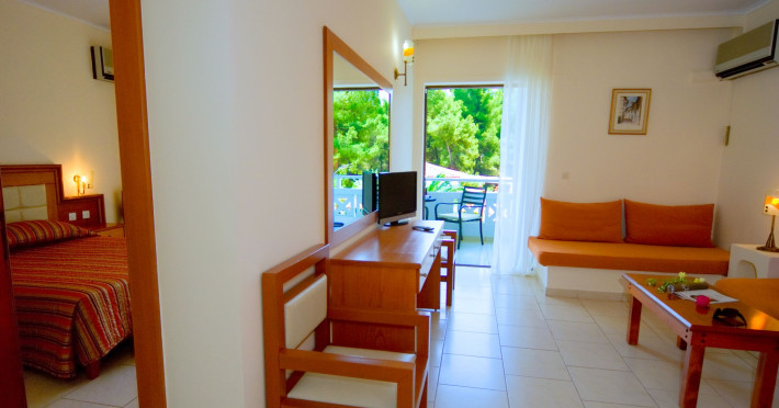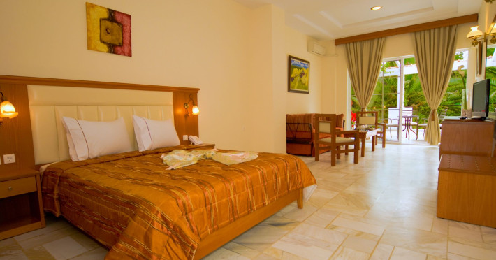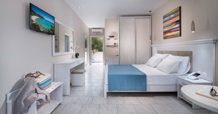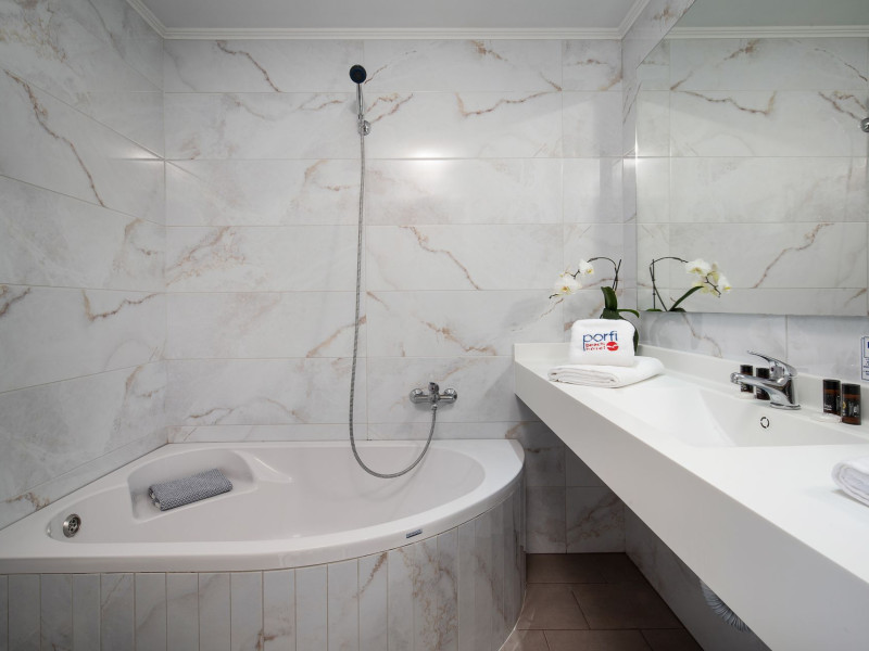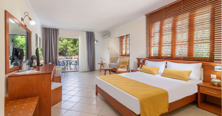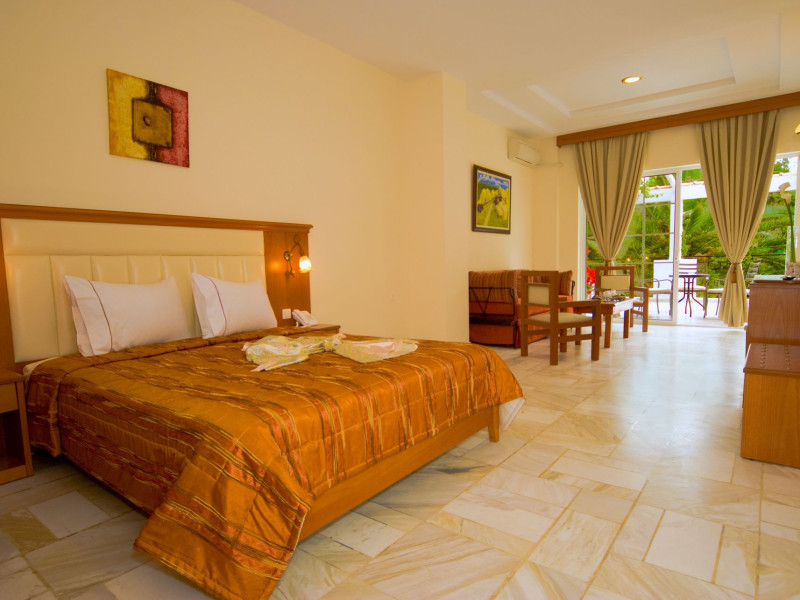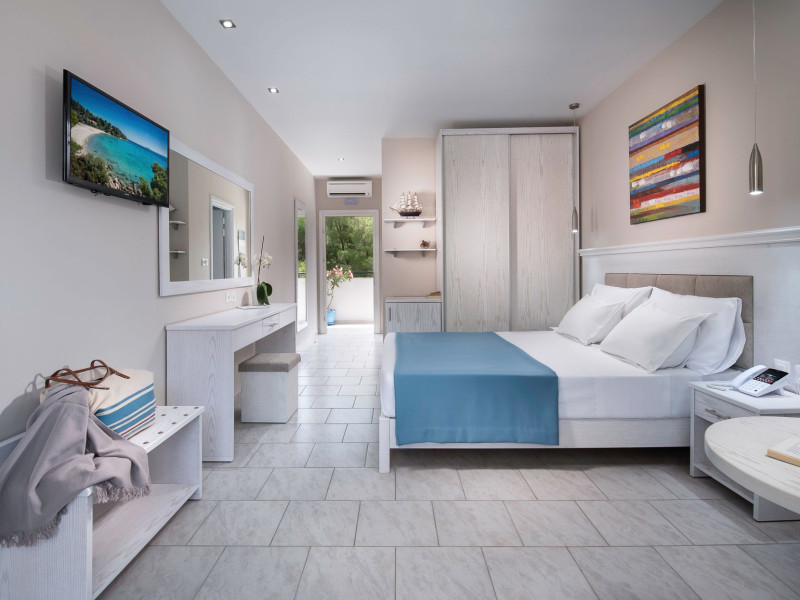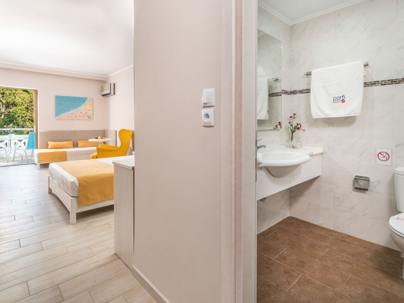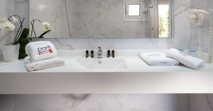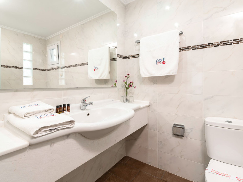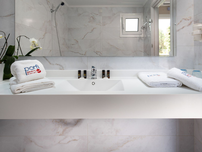 Camerele Hotelului Porfi Beach au aer condiţionat şi balcon sau verandă cu vedere la mare sau la grădinile luxuriante. Toate camerele au zonă de relaxare, iar paturile sunt prevăzute cu saltele anatomice. Acestea includ TV LED cu canale prin satelit şi minibar.