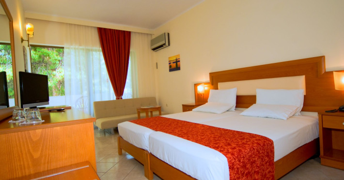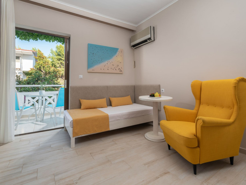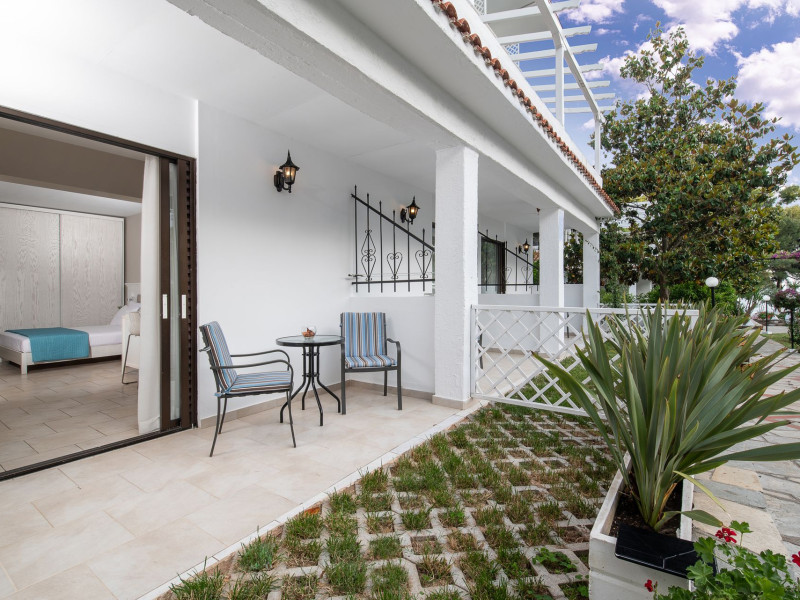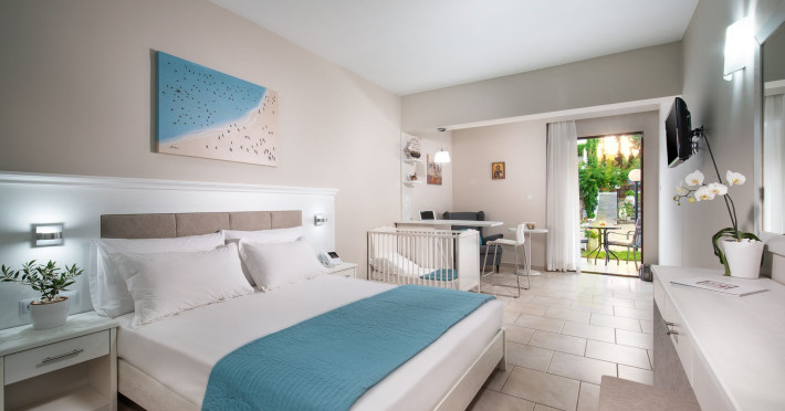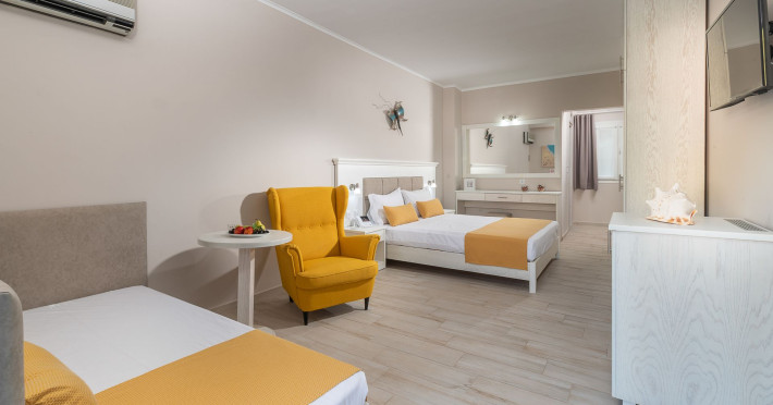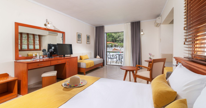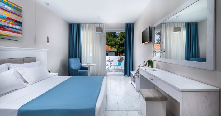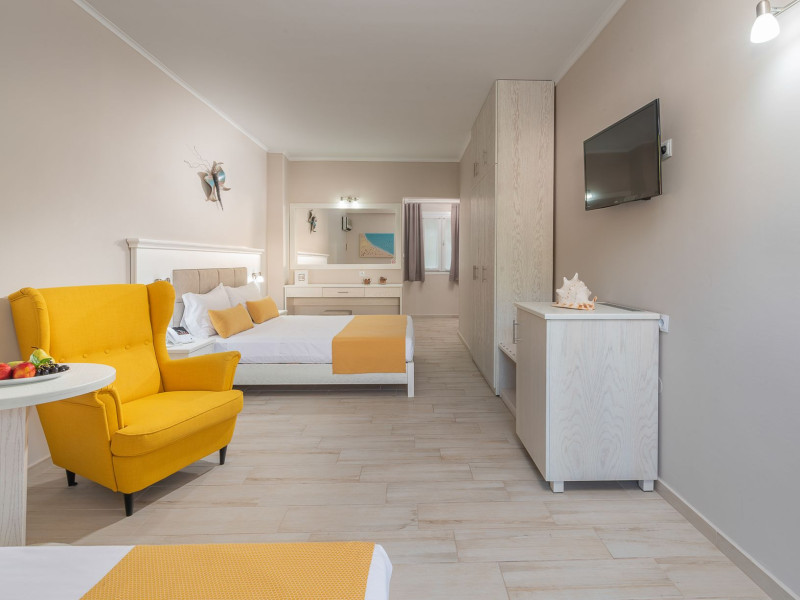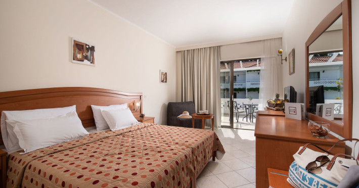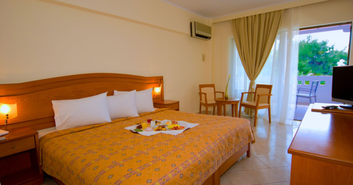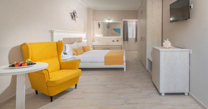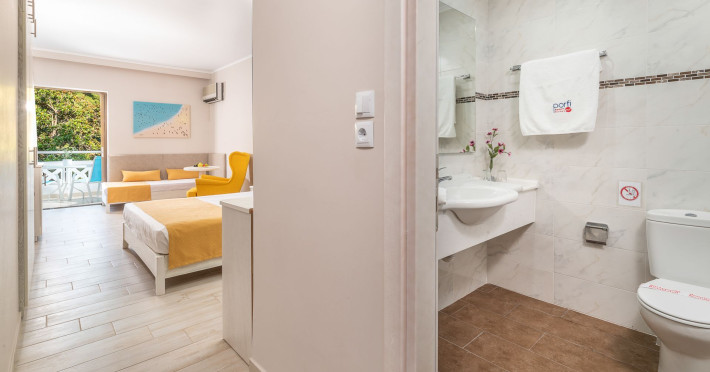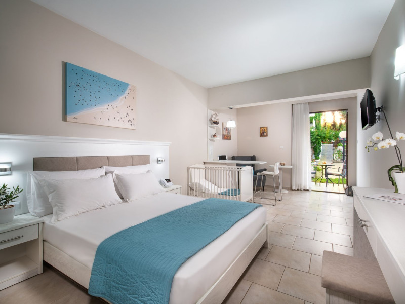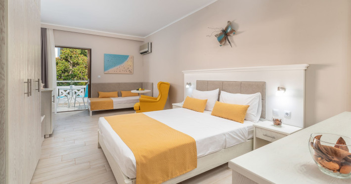 Camerele Hotelului Porfi Beach au aer condiţionat şi balcon sau verandă cu vedere la mare sau la grădinile luxuriante. Toate camerele au zonă de relaxare, iar paturile sunt prevăzute cu saltele anatomice. Acestea includ TV LED cu canale prin satelit şi minibar.