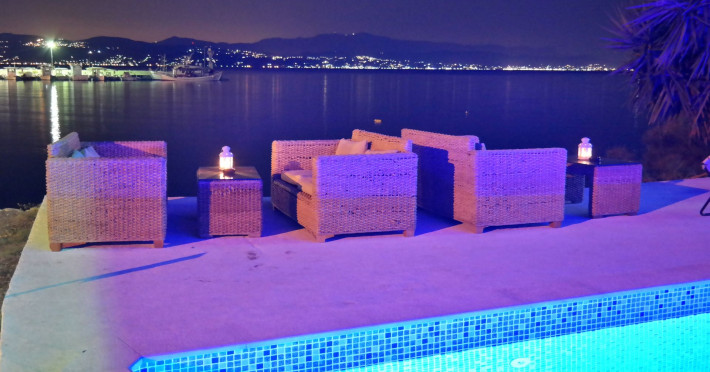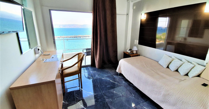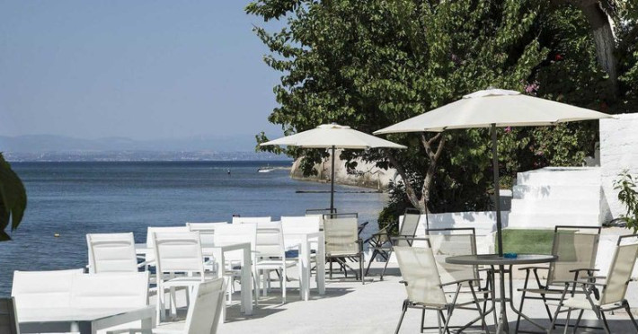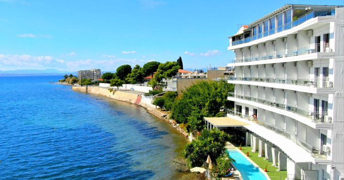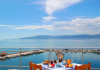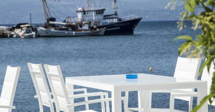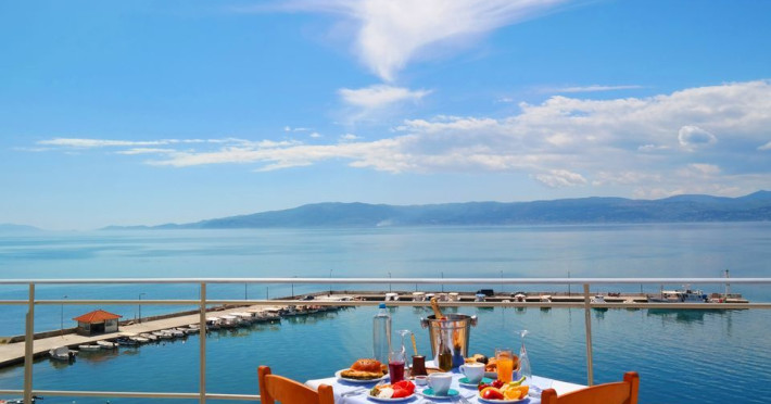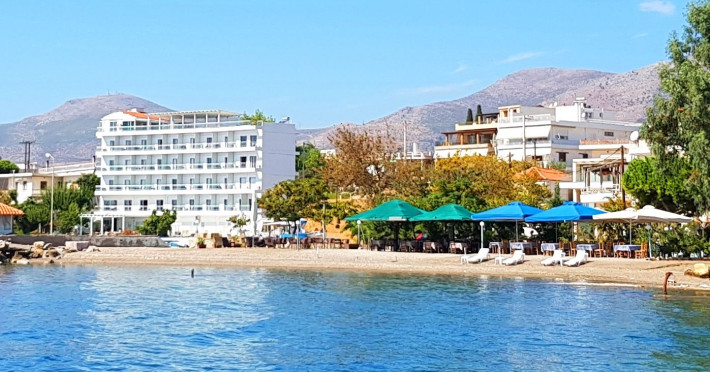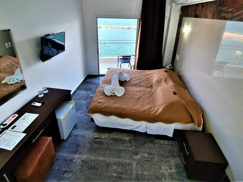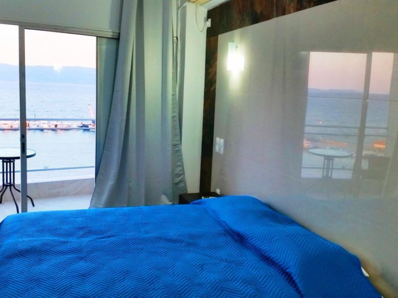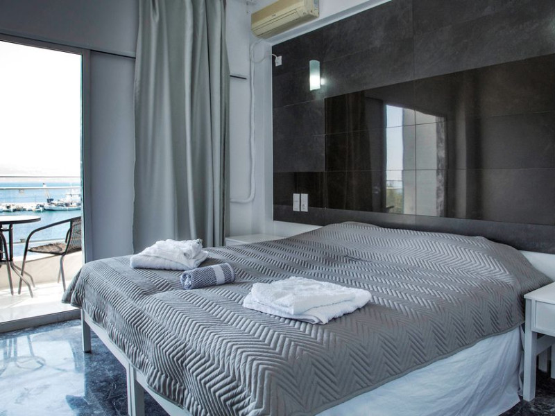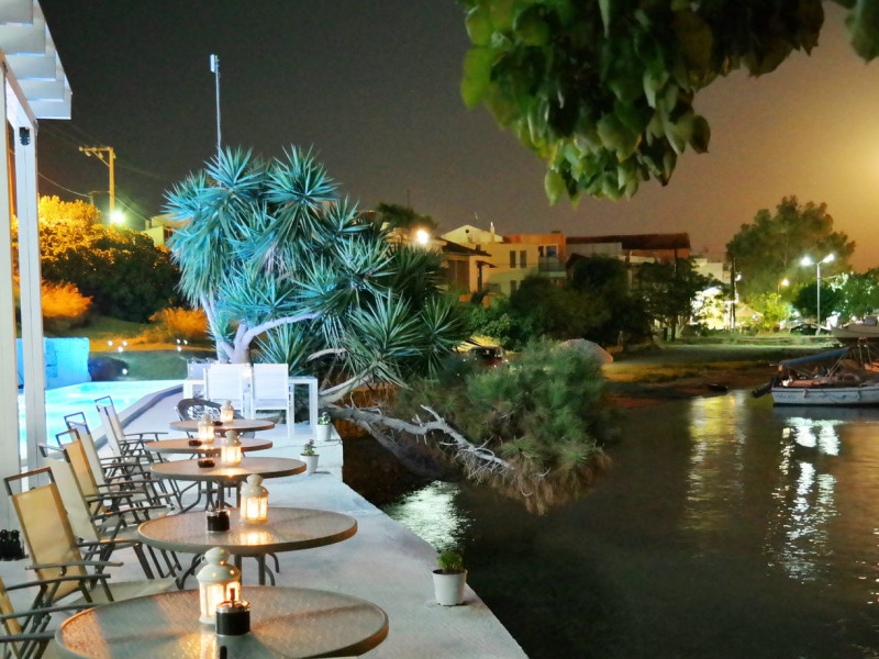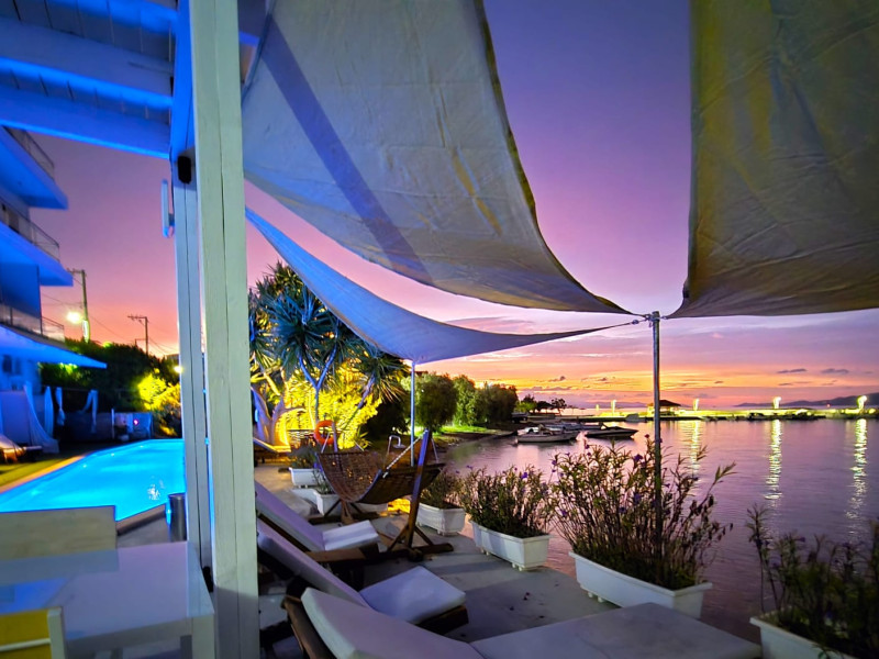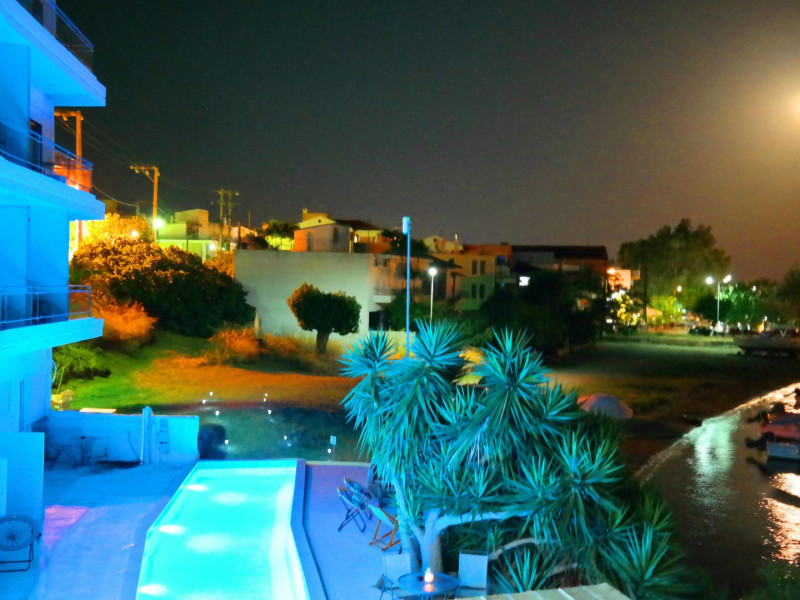 The Porto Evia Boutique Hotel is located in the center of the Ancient city of Amarynthos aged over 8000 years ago with findings since 6000 B.C. The hotel is a seafront property located directly right in front of the sea of Evoikos Gulf, with direct access to the water from the hotel terrace, the only hotel located in the sea within 7 meters from the main building. The hotel consists of 43 units, of which 8 are seafront beach level studios, 3 Sea view-marina-city view suites consisting of 3 rooms each with double balconies, and 32 rooms, sea view rooms with direct sea view and marina view. The entire hotel is overlooking the Marina, the Evoikos Sea Gulf, and the cities of Attica. The hotel is located in the center of Amarynthos town of Eretria borough, which is a the most lively city of South Evia island, offering a wide range of bars, clubs, restaurants, beach bars, and the entire town of Amarynthos is located across the coastline, right in front of the sea. All these facilities are accessible from the Porto Evia boutique Hotel, within 2 minutes walk, although the hotel is very quite during all times. The Hotel offers a seafront bar and restaurant offering services 24 hours a day. The roof garden has a unique view across the ocean with nice towns, small islands and marinas right in front of the hotel.All room offer a fantastic sea view balcony, fully equipped shower bathroom, toiletries, mini fridge, air-conditioning, hairdryer, TV, room service. Other beaches except of the hotel seafront area, there is a nice beach 1 minute walk from the hotel and also beach bars and other beaches within 10 minutes walk from the hotel.
