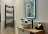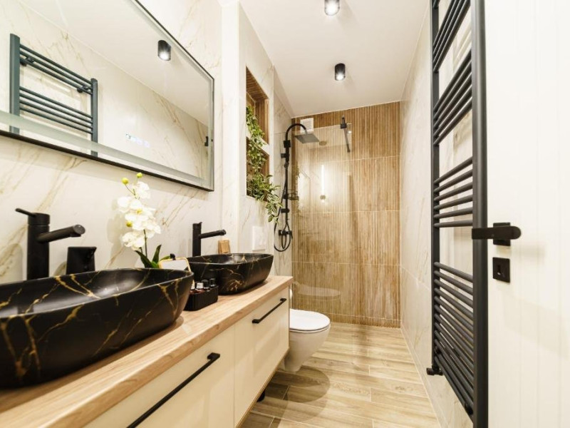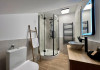 Baiaprincipala impresioneaza prin designul modern si functional: dus walk-in, doualavoare si o oglinda generoasa cu iluminare si sistem antiaburire.