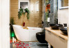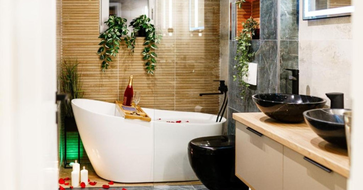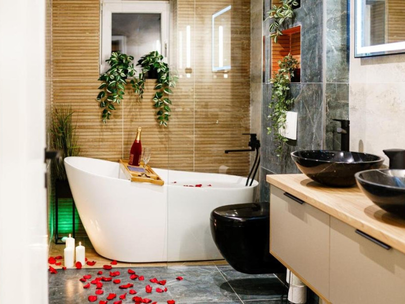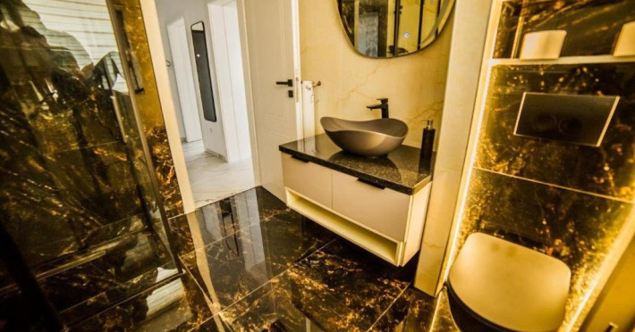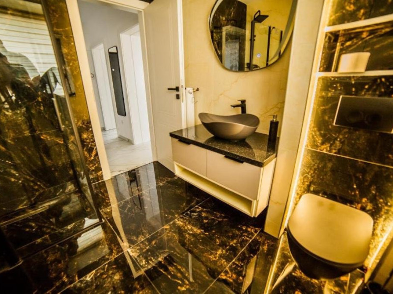 Baiaimpresioneaza prin designul sau elegant si dotarile de ultima generatie: cadafreestanding, wc, doua lavoare si o oglinda mare cu iluminare si sistem dedezaburire - un spatiu perfect pentru relaxare si rasfat.