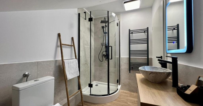 Baiamoderna cu dus, wc, lavoar si oglinda cu iluminare si sistem antiaburire oferatot confortul si produsele de igiena esentiale pentru un sejur lipsit de griji.