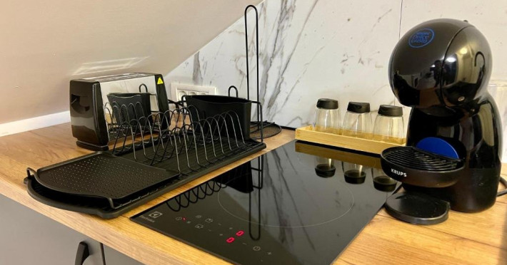 Bucatariacomplet mobilata si utilata iti ofera libertatea si confortul de acasa, fiindechipata cu masina de spalat vase, cuptor clasic si cuptor cu microunde,frigider, aparat de cafea, fierbator de ceai si toate ustensilele necesarepentru a putea gati preparate delicioase.