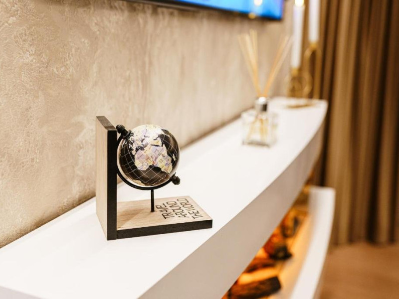 Livingulspatios si elegant completeaza atmosfera de lux, fiind dotat cu semineuelectric, canapea generoasa si comoda, fotolii si o masa de cafea din lemn denuc - locul perfect pentru seri linistite si conversatii placute. Atatdin living, cat si din dormitor, oaspetii se pot bucura de o privelistedeosebita asupra Salii Polivalente si a cartierului cochet si linistit, aflatla marginea padurii, unde este situat Prestige Apart Hotel Brasov.