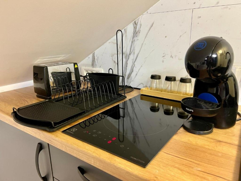 Chicinetaeste complet echipata cu frigider, plita electrica, fierbator de apa, aparat decafea si toate ustensilele necesare, iar zona de luat masa, amplasata langafereastra, te rasplateste cu o priveliste incantatoare in fiecare moment alzilei.