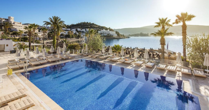 Piscina în aer liber de la Voyage Bodrum este înconjurată de palmieri şi umbrele de soare. De asemenea, oaspeţii pot comanda o băutură la barul de la piscină sau la barul de pe plajă.