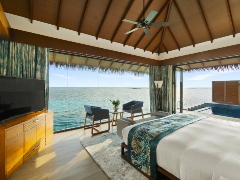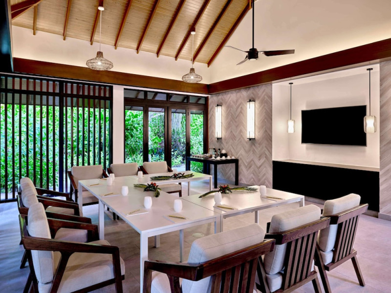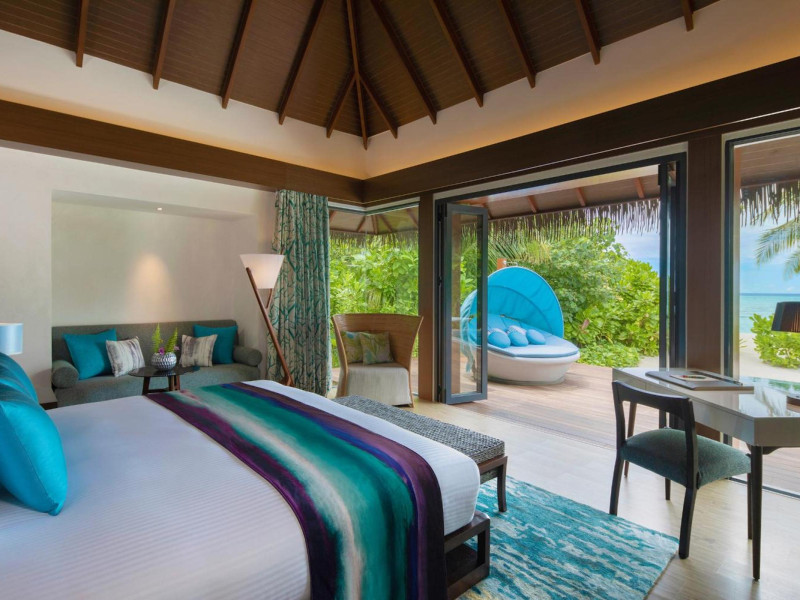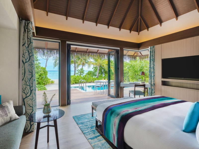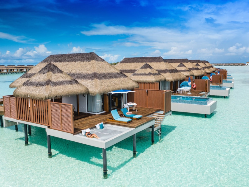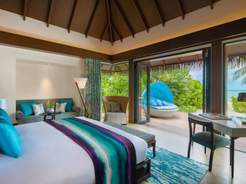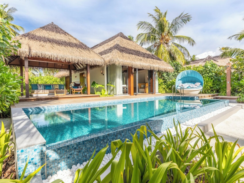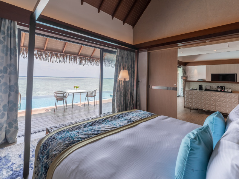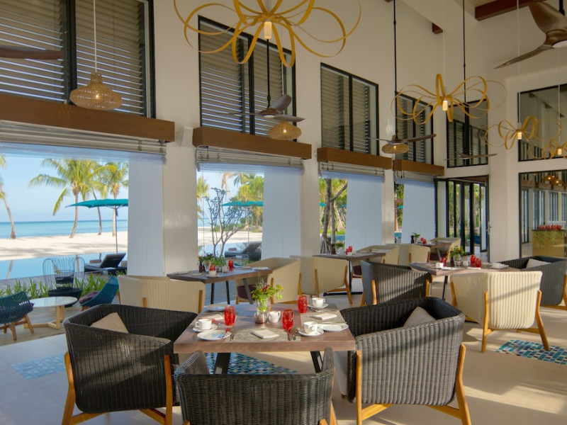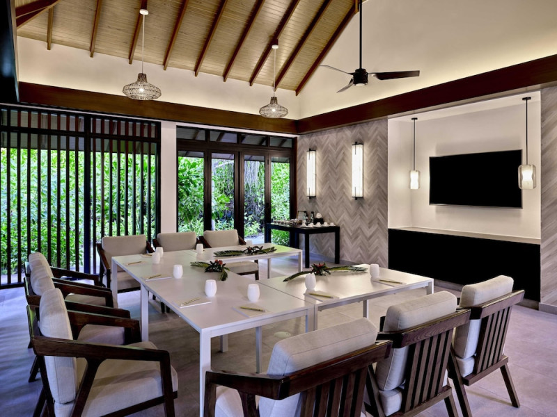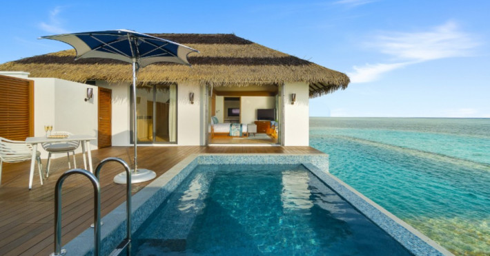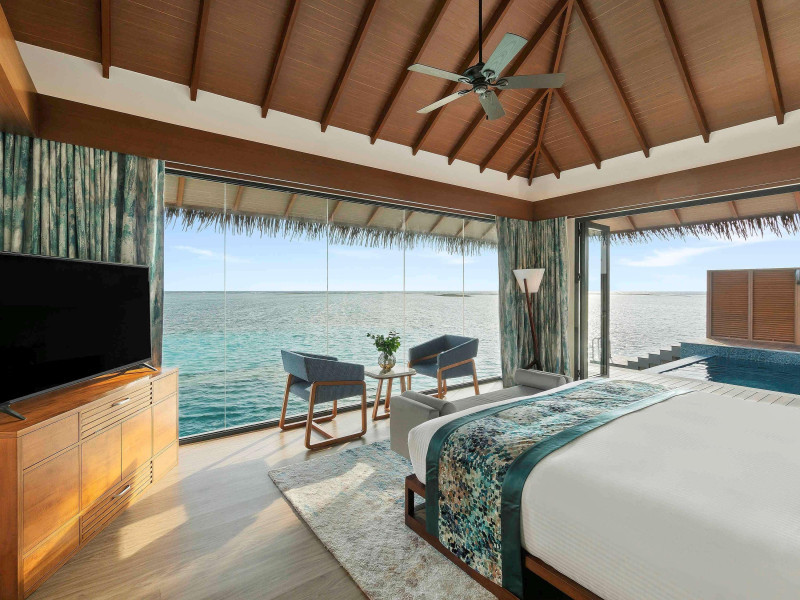 Escape to the Pullman Maldives Maamutaa, an all-inclusive five-star resort nestled on Maamutaa Island in the Gaafu Alifu atoll. This 18-hectare haven boasts 122 villas, each featuring a private furnished patio, indoor and outdoor showers, a 55-inch HD TV, Nespresso machine, USB port chargers, and a minibar replenished twice daily. Enjoy unlimited meals at three restaurants (including vegetarian options at Phat Chameleon and fine Italian dining at Souq Oven) and three bars, plus access to two poolside bars. The all-inclusive package also includes free non-motorized water activities. Amenities include three outdoor swimming pools, a private beach, a spa offering massages, body treatments, and facials, a fitness center, a business center, 24-hour room service, a 24-hour front desk, laundry facilities, complimentary Wi-Fi, and babysitting services (surcharge). The resort is near Hadahaa Beach and Kooddoo (GKK) airport. A range of activities are available, including diving, water sports, karaoke, golf, tennis, and beach volleyball. The Pullman Maldives Maamutaa is a hotel.