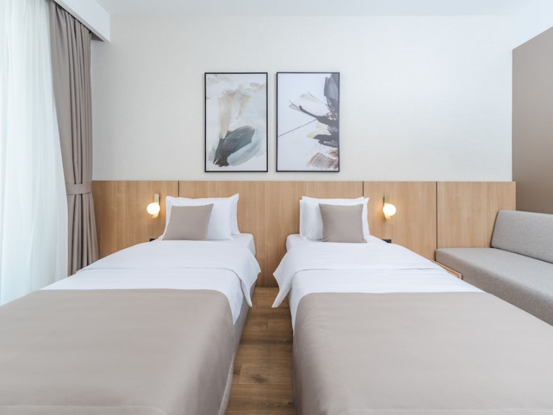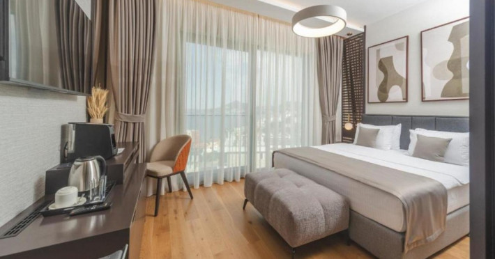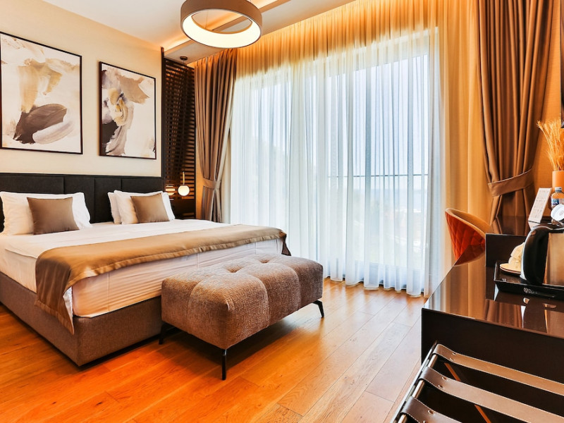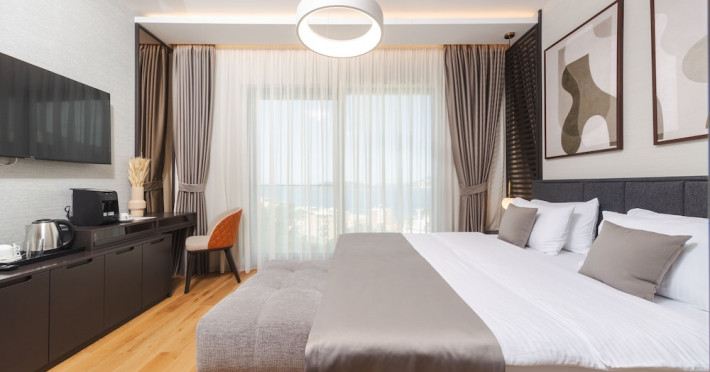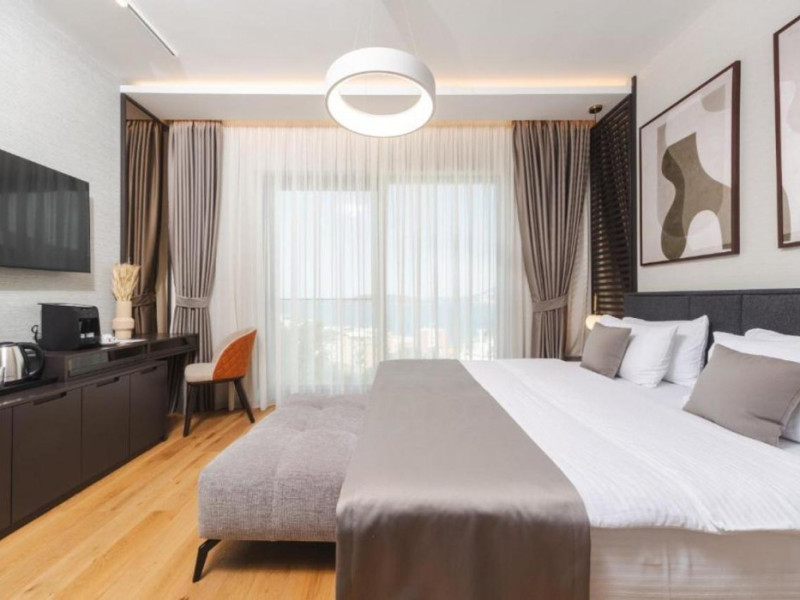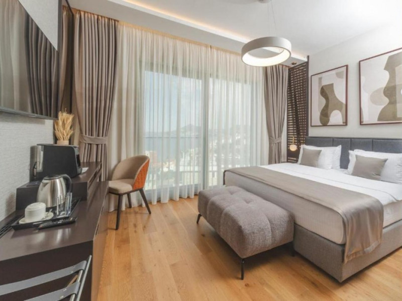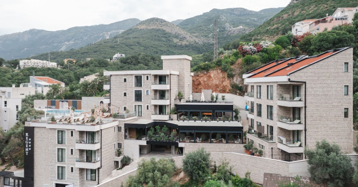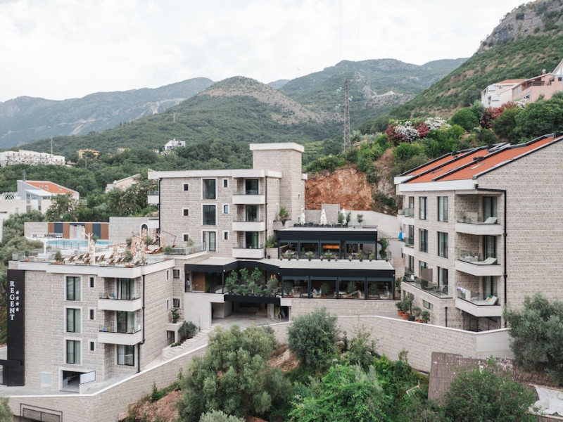 Discover Regent Resort Budva, a modern 4-star resort located in Miločer, near St. Stefan on the Montenegrin coast. Przno Beach is a short walk away. The resort offers a seasonal outdoor pool, complimentary wireless internet access, concierge services, a banquet hall, a restaurant, and a bar/lounge. Guests can enjoy 24-hour room service and a complimentary buffet breakfast daily from 7:00 AM to 10:00 AM. Featured amenities include dry cleaning/laundry services, a 24-hour front desk, and luggage storage. Self-parking is available onsite (subject to charges). The air-conditioned rooms feature kitchenettes, 49-inch Smart televisions with cable programming, complimentary wireless internet access, and safes. Housekeeping is provided daily.