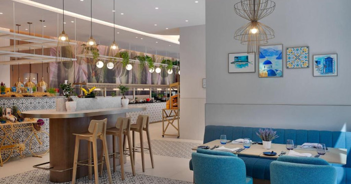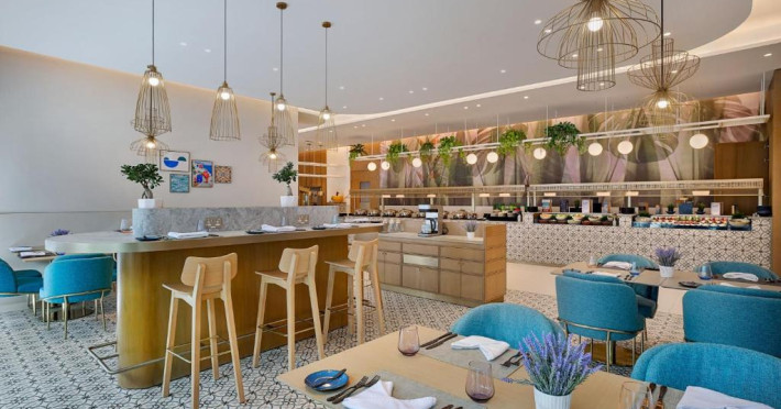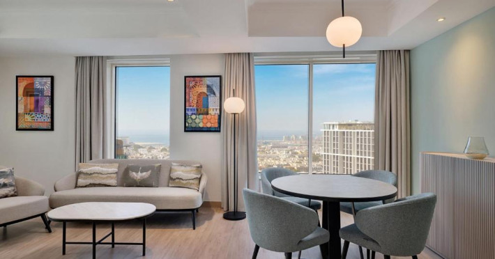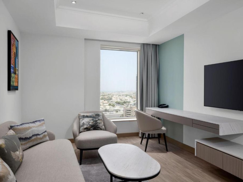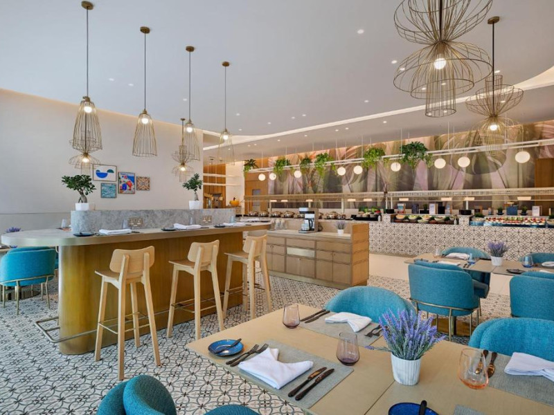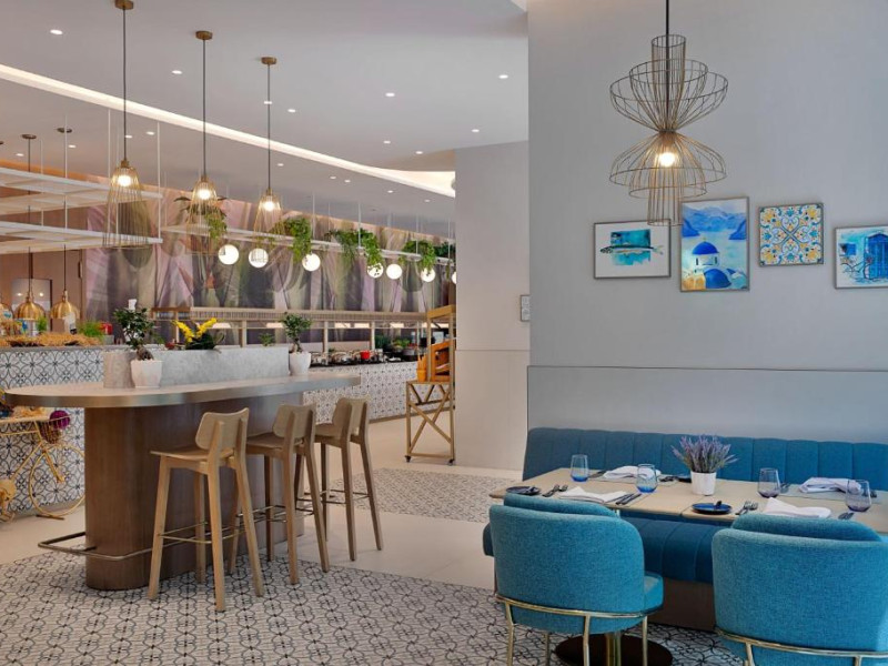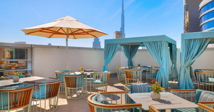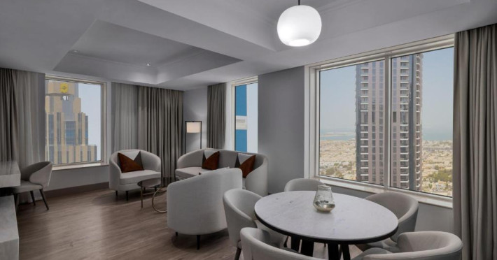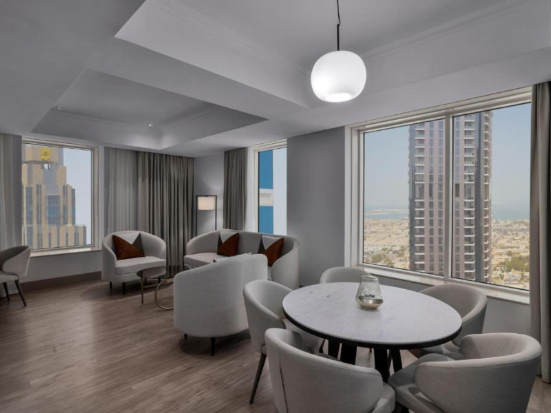 Situat la etajul 43, Restaurantul Panorama oferă vedere neintreruptă la Marea Arabiei și un meniu internațional variat. Delicatesele levantine autentice pot fi savurate la restaurantul libanez Tal Al Amar. Shisha este disponibilă in lounge-ul de pe acoperiș.