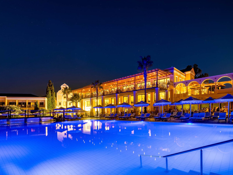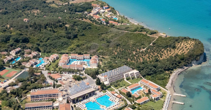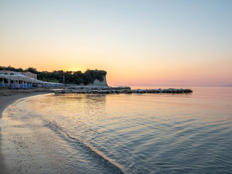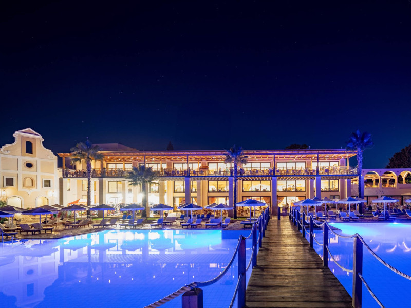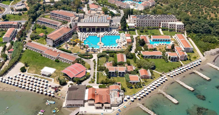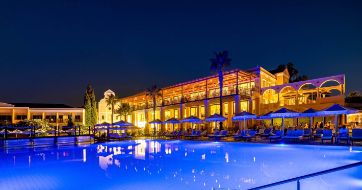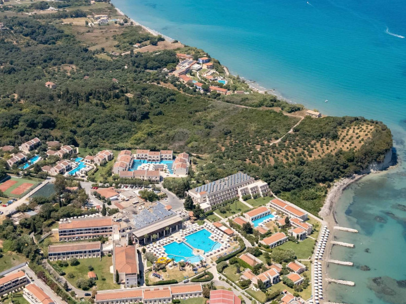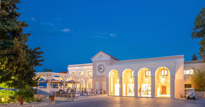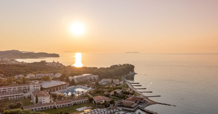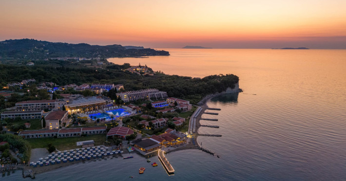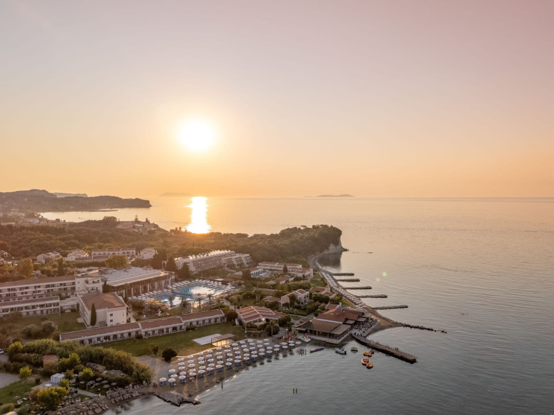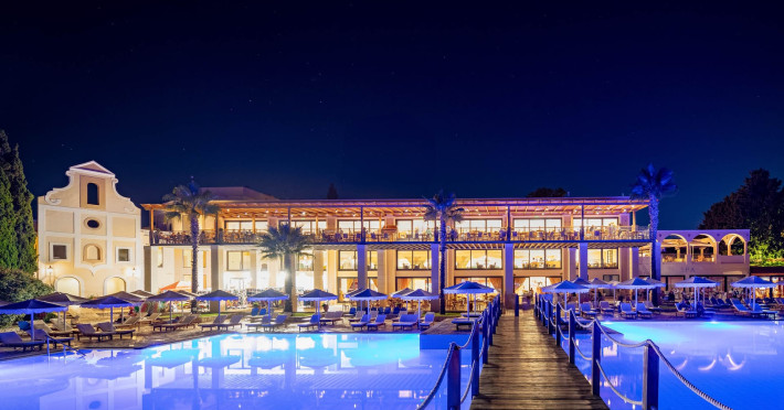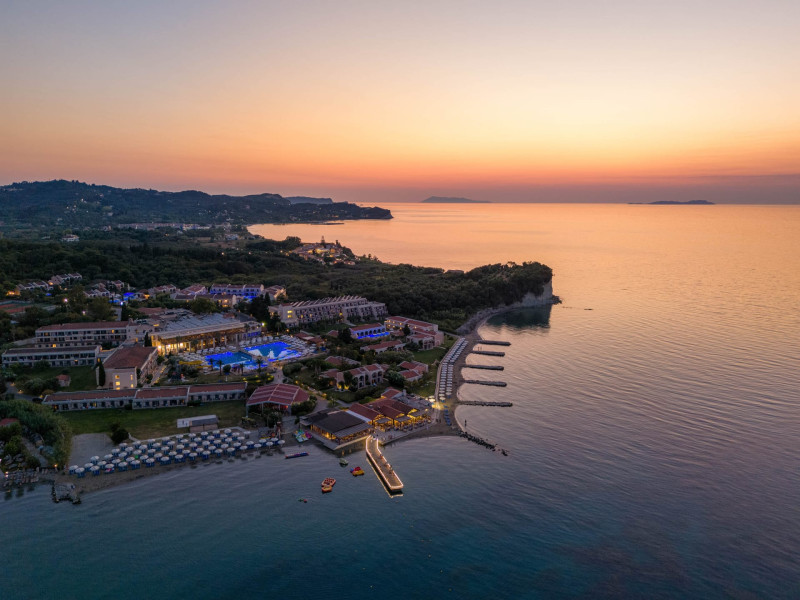 The 5-star Roda Beach Resort is located 500 metres from Roda Village, at the north-eastern coast of Corfu. Spread out into 25 acres of beautiful gardens, it reaches its own sandy beach and the turquoise of the Ionian Sea.The resort has 6 outdoor swimming pools with sea water, all with free sun-lounging facilities. The warmly decorated rooms are in the main building or scattered across the beautiful gardens. They all have individually controlled air-conditioning and heating, mini fridge, satellite TV and a balcony or terrace with sea or garden view. The all-inclusive Roda Beach Resort offers 4 restaurants and 5 bars. The main restaurant serves an American breakfast buffet and rich buffets for lunch and dinner with local and international cuisine. Guests can also choose to dine at the Italian, Asian and Greek A la carte-restaurants (reservation requirement).The Roda Beach Resort & Spa offers an indoor swimming pool and a variety of facial and body treatments. The wealth of sports facilities offered, includes, outdoor fitness area fully equipped, mini golf, tennis, beach volley, canoe and pedal boat. Two children’s pools with water slides are also available, as well as a mini club for our young guestsRoda Beach is 36 km from Corfu Town, Corfu airport and port. Free guest parking is available on site.
