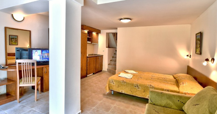 MAISONETTE: Suprafata aproximativa 40 mp. O parte dintre vile suntamplasate in jurul unei mici piscine private (fara salvamar), iar celelalte inimediata apropiere. La parter se afla un dormitor spatios, o canapeaextensibila si o chicineta utilata (fierbator, frigider, plita, hota, vesela),aer conditionat si TV. La nivelul intermediar se afla o baie spatioasa cutoaleta. Etajul superior are doua paturi single, un fotoliu extensibil si aerconditionat (fara TV). Terasa mare cu mobilier. Capacitate maxima: 4 adulti si2 copii.
