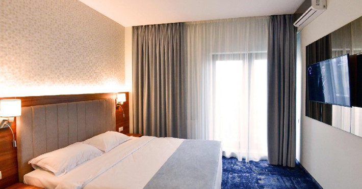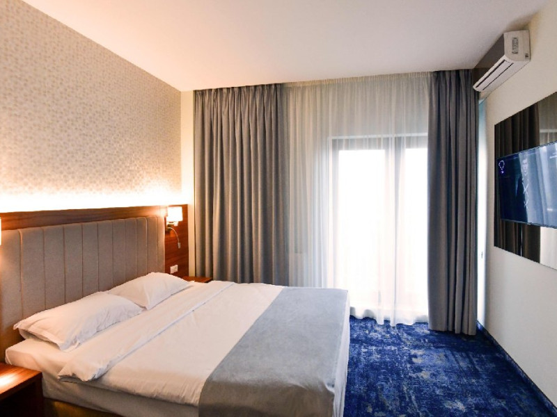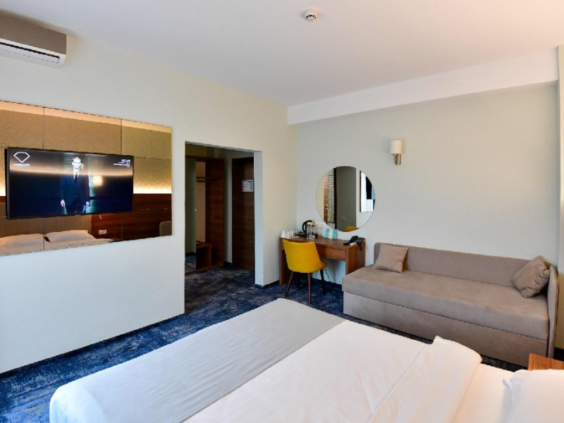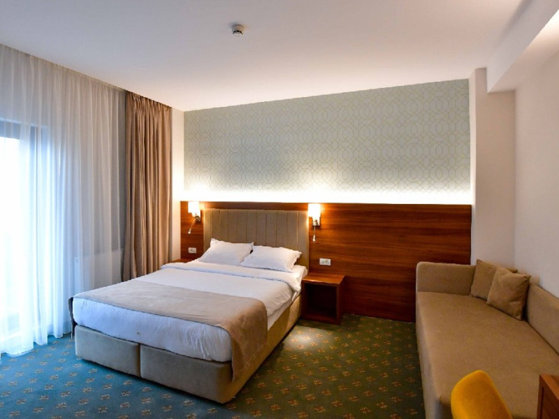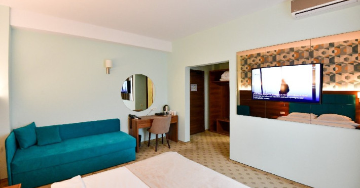 Camera dubla, cu o suprafata de 20 mp, detine un pat dublu extra-large, balcon cu vedere la curtea interioara, baie cu dus, articole de toaleta, TV, AC, internet, minibar, seif, uscator de par. Poate acomoda 2 adulti sau 2 adulti +1 copil ( 0-11.99 ani) Camera tripla, cu o suprafata de 25 mp, detine un pat extra-large si canapea fixa de o persoana, balcon cu vedere la curtea interioara, baie cu dus, articole de toaleta, TV, AC, internet, minibar, seif, uscator de par. Poate acomoda 2 adulti + 2 copii ( primul copil cu varsta de 0-11.99 ani, iar al doilea copil de orice varsta) sau 3 adulti + 1 copil ( 0-11.99 ani).