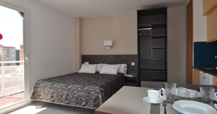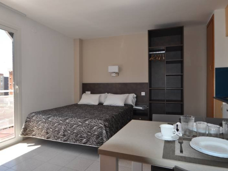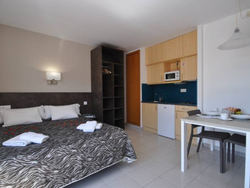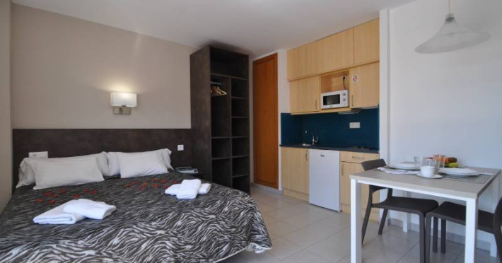 Dotari camere: cele 60 de apartamente si studiouri, proaspat renovate, au o suprafata intre 22 -38 mp, in care se pot caza maim 5 persoane. Toate sunt dotate cu chicineta, baie, aer conditionat si internet, televizor. - Facilitati hotel: Aparthotelul dispune de restaurant, bar, piscina (deschis intre orele 8-20) , sezlonguri; receptie 24 de ore, schimb valutar, serviciu de rent a car, birou de turism.