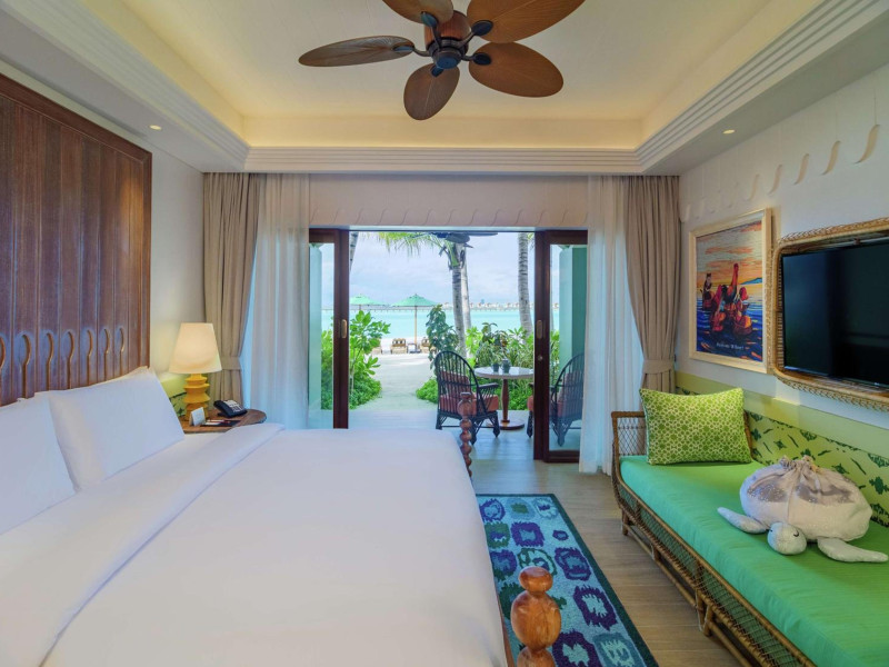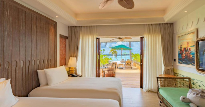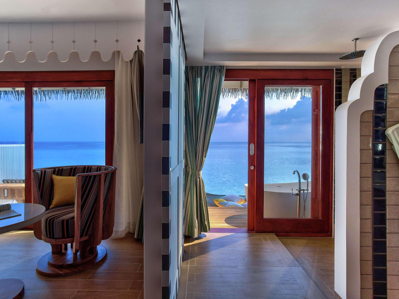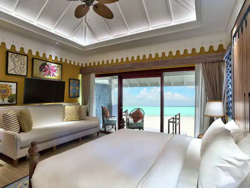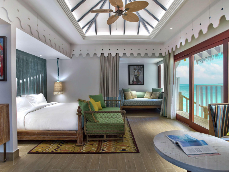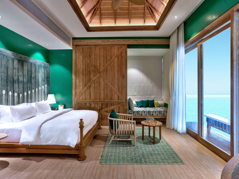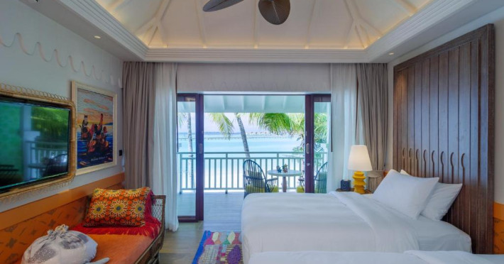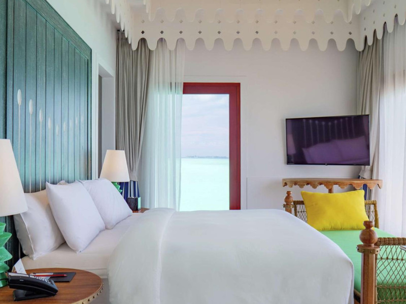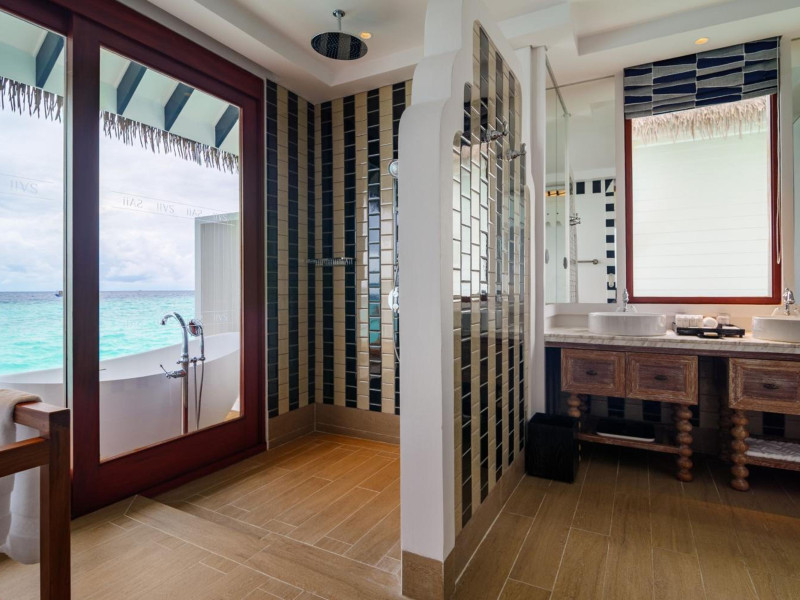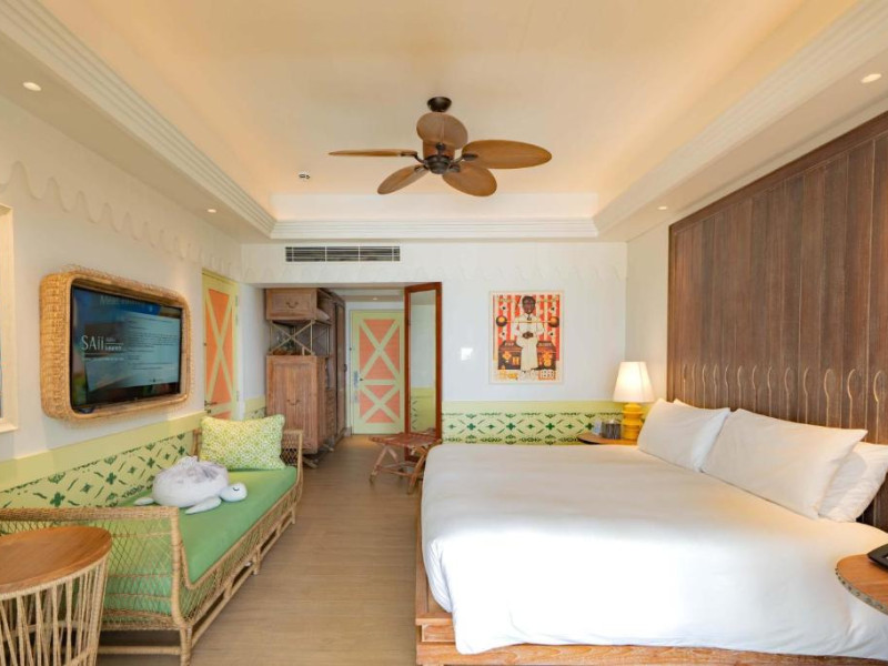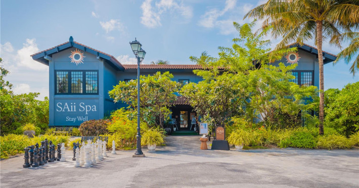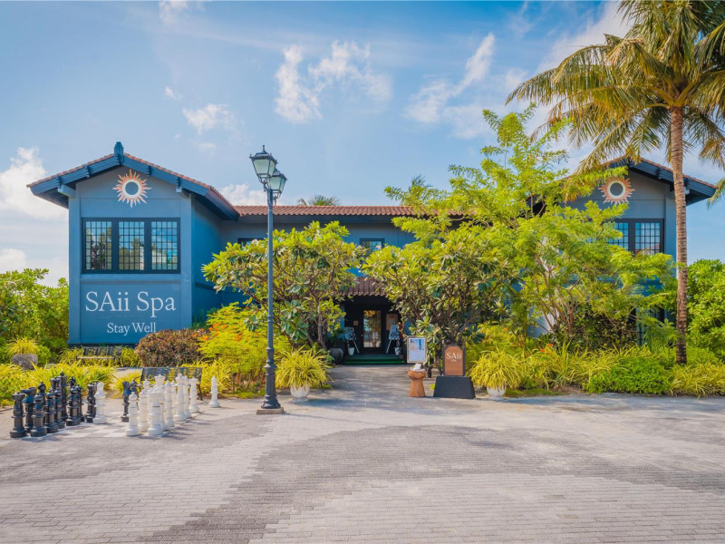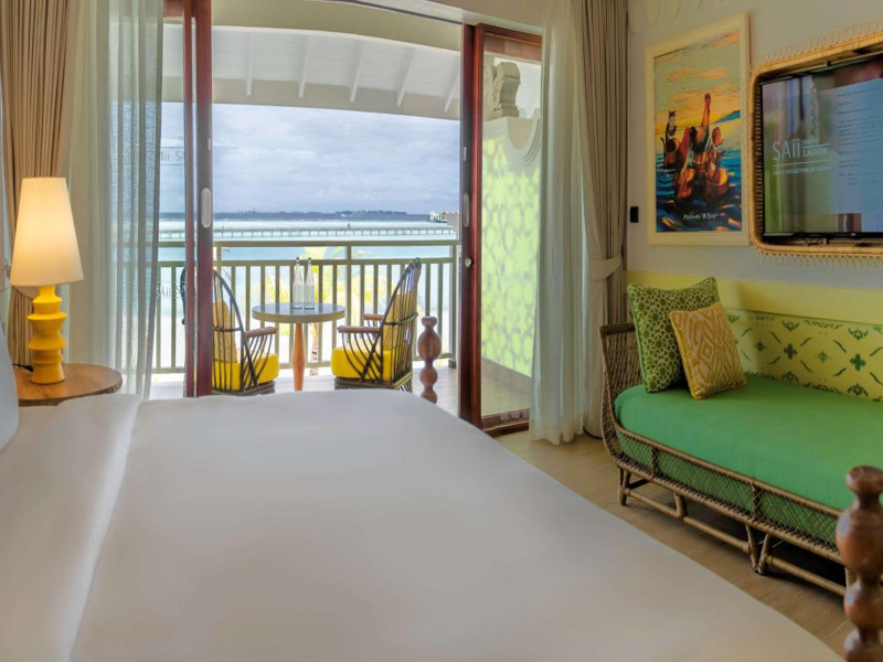 SAii Lagoon Maldives, Curio Collection by Hilton, is a luxurious beachfront resort located in Emboodhoo Lagoon, a 15-minute speedboat ride from Velana International Airport (MLE). The resort offers various room types, including rooms with ocean views, beach villas, and overwater villas (some with private pools). All rooms feature boho-chic decor, natural textures, free Wi-Fi, HDTV, complimentary tea and coffee, a large bathroom with a waterfall shower, and a furnished balcony or deck. Dining options include Miss Olive Oyl (Mediterranean seafood), Mr. Tomyam (Thai fusion), bean/Co (coffee and tea), and Café del Mar (gourmet breakfast). Resort amenities include an infinity pool, a 24-hour fitness center, a full-service spa, a business center, concierge services, babysitting (surcharge), and bicycle rentals. All-inclusive rates are available. The resort also offers proximity to CROSSROADS Island, providing access to shopping, dining, and entertainment. The resort has approximately 3509 square feet of event space. The SAii Lagoon Maldives, Curio Collection by Hilton is a hotel.