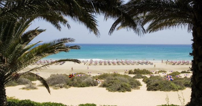 Plaja Long Costa Calma cu nisip fin si intrare treptata in mare chiar langa hotel