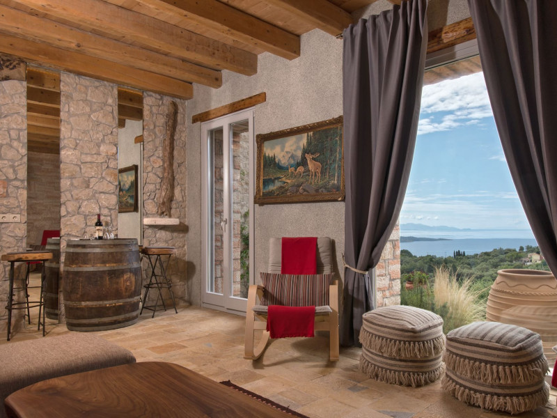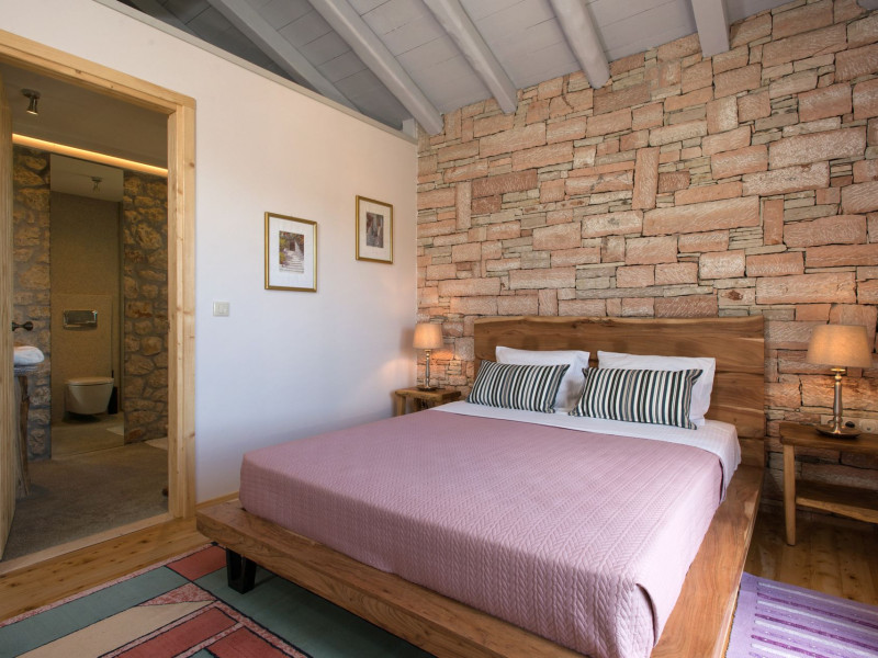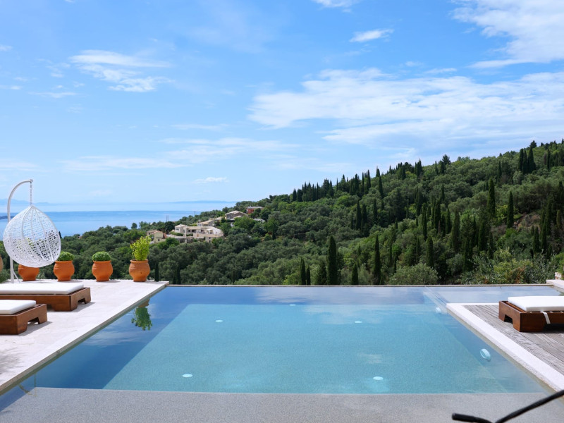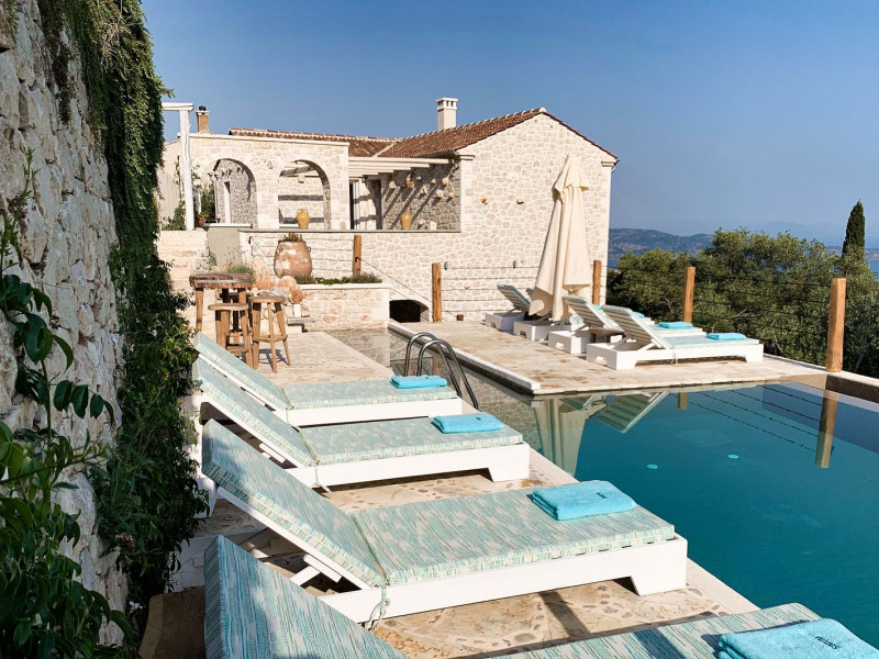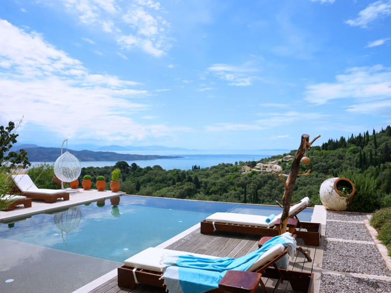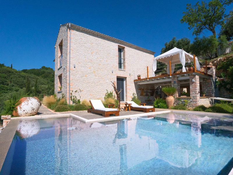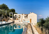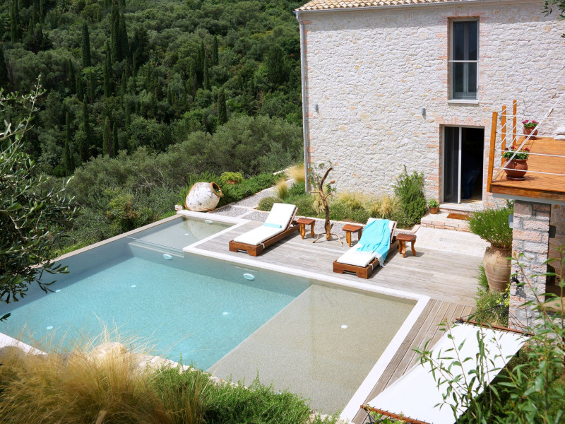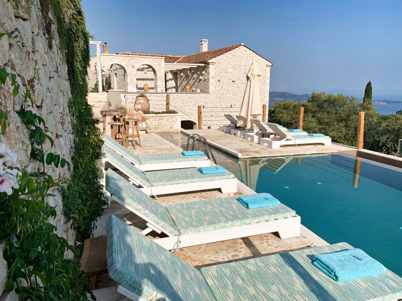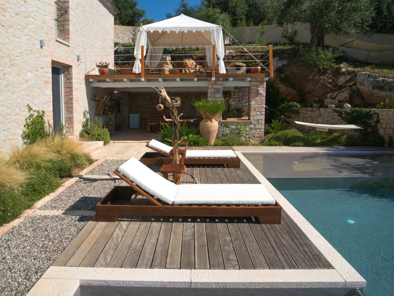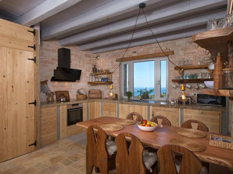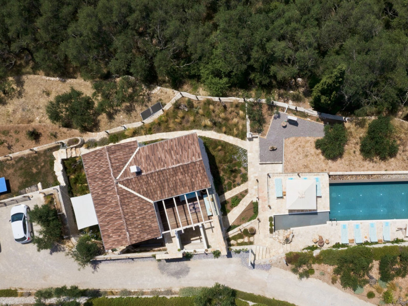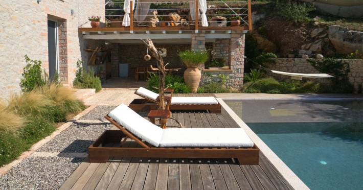 Sinium Luxury Villa is built on the cliffside and its infinity pool is overlooking the NE bays, the sea and the opposite mountainside. Surrounded by wild nature, the combination of wood and stone (both local) in its architecture make you feel that the villa had been there for ages. Unique decoration with both furniture and details hand crafted. Amplet space both inside and outside, a very cute uppper pool deck with stunning sea views and an infinity pool and main deck for absolute relaxation.Its architectural style and the fact that almost everything (both furniture and details) in the property are hand crafted, makes it even more unique. The tranquillity, views, amazing nature and energy of the place will make you feel like you belong from the very first day. This is the main difference to any other luxury villa, its "warmth".DescriptionThe villa comprises of 2 floors. 3 bedrooms and 2 bathrooms on the upper floor (2 of them with stunning views from the bed). Living room and hand crafted kitchen both with amazing views and another bathroom downstairs. The exterior features well tended garden with flowers, strawberries and herbs! Wonderful stone built terraces and corridors, fantastic lighting both inside and outside, a built BBQ with outdoor dining table for 6 guests (shaded), main and upper pool decks (both furnished and extensive), your homey infinity pool with amazing views and parking space for at least 2 cars. Everything has been carefully thought out and you will feel like home from the very first moment.Cleaning/Towels/Linen/Maid serviceMaid service and linen laundry provided twice a week (additional days on request).