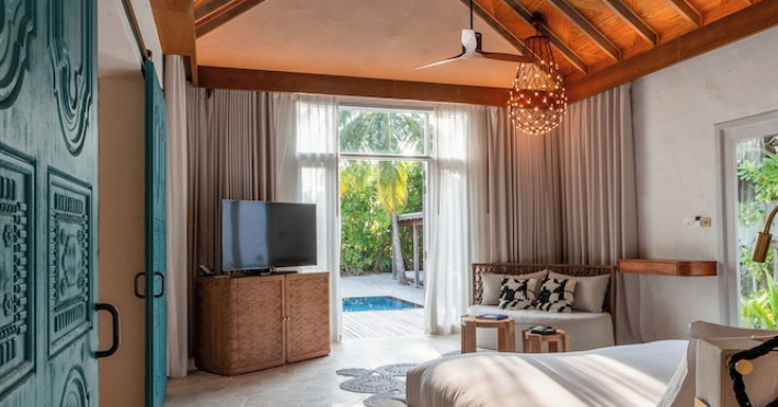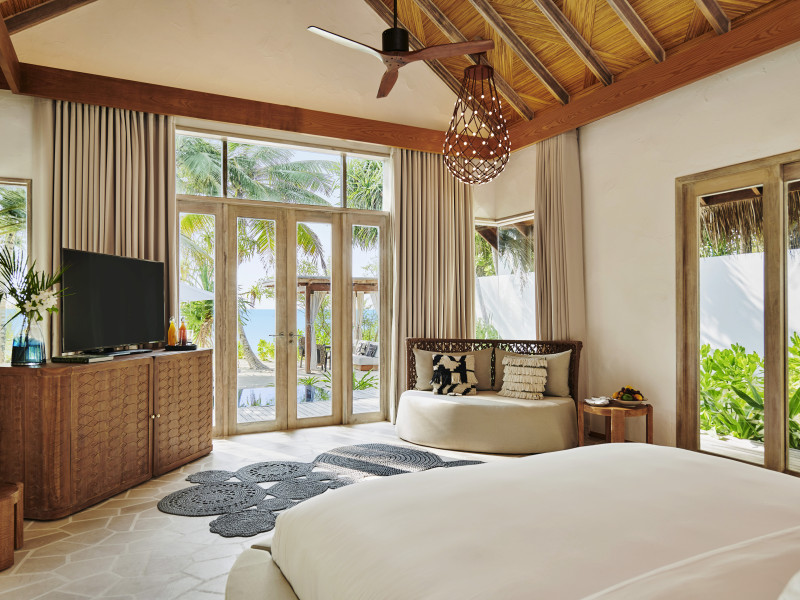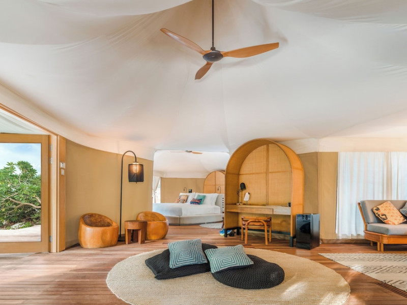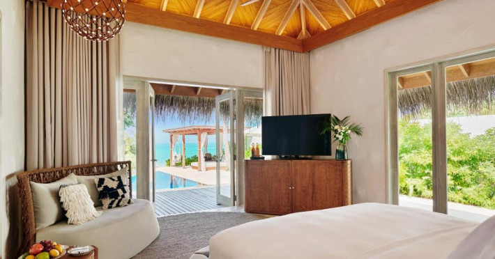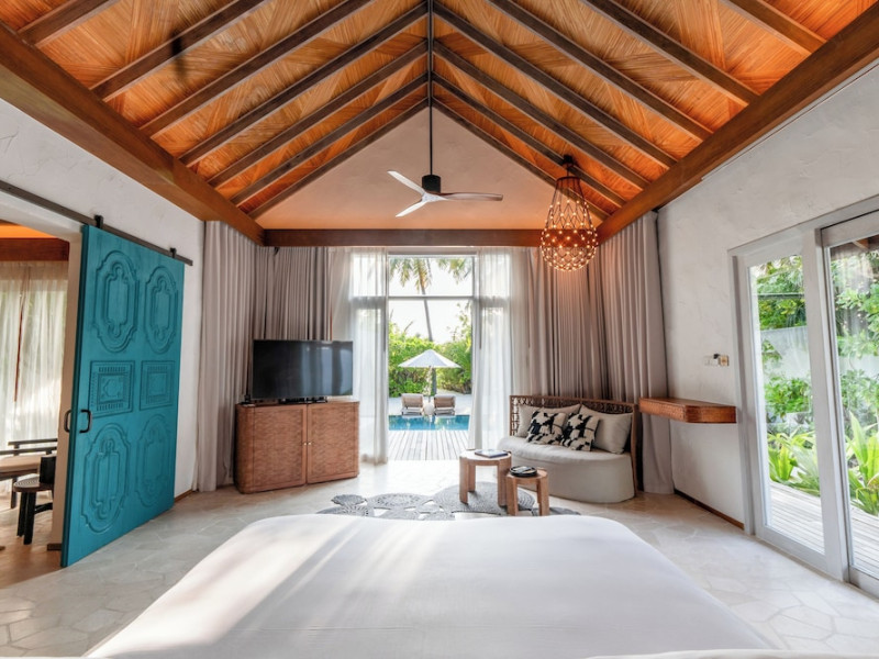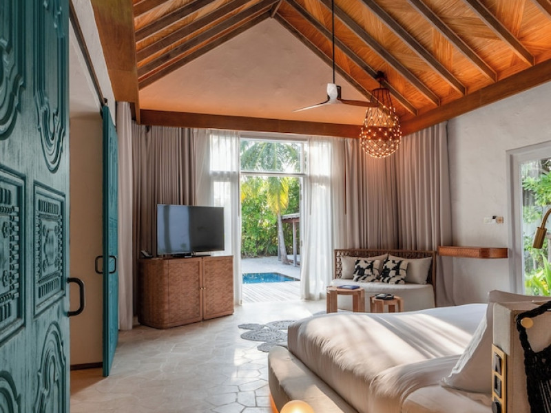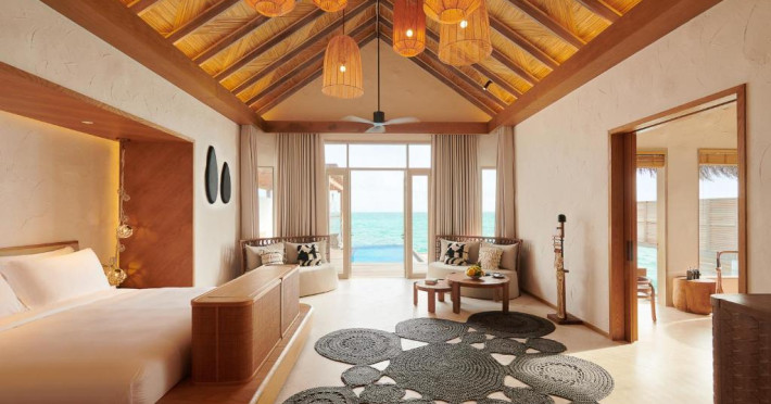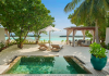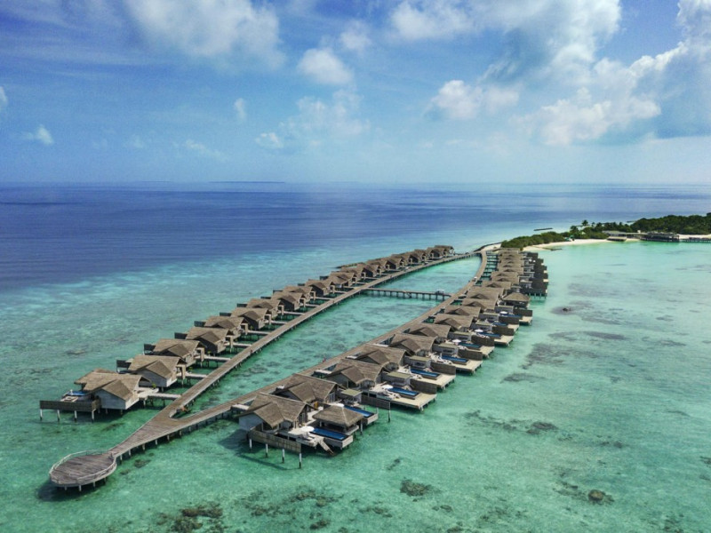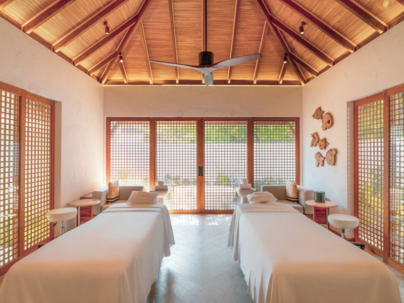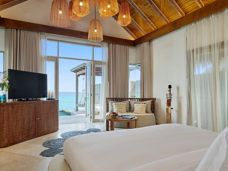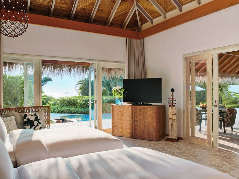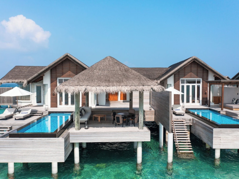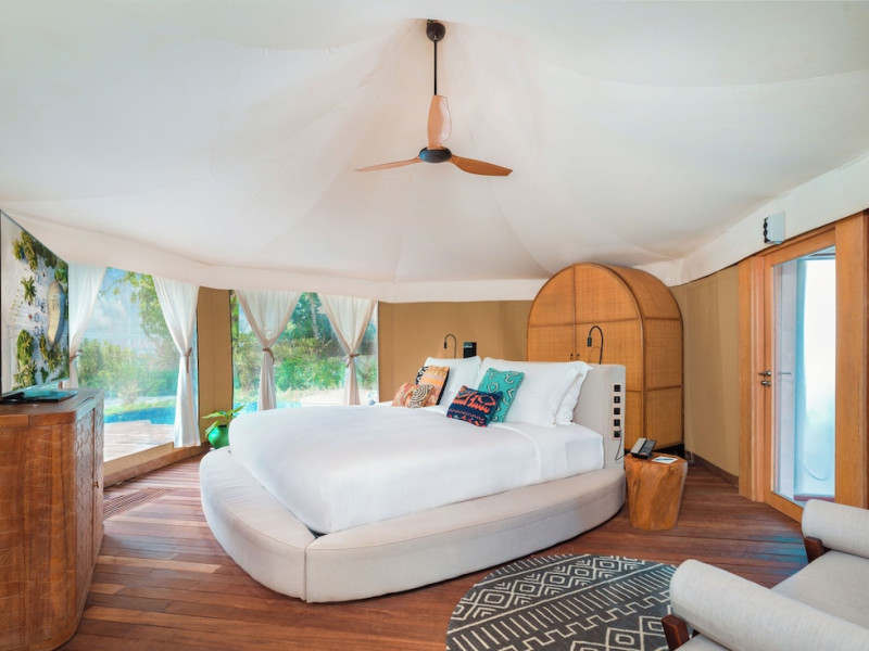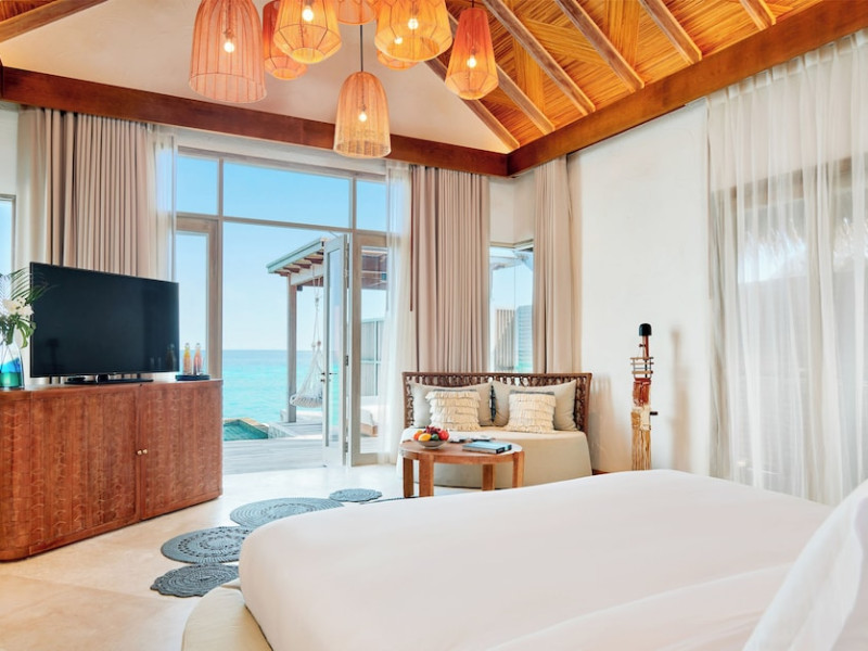 Sirru Fen Fushi Private Lagoon, meaning "Secret Water Island," is a 120-villa luxury resort in Shaviyani Atoll, approximately 230 km north of Malé. This 16-hectare island boasts one of the Maldives' largest lagoons and features a unique underwater sculpture park by Jason deCaires Taylor and a 9km house reef. The resort offers all-inclusive rates (some exclusions apply), three restaurants (including Raha, serving international cuisine), room service (limited hours), a bar/lounge, beach bar, and poolside bar. Amenities include four outdoor pools, five hot tubs, a private beach, a spa, complimentary Wi-Fi, concierge services, babysitting (surcharge), a business center, and complimentary newspapers. Guestrooms feature private plunge pools, flat-screen TVs, private balconies or patios, and private bathrooms with separate bathtubs and showers. Transfer is via a 55-minute seaplane ride from Malé, or via domestic flight to Hanimaadhoo Airport. The preferred airport is Velana Intl. Airport (MLE). The Sirru Fen Fushi Private Lagoon Resort is a hotel.
