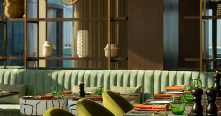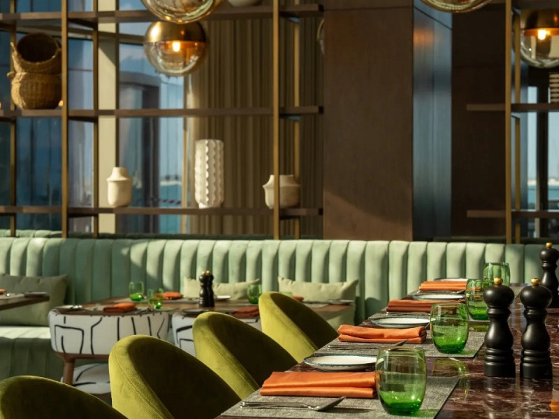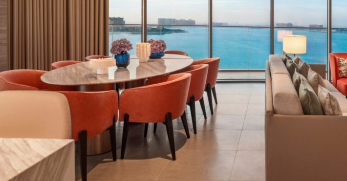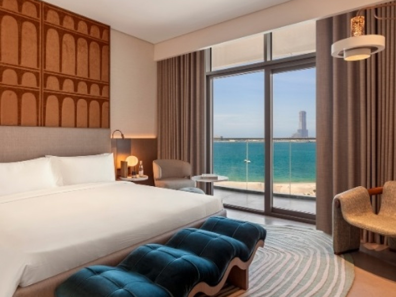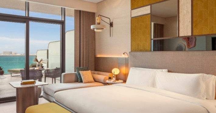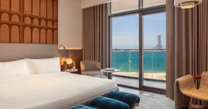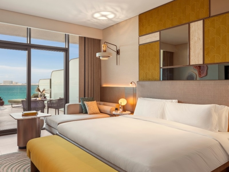 Hotelul este amplasat direct pe malul Golfului Arab, oferind acces la plajă, precum și vederi spectaculoase spre mare de la aproape toate camerele. Această locație, combinată cu decorul inspirat de natură — cu nuanțe ce amintesc de apus, mare și desert — creează o atmosferă de relaxare și eleganță.