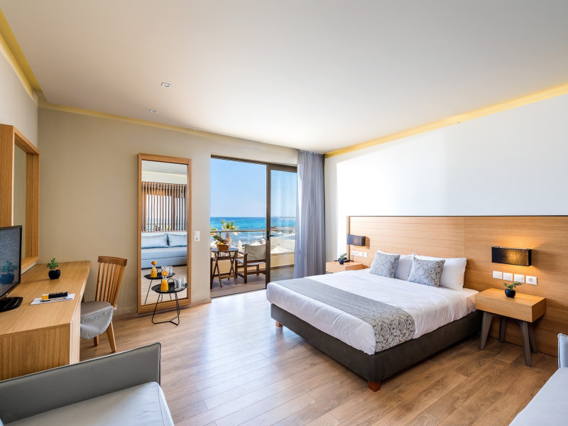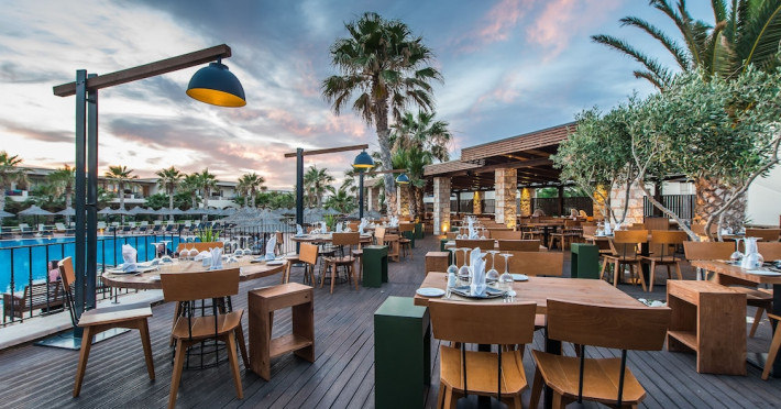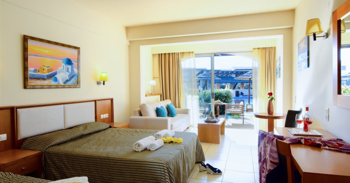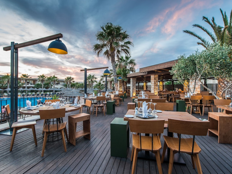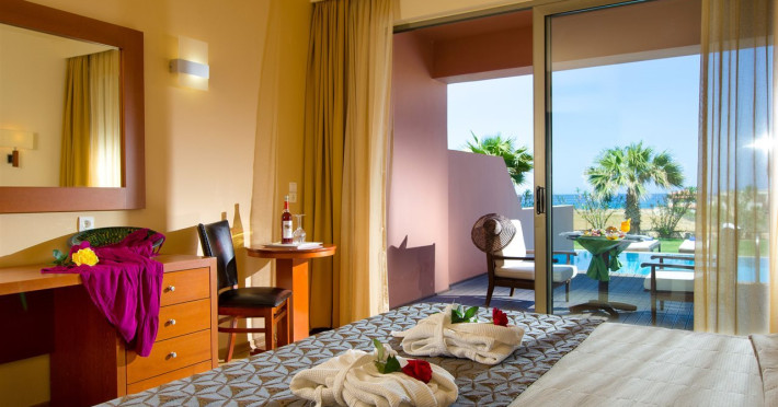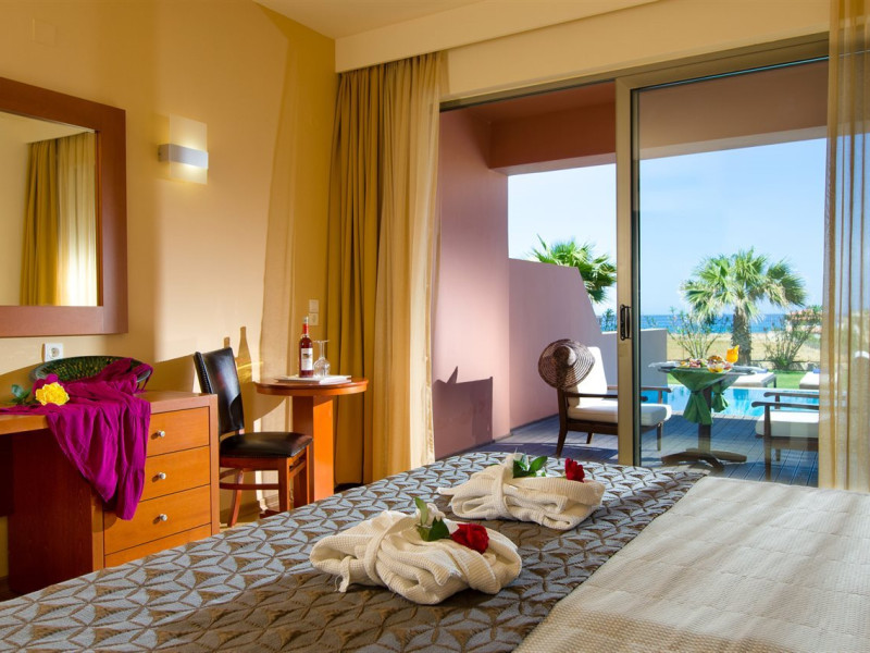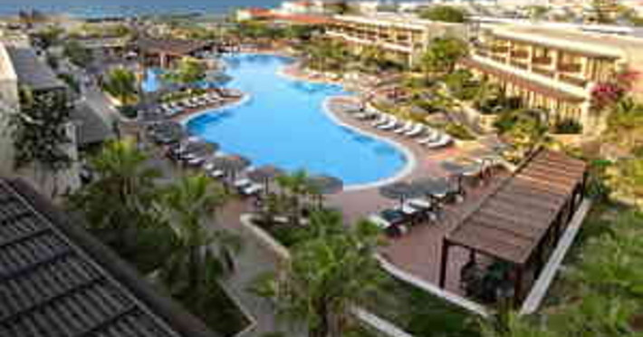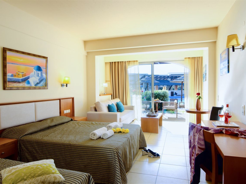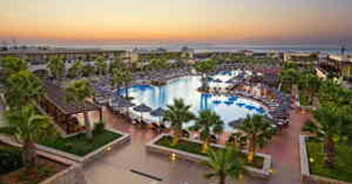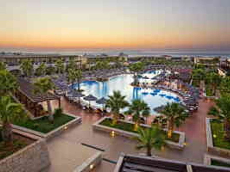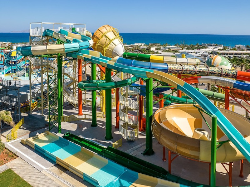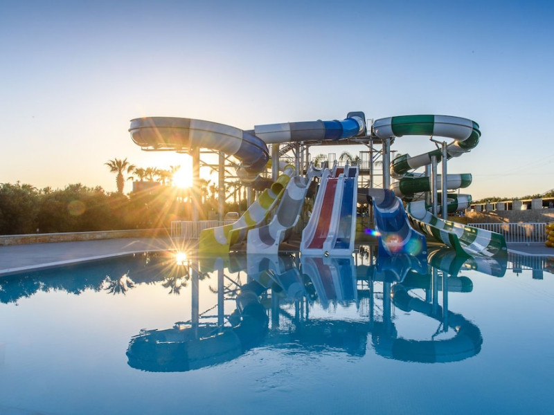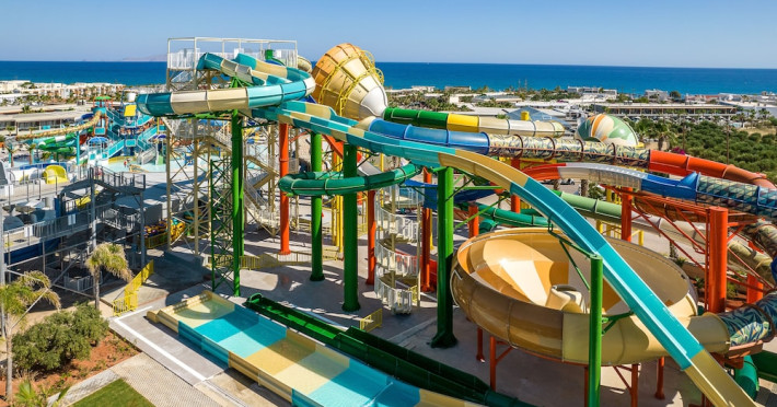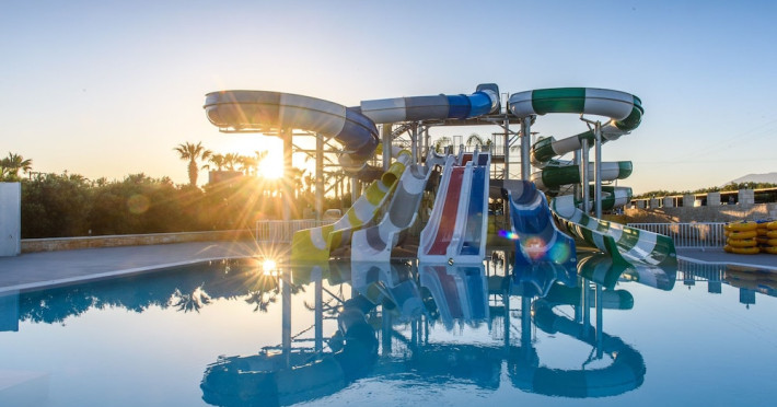Facilities and services include a 24-hour reception, concierge service, elevator, late check-out (upon availability with extra charge), internet corner, Wi-Fi in all areas (free), mini market, jewelry shop, souvenir shop, boutique, luggage room, 2 swimming pools (10:00-19:00), pool/beach towels (free), sunbeds & umbrellas (free at the pool & the beach), outdoor shower, waterpark (10:00-18:00, free of charge: with aqua tube, tunnel body ride, speed slide, multi racer slide, black hole slide, rafting slide & aqualand, spray area), sitting terrace, garden, amphitheater, parking, chapel/church, transfer service (extra charge), doctor on call (extra charge), restaurant, Baby cot (on request, free of charge), All accommodation units provide as standard the following:individual air-conditioning (free), Wi-Fi (free), direct-dial telephone (extra charge), safety deposit box (free), TV (satellite & music channels), fridge, bathtub/WC or shower/WC, hairdryer, bathroom amenities, wake-up service, maid service (daily), towel change (3 times per week), linen change (3 times per week), room service (extra charge), laundry service (extra charge).In case of choosing the option of "all inclusive":The all-inclusive concept includes all meals (breakfast, lunch, dinner, and snacks) and mealtime drinks such as soft drinks, beer, wine, water, and alcoholic drinks, all of local brands. Drinks are served from morning until late evening (approx. until 22.00-24.00 hrs.). Opening times vary between different hotels. In certain hotels the activities program is also included.**Children's Facilities:Baby cot (on request, free of charge), highchair (on request), babysitting service (on request with extra charge), mini club (ages 4-12 years, 6 times.**Wellness (extra charge):Spa center with sauna, hammam, jacuzzi, manicure & pedicure, body & facial treatments, physical therapies, aromatherapy, acupuncture, fitness room, and indoor pool (08:00-19:00).Pet Policy: Only dogs up to 3 kg are allowed (on request).**Accepted Credit/Debit Card:Visa, MasterCard, American Express, Diners Club, UnionPayPlease note: The waterpark is located approx. 200 m from the hotel.Please note: The operation of certain services & facilities is subject to weather conditions.Address: Analipsis, Hersonissos, 70014 Crete, Hersonissos, Greece