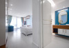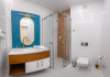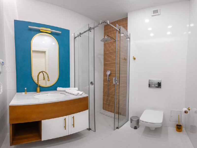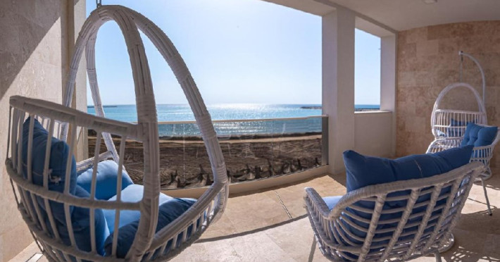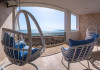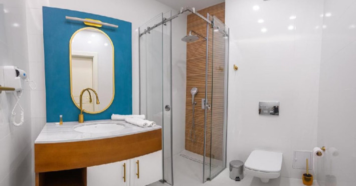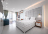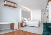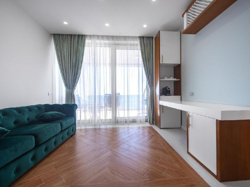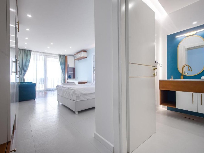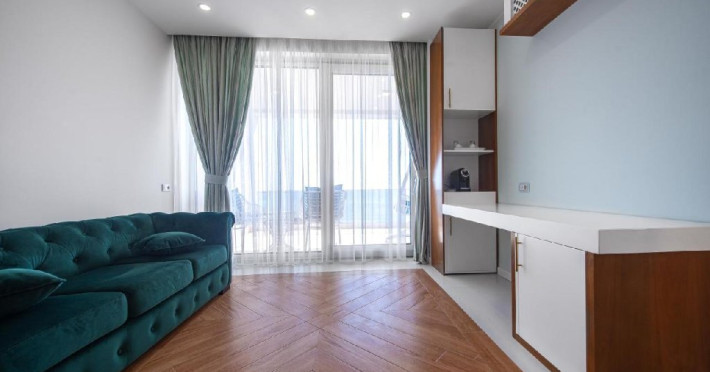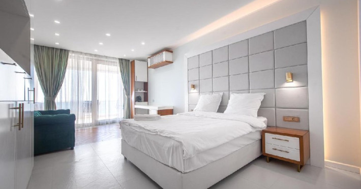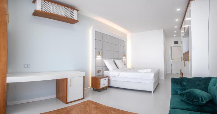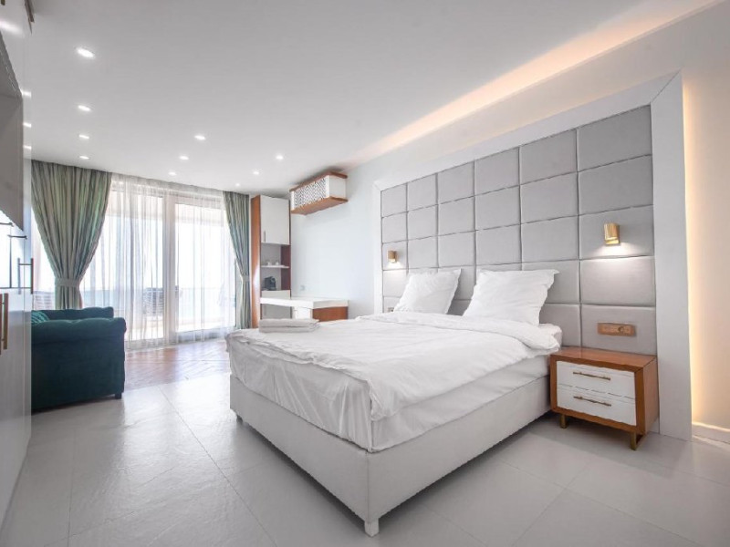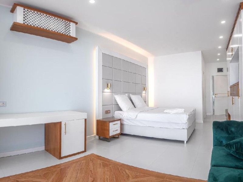 Dotari camere: Camerele duble deluxe au pat matrimonial (160x200) si o canapea extensibila si dispun de aparat de cafea, LCD tv, wi fi, aer conditionat, minibar, plase de tantari, baie cu cabina de dus, uscator de par si cosmetice hoteliere, balcon. Ofera vedere la mare. Suprafata 33 mp. Apartamentul deluxe se compune din living cu canapea extensibila, un dormitor matrimonial (160x200), hol, 2 bai cu cabina de dus, uscator de par si cosmetice hoteliere si balcon. Este dotat cu aparat de cafea, LCD tv, wi fi, aer conditionat, minibar, plase de tantari. Aer conditionat si Tv exista in amble camere, iar dormitorul dispune de usa. Vedere la mare. Suprafata 46 mp.