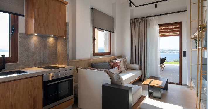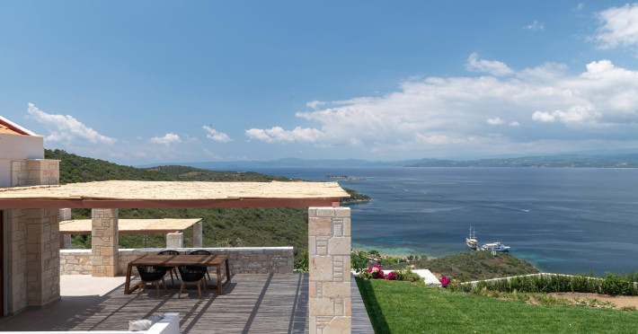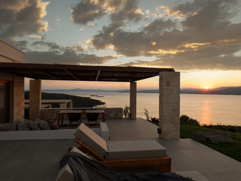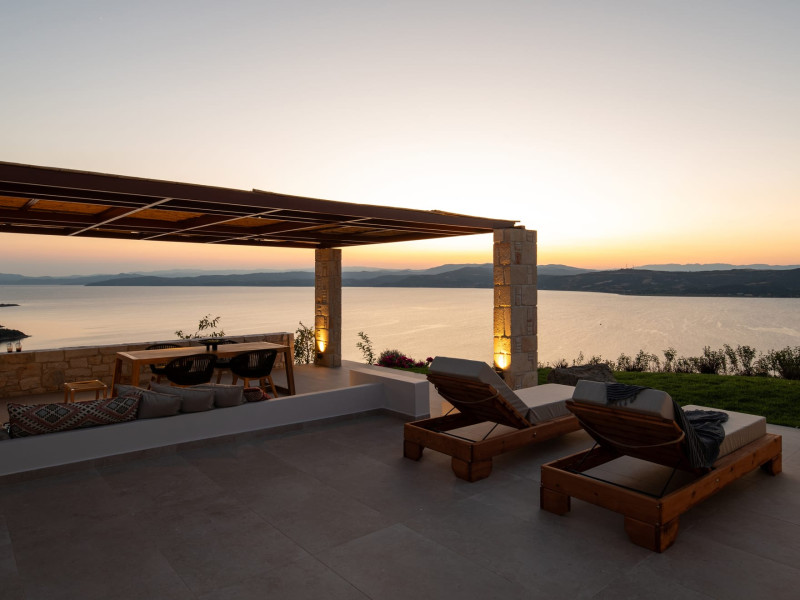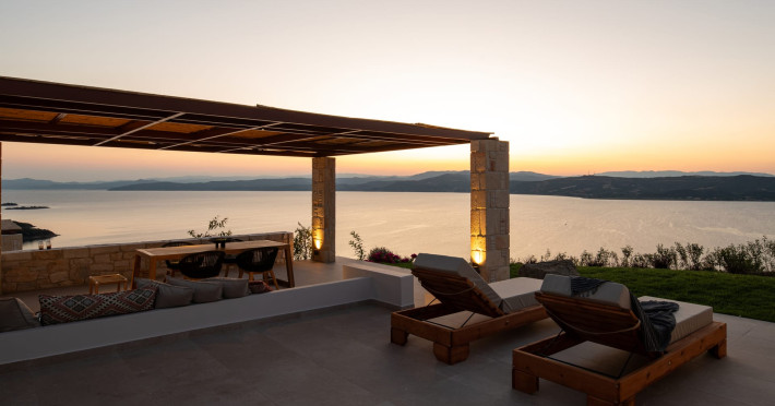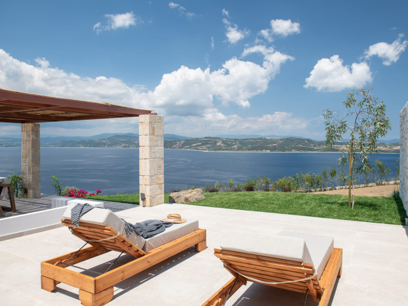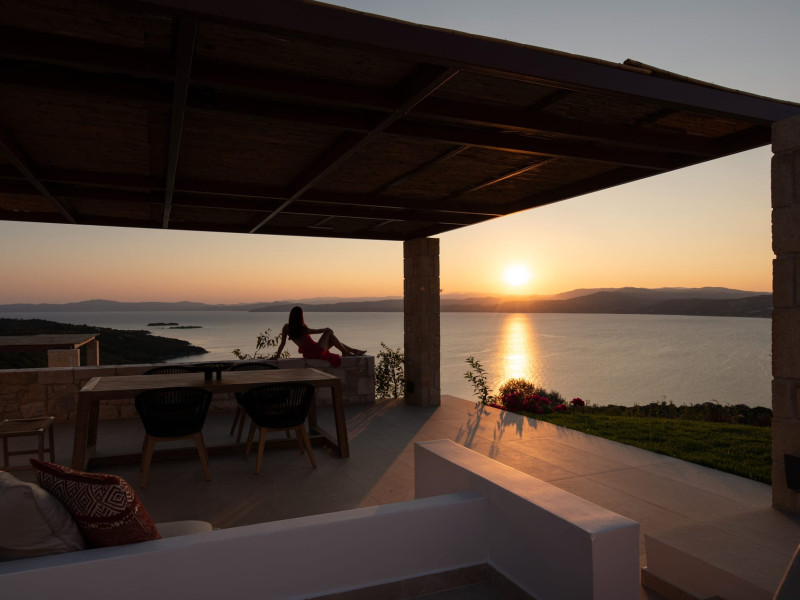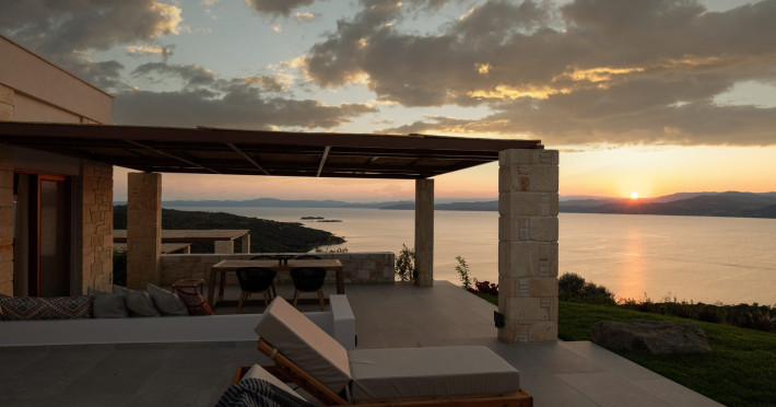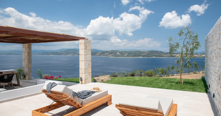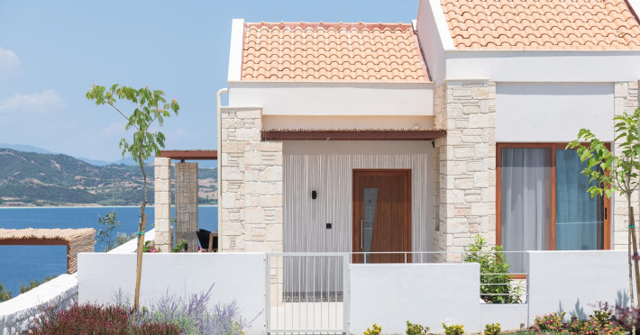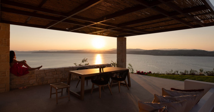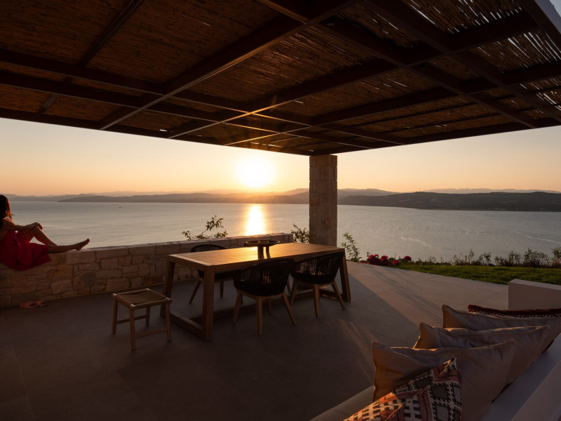The Sunrise team is growing and welcomes you with 4 new villas, at Sunrise Villas in the area Trygona, with an amazing view of the sea and the spot with the most perfect sunset on the island. We are located on the beautiful island of Ammouliani in Halkidiki, just 500 meters from the settlement and port, 500 meters from banana beach and 400 meters from Elia coast. Where the villas are built, the green hill, embraces the blue sea and the tranquility and the view offered by this combination, are ideal for your most peaceful and enjoyable vacation. Sunrise Villas is the ideal destination for families and couples who prefer privacy in an atmosphere of harmony, peace and calmness. Each villa is self-contained with private parking. It has a bedroom with a King Size bed, a fully equipped kitchen, a living room with a sofa that becomes a bed and has direct access to the garden and the terrace with an unobstructed view of the sea. It has air conditioning in all areas and a flat TV in the bedroom and living room. Our villas are designed for complete comfort in order to offer a relaxing atmosphere and peace. They are fully equipped and include: Bedroom, bathroom, kitchen with all the needed amenities, living room, large terrace with garden and a magnificent view of the Sigitikos gulf and the island of Ammouliani.